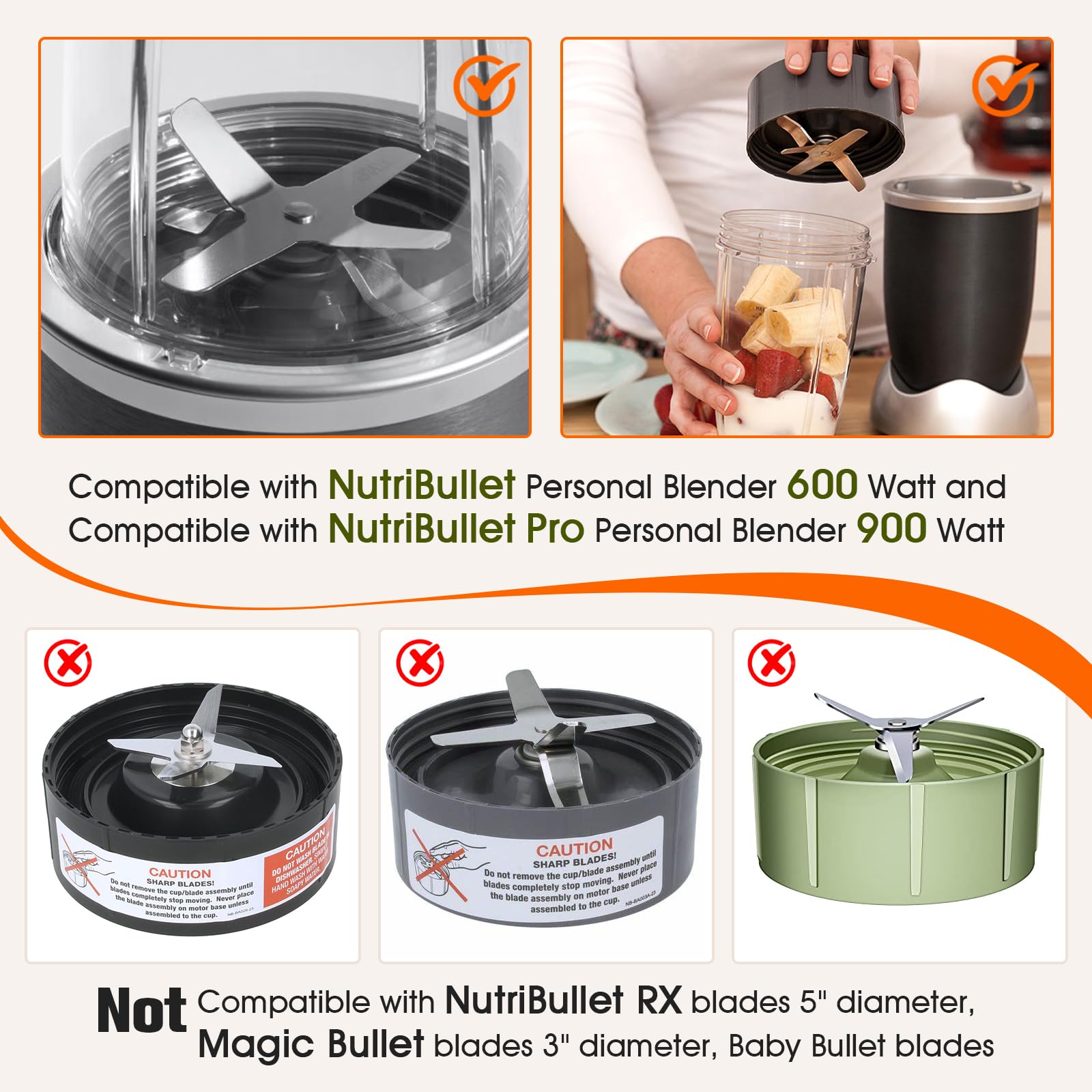 > [COMPATIBLE and NOT COMPATIBLE]: Compatible with NutriBullet Personal Blender 600 Watt and Compatible with NutriBullet Pro Personal Blender 900 Watt. Not Compatible with NutriBullet RX blades 5" diameter, Magic Bullet blades 3" diameter, Baby Bullet blades