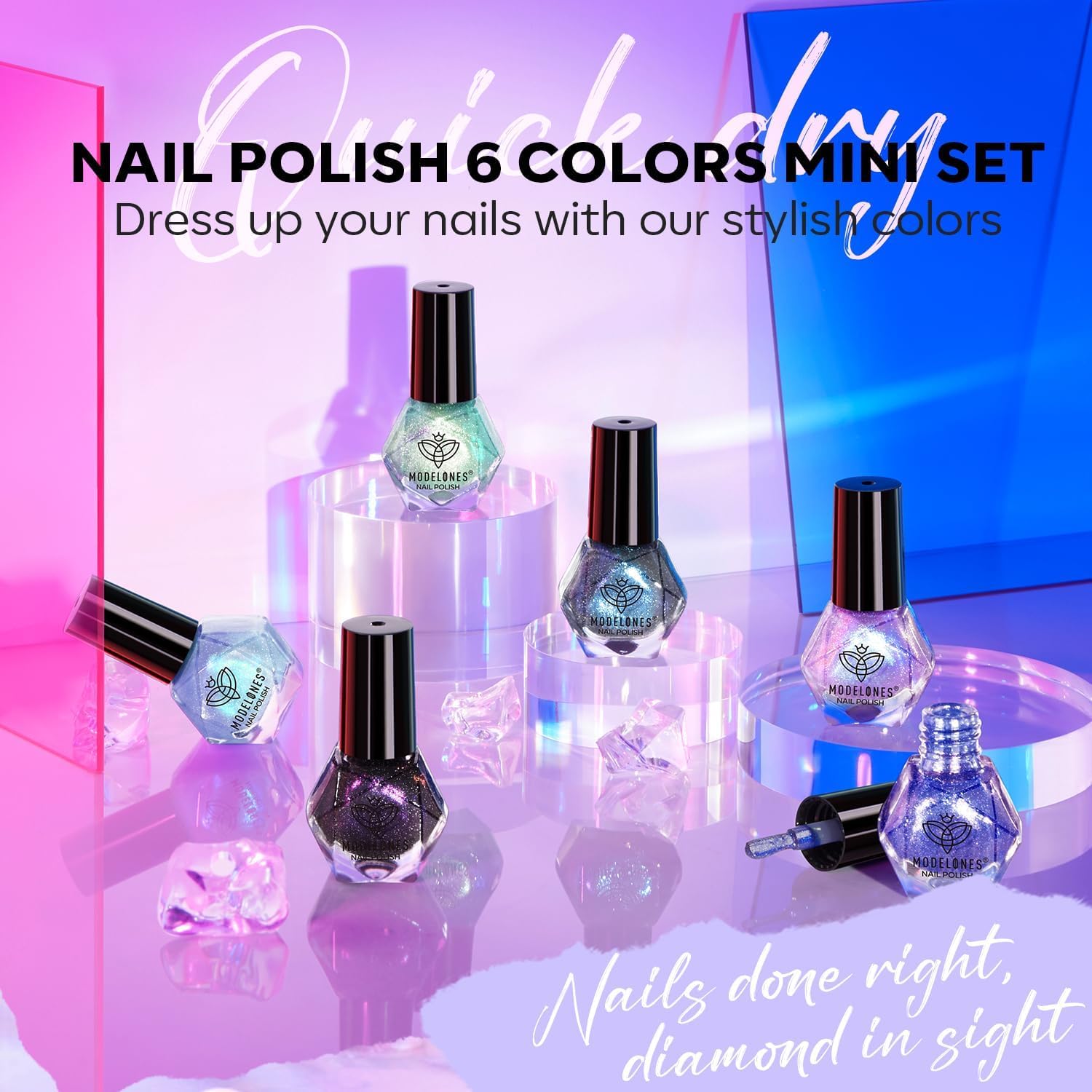 Long-Lasting & Chip-Free - Equipped with a 150Β° wide brush, our polish fits your nails perfectly for easy, complete coverage. The 5ml small size of each shade, paired with 6 vibrant colors, is perfect for beginners to experiment without waste. For even longer-lasting effects, pair with modelones base and top coat products. Achieve salon-quality manicures at home in just three steps