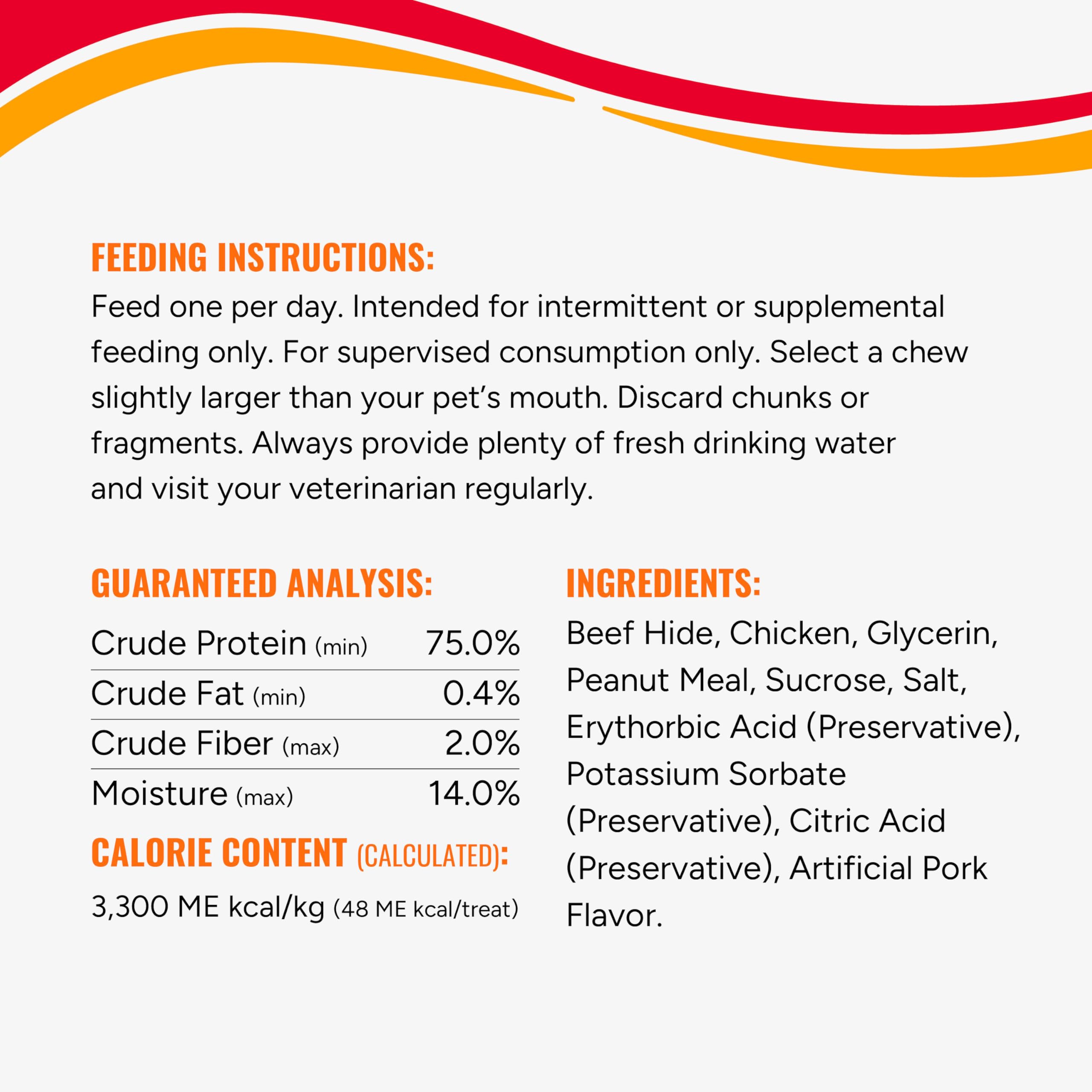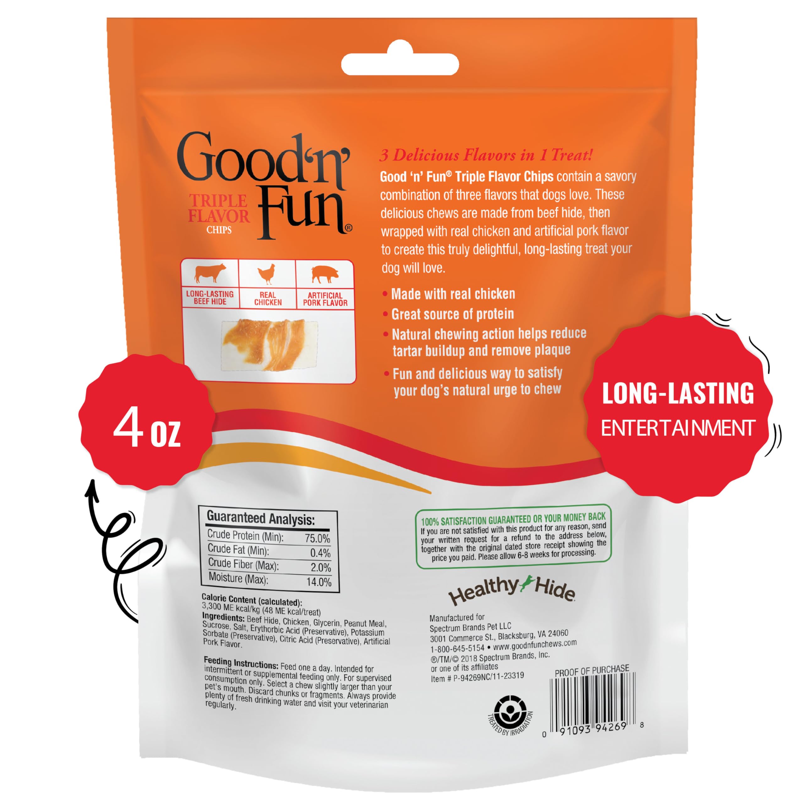 Good ‘n’ Fun brand offers a tasty smorgasbord of flavors that dogs love. These delicious chews are made from the finest ingredients, including real beef hide and real chicken, to create truly delightful, long-lasting treats your dog will love.Entertain your dog with goodness. Good ‘n’ Fun Triple Flavor Chips contain a savory combination of three flavors dogs love. These delicious chews are made from long-lasting beef hide, then wrapped with real chicken and artificial pork flavor to create this truly delightful, long-lasting treat your dog will love. Made with real chicken, these chews are a great source of protein for dogs of all sizes. Good ‘n’ Fun Triple Flavor Chips are a fun and delicious way to satisfy your dog’s natural urge to chew, while the natural chewing action helps reduce tartar buildup and remove plaque.Good ‘n’ Fun brand has a variety of chews for any size dog. Choose a chew slightly larger than your pet’s mouth. Discard any fragments or chunks to prevent choking. Always provide plenty of fresh drinking water, and visit your veterinarian regularly. These chips are an appropriate snack to give all dogs.Good ‘n’ Fun products come with a money-back guarantee if you’re not satisfied with your purchase for any reason – see product packaging for details.