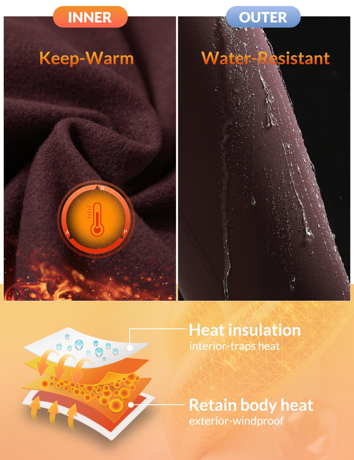 Material: The brushed fleece interior locks in heat for a dry warmth, while the stretchy fabric delivers you unrestricted movement. And with the inner leg seam removed, you'll be able to move freely and comfortably. Perfect for cold weather under 40°F.