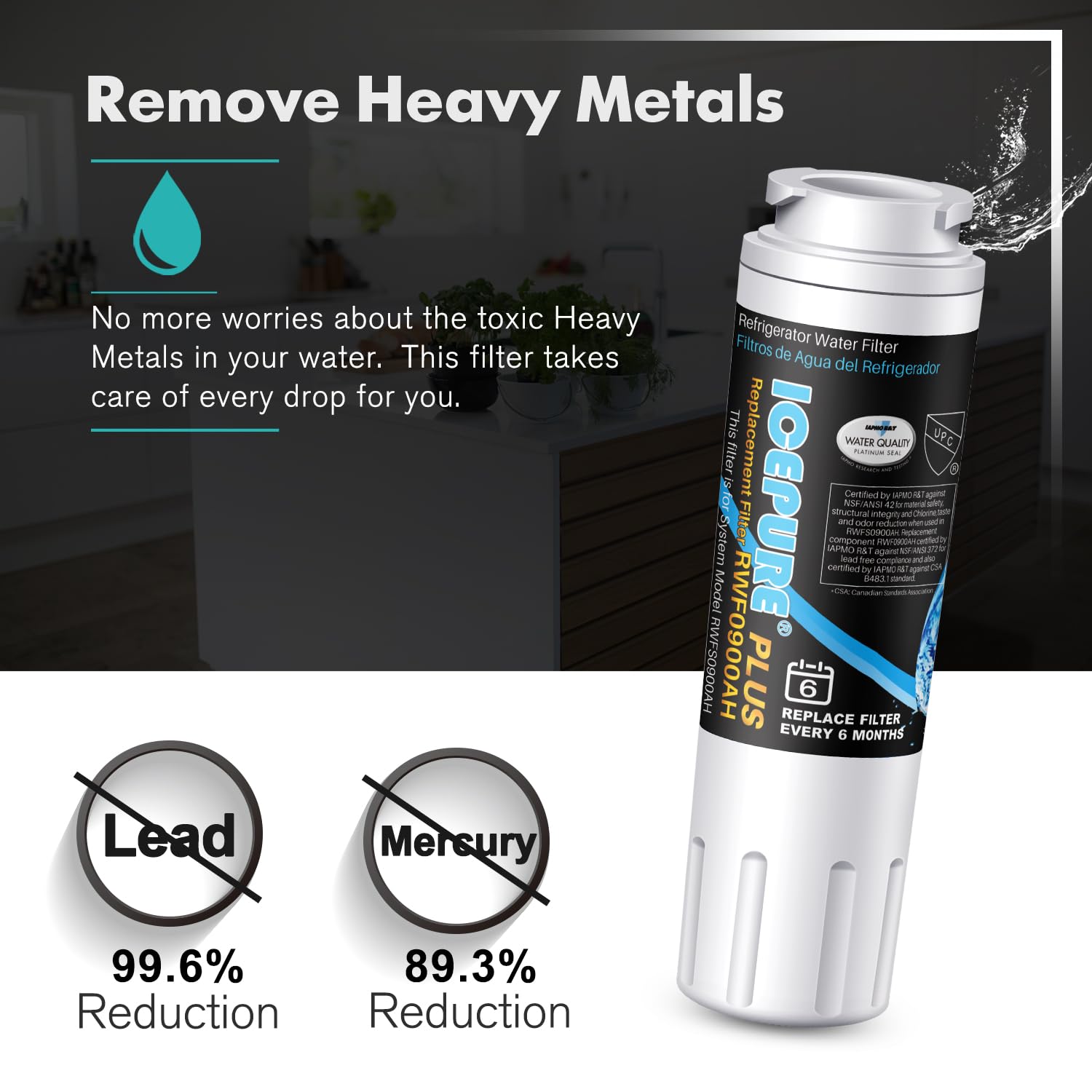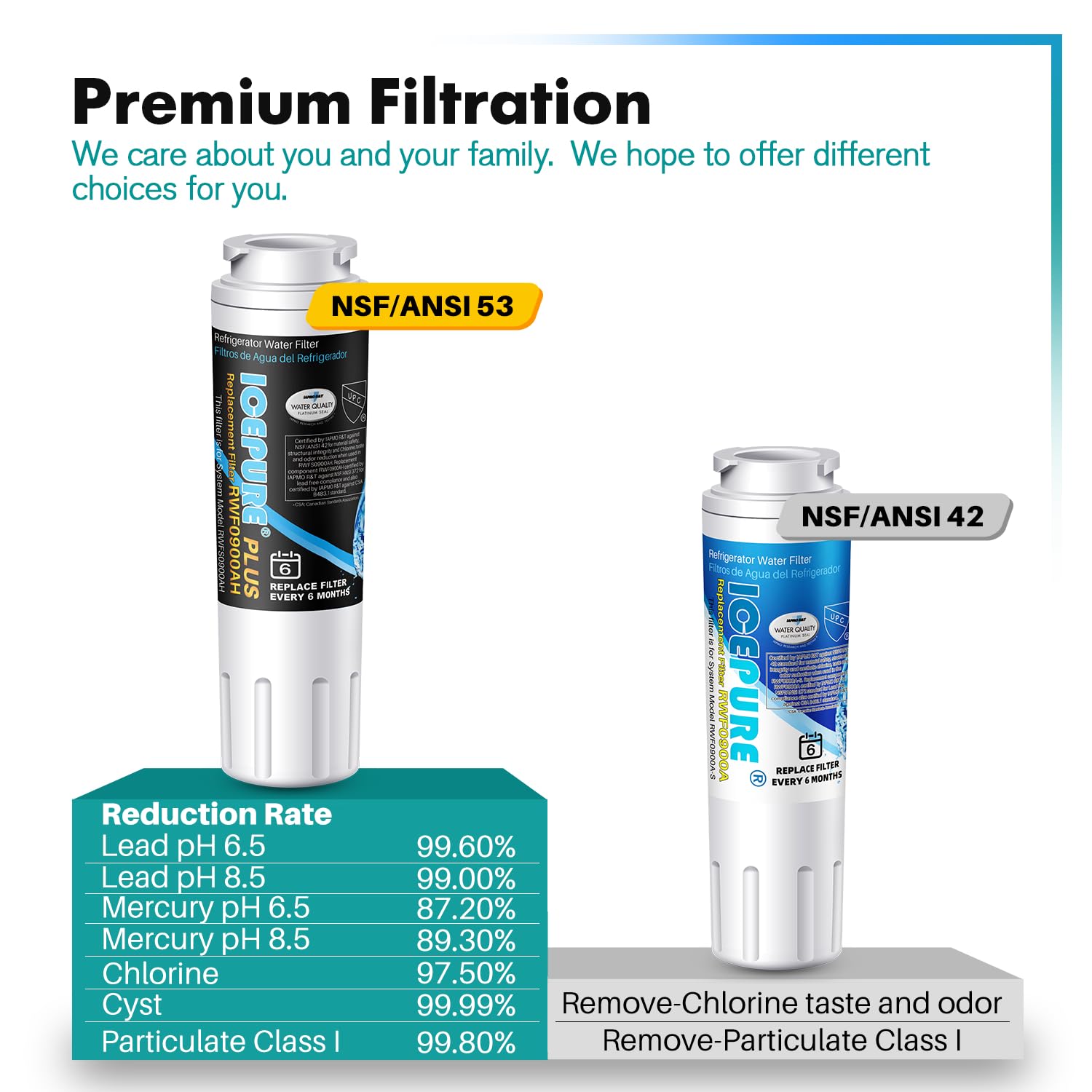 Long Serve Life- ICEPURE refrigerator water’s ability to remove Chlorine after testing 600 Gallons of water in the laboratory is still 99%. But to ensure that we can always drink clean and fresh water, we highly recommend replacing it every 6 months or 300 gallons of water filtered. It also depends on the water quality and the amount of water being filtered. Lots of users are impressed by its longevity and durability