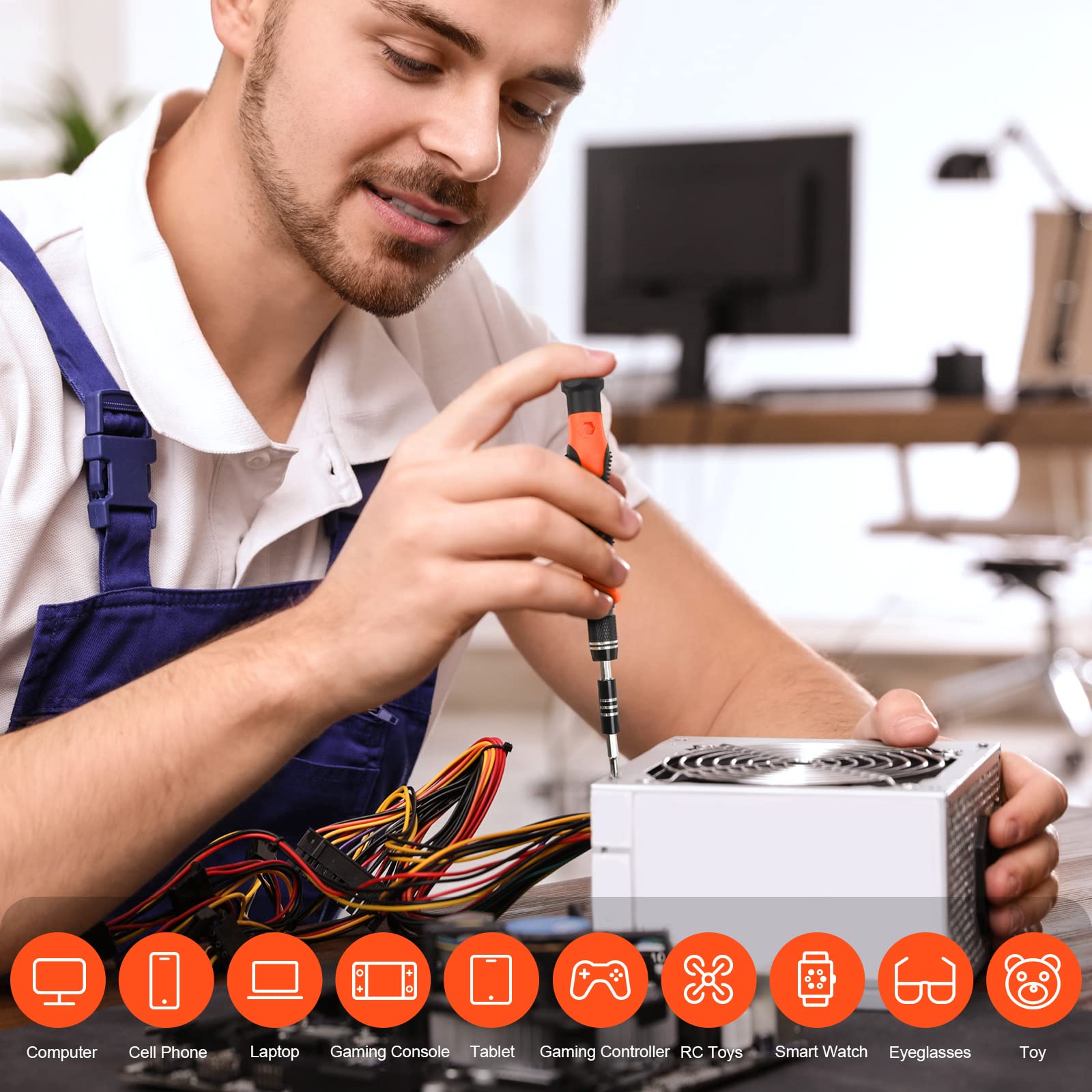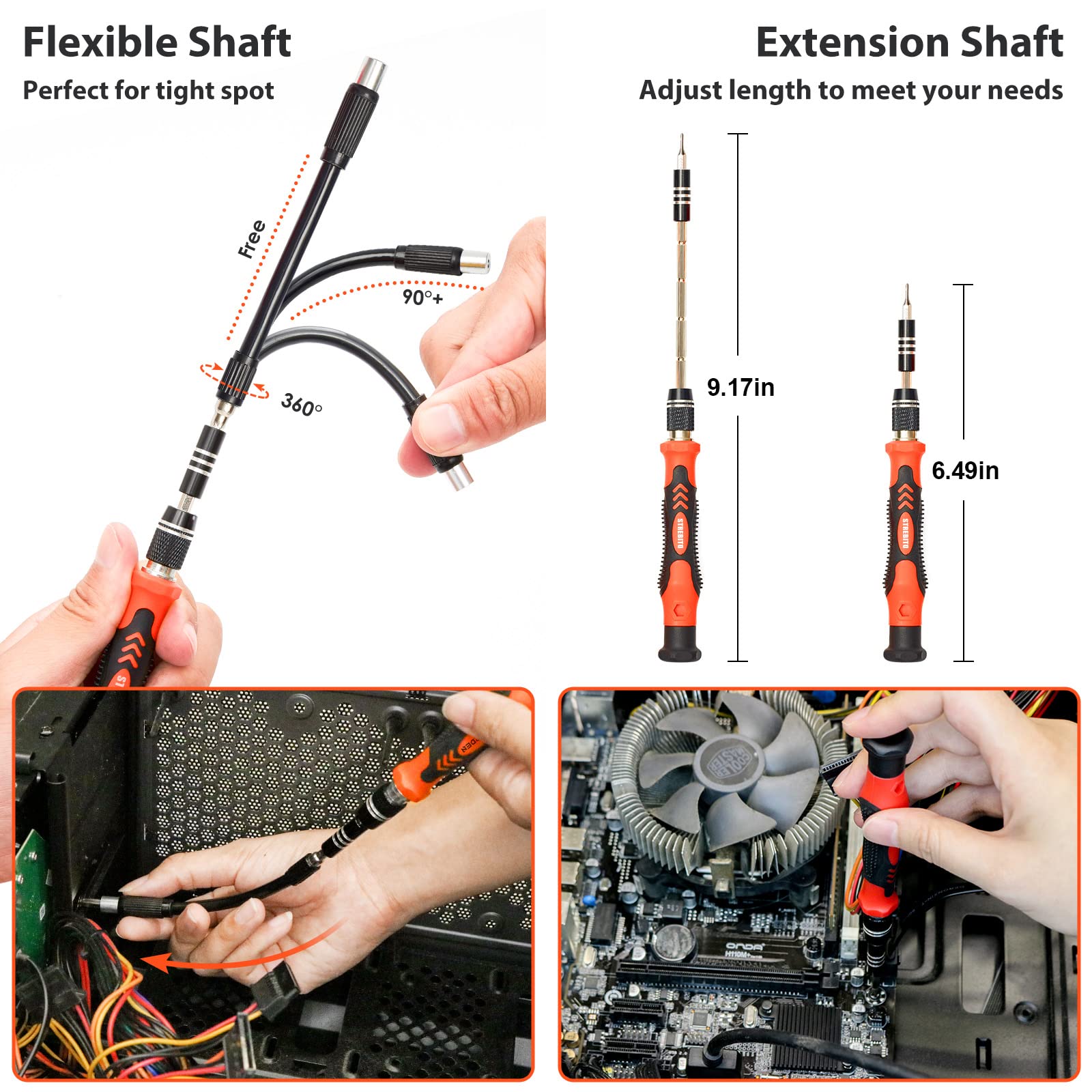 【Humanized Design】Our pc building tool kit has been designed with the professional in mind to maximize your repair capabilities. The screwdriver features a rubberized, ergonomic handle with swivel top, provides a comfort grip and smoothly spinning. Magnetic bit holder transmits magnetism through the bit, helping you handle small screws and parts. The blade can be extended for working in hard-to-reach areas. And flexible extension shaft is useful for removing screw in tight spots