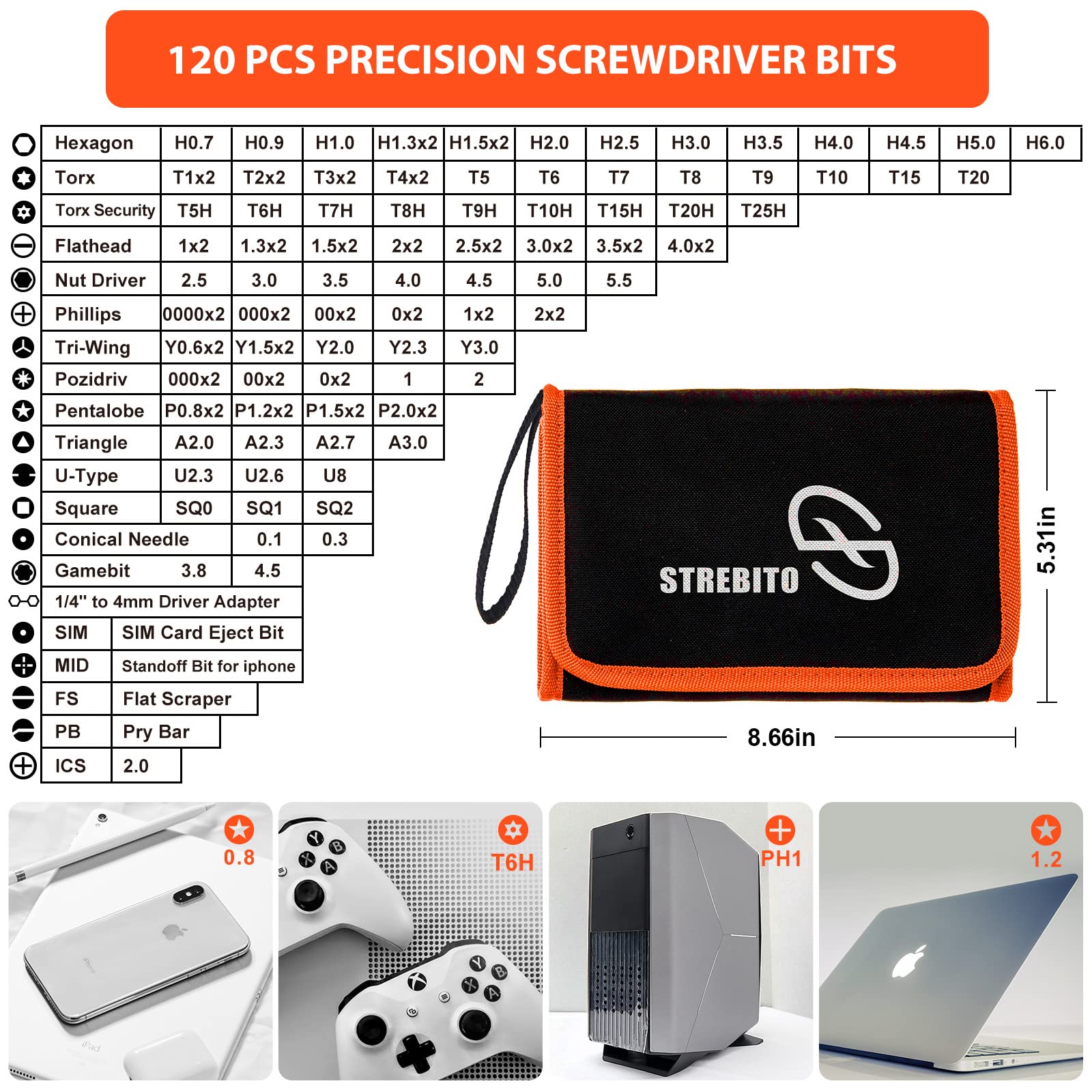 【Wide Application】STREBITO precision screwdriver set has 120 bits, complete with every driver bit you'll need to tackle any fix or DIY project. In addition, this precision tool kit comes with 22 accessories, such as magnetizer, magnetic mat, suction cup, spudger, cleaning brush, tweezers, etc. Whether you're a professional technician or a amateur, this computer toolkit has what you need to repair all PC, cell phone, Macbook, PS4, Xbox, game controller, tablets, glasses, watch, etc