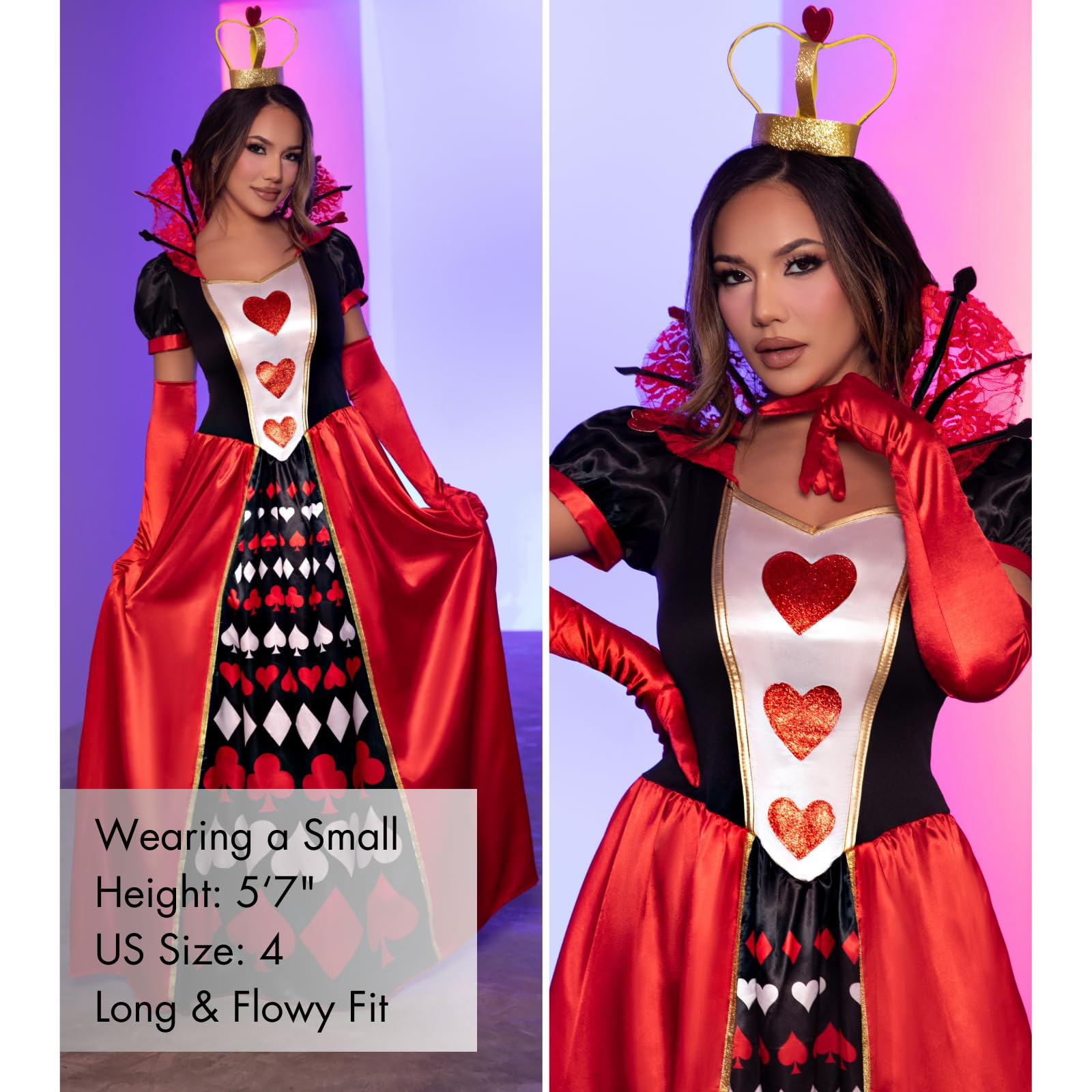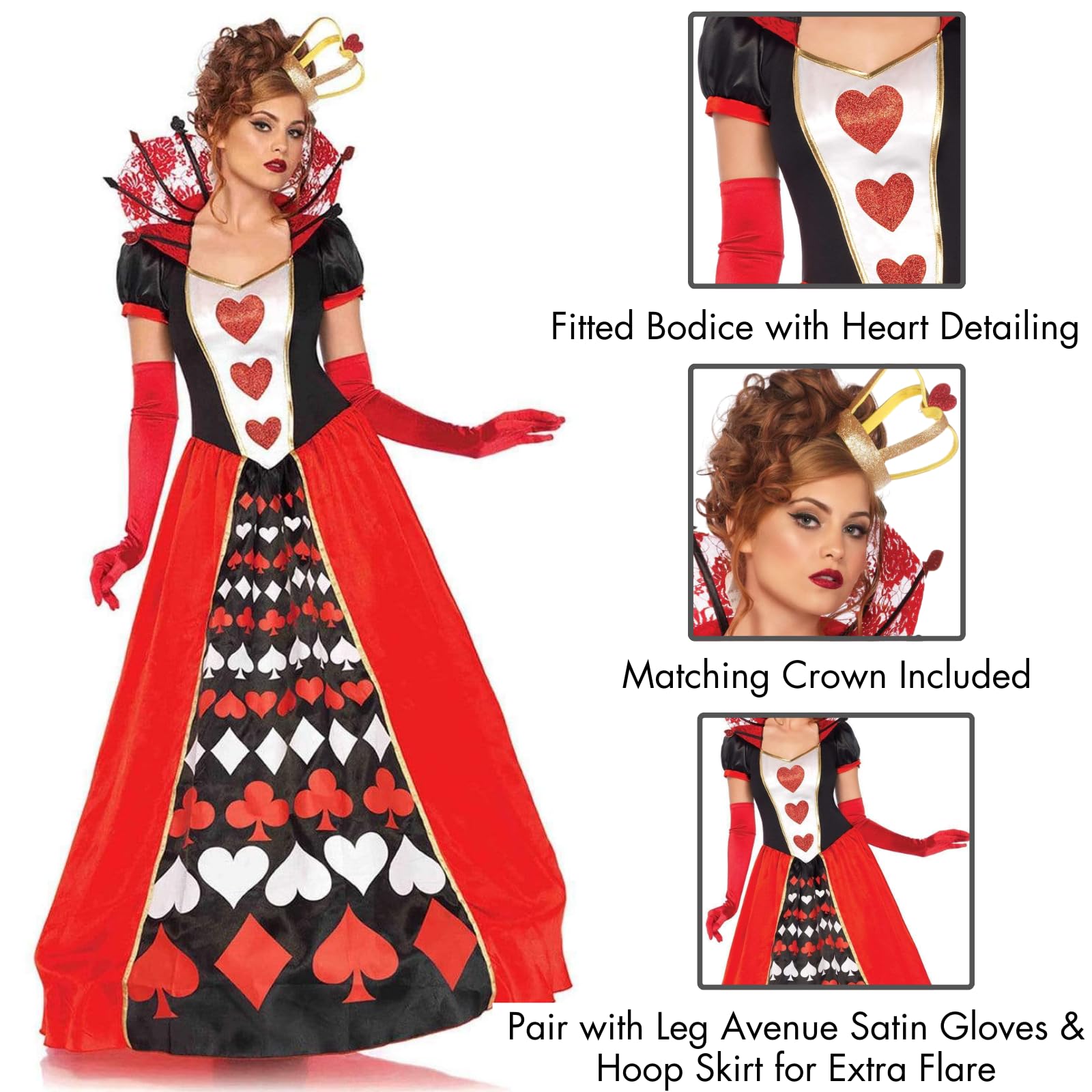 Description Rule over Wonderland in the stunning 2 PC Deluxe Leg Avenue Queen of Hearts costume. This fairytale womens Halloween costumeincludes the dramatic long card suit ball gown with lace stay up card suit collar and matching queen crown. Add a hoop skirt for extra flare. (Gloves not included) PACKAGE INCLUDES: costume dress, crown FIT & STYLE: Fitted top and long flowy skirt make this a fun Halloween costumefit for any queen. MATERIALS/ CARE: Hand wash cold, Do not bleach, Drip dry, Do not iron OCCASION: This Alice in Wonderland costume for womenis perfect for a Halloween costume, themed parties, or cosplay costumefun! FEATURES: Dramatic boned card suit collar and cage crown will have you on Wonderland's best-dressed list. COMPLETE THE LOOK: Grab your favorite Mad Hatterfor a Wonderland couples costume.
