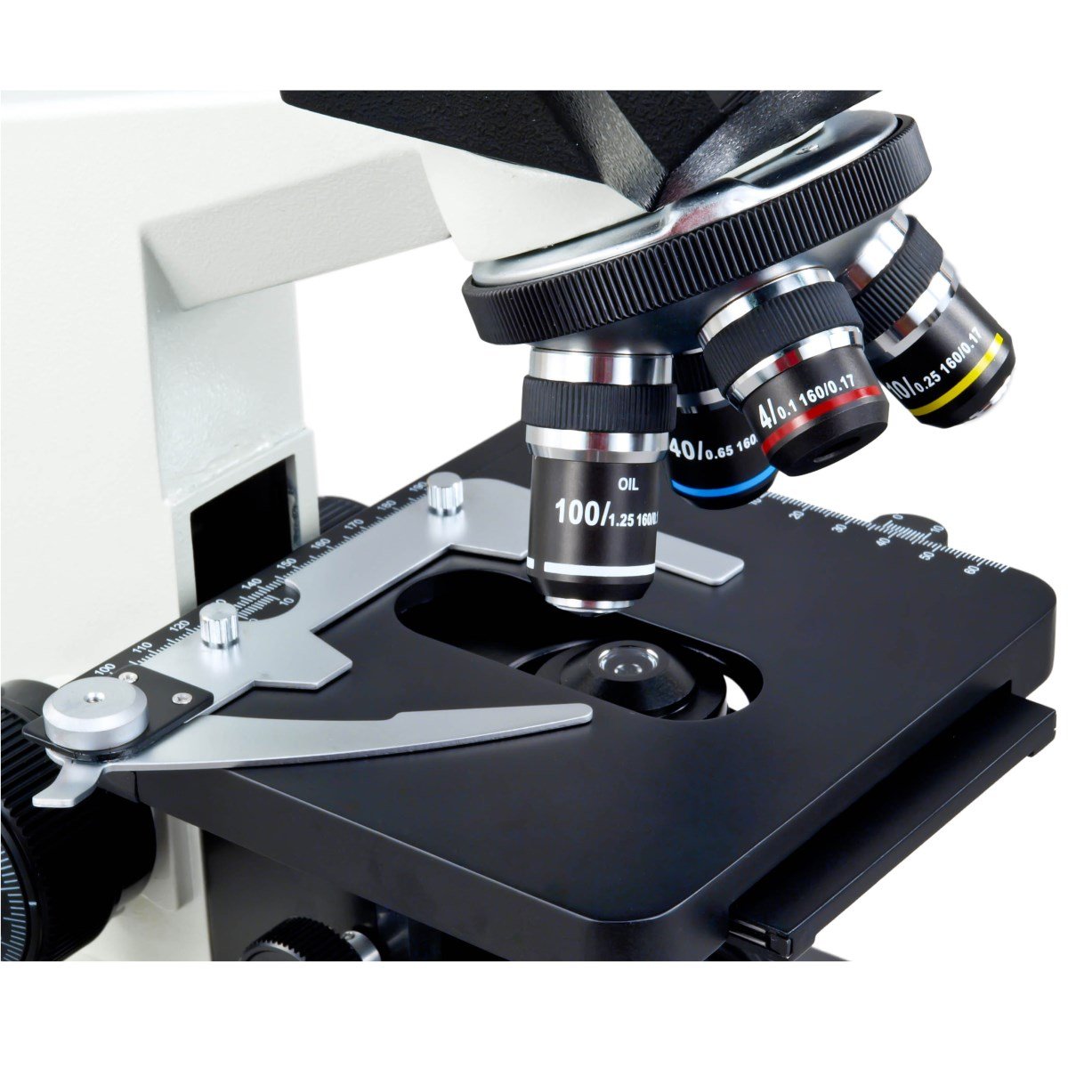 Total magnification: 40X-100X-250X-400X-1000X-2500X; Eyepieces: widefield WF10X/18 and WF25X; Objectives: achromatic DIN 4X, 10X, 40X (S), 100X (S, Oil); Viewing head: 45 degrees inclined 360 degrees swiveling trinocular; Interpupillary distance: sliding adjustable 2-3/16inch ~ 2-15/16inch (55mm ~ 75mm); Diopter: adjustable on both eyepiece tubes