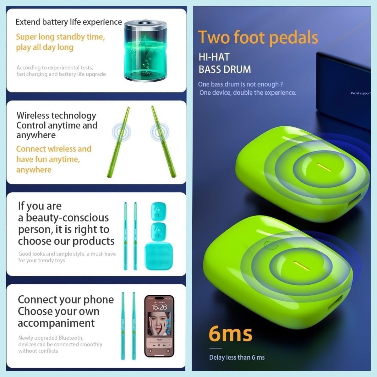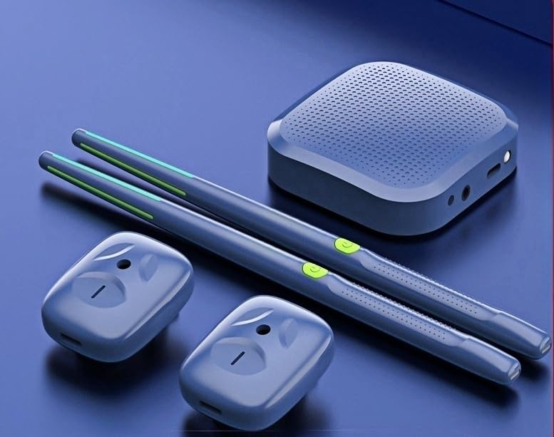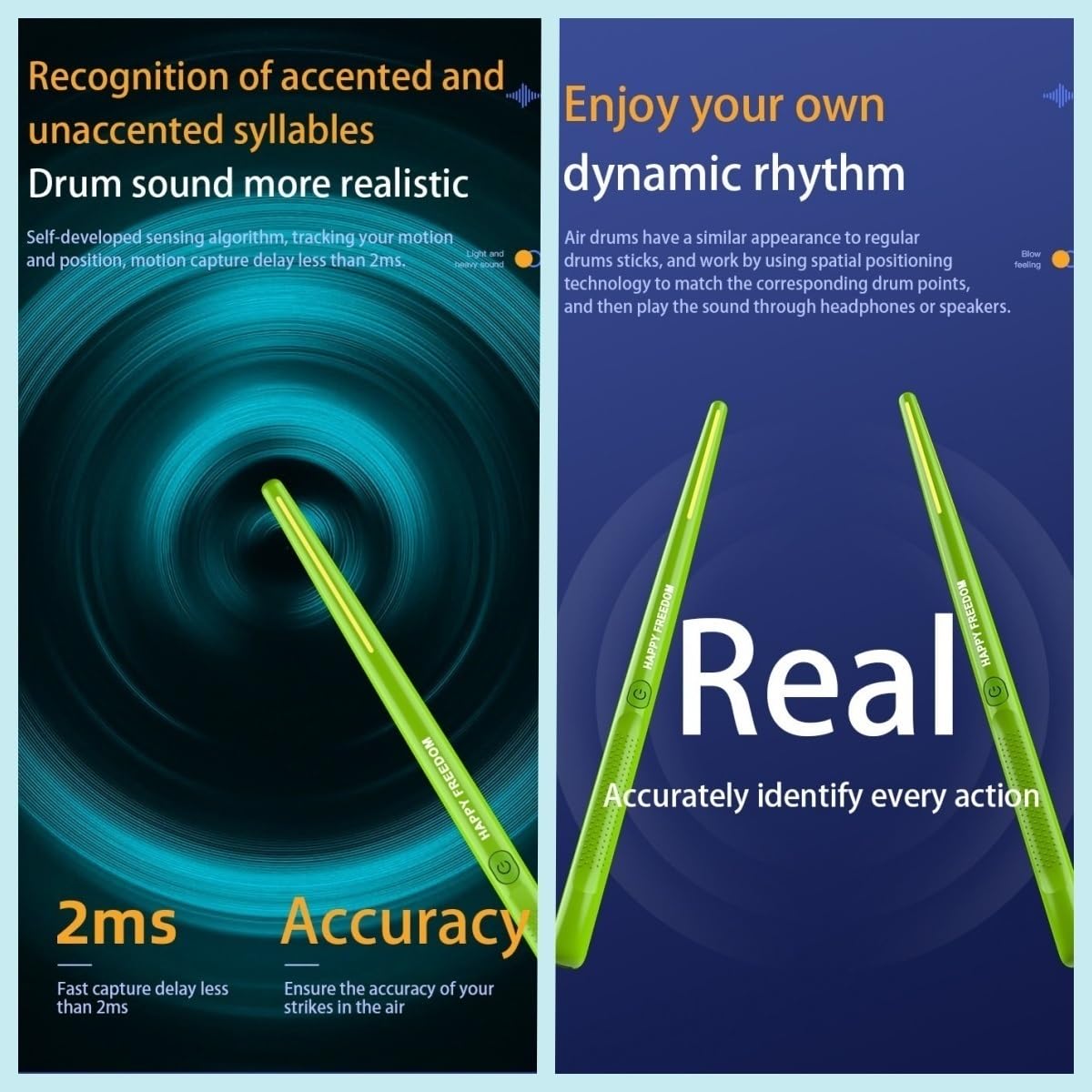 Science and technology:Air drums have a similar appearance to regulardrums sticks, and work by using spatial positioning technology to match the corresponding drum pointsand then play the sound through headphones or speakers.Recognition of accented and unaccented ,syllables Drum sound more realistic,Self-developed sensing algorithm, tracking your motionand position, motion capture delay less than 2ms.Extend battery life experience Super long standby time,play all day long.