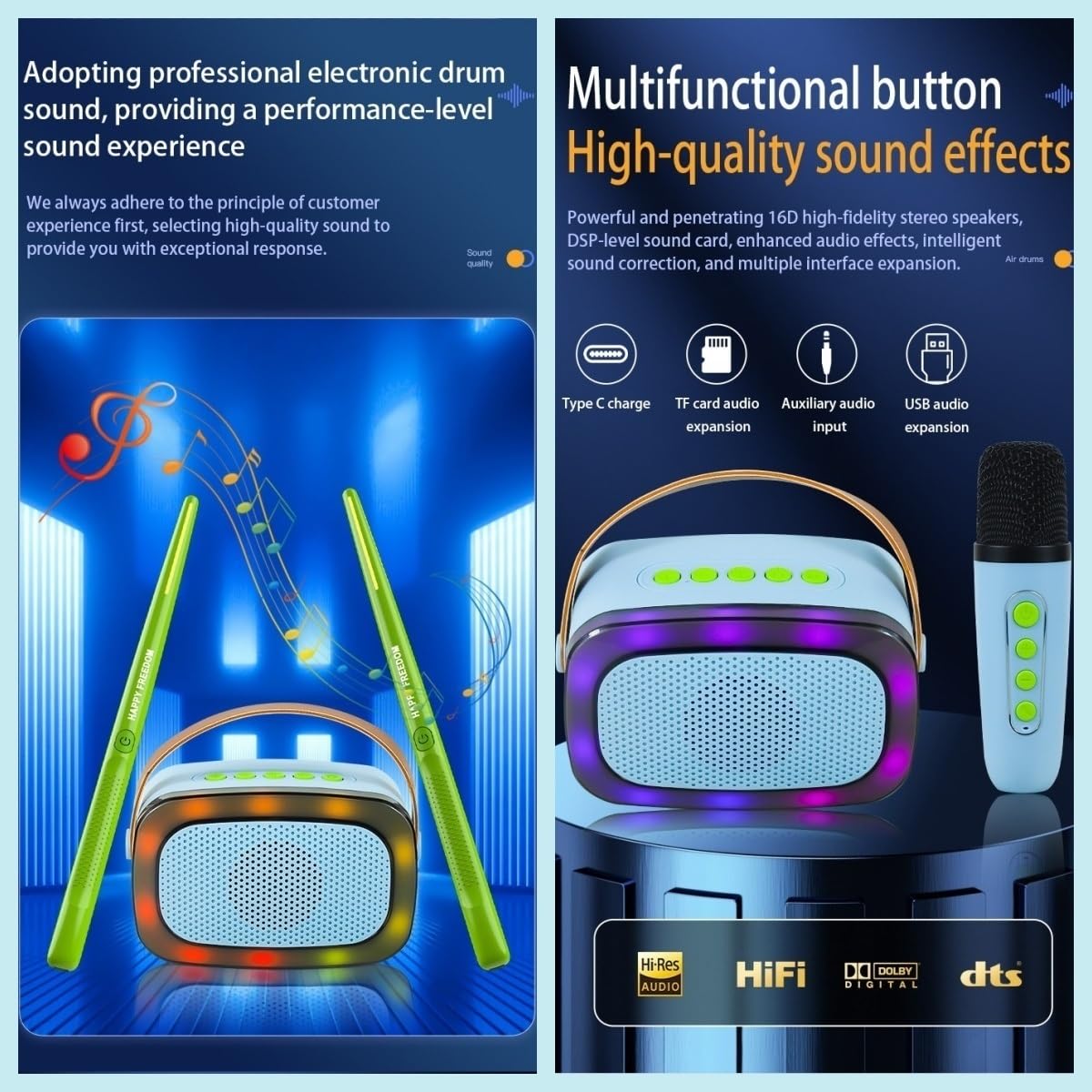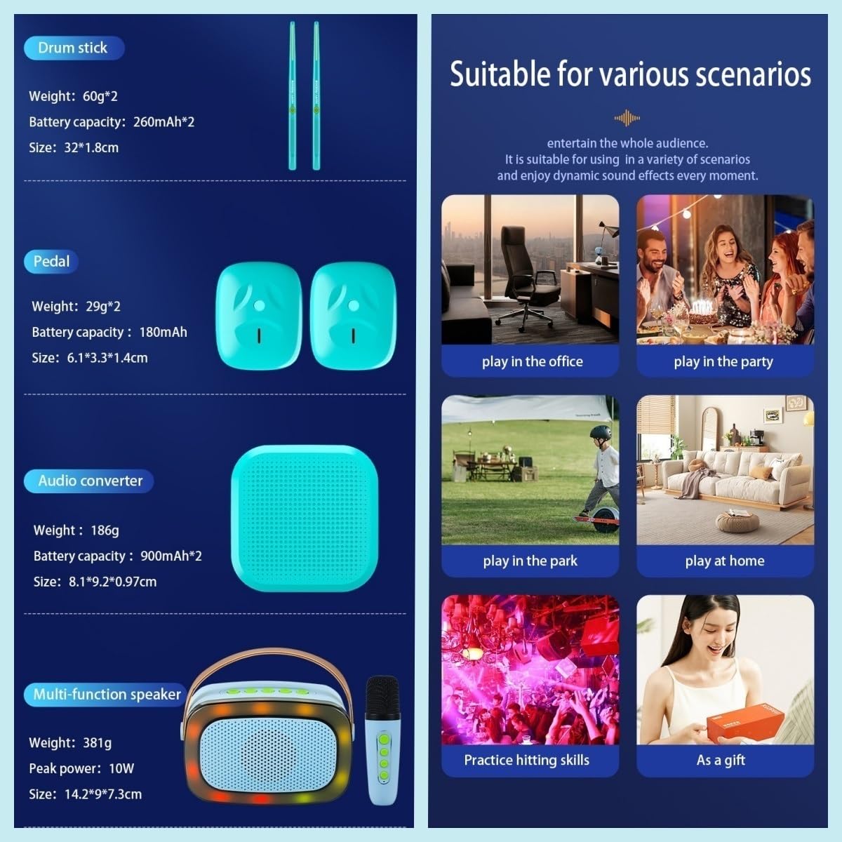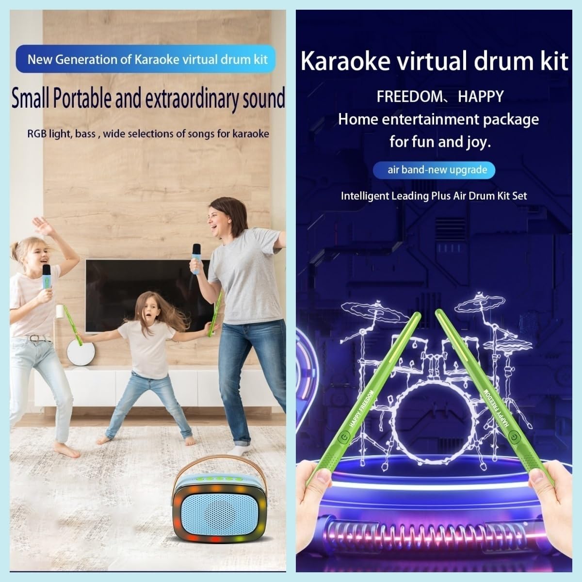 Experience: Our virtual air drumsticks, Coupled with a Multi-function Bluetooth speaker, 5 RGB ambient light modes, Breathing light effectsmake singing more atmospheric and immersiveoffer an immersive drumming experience anytime, anywhere.