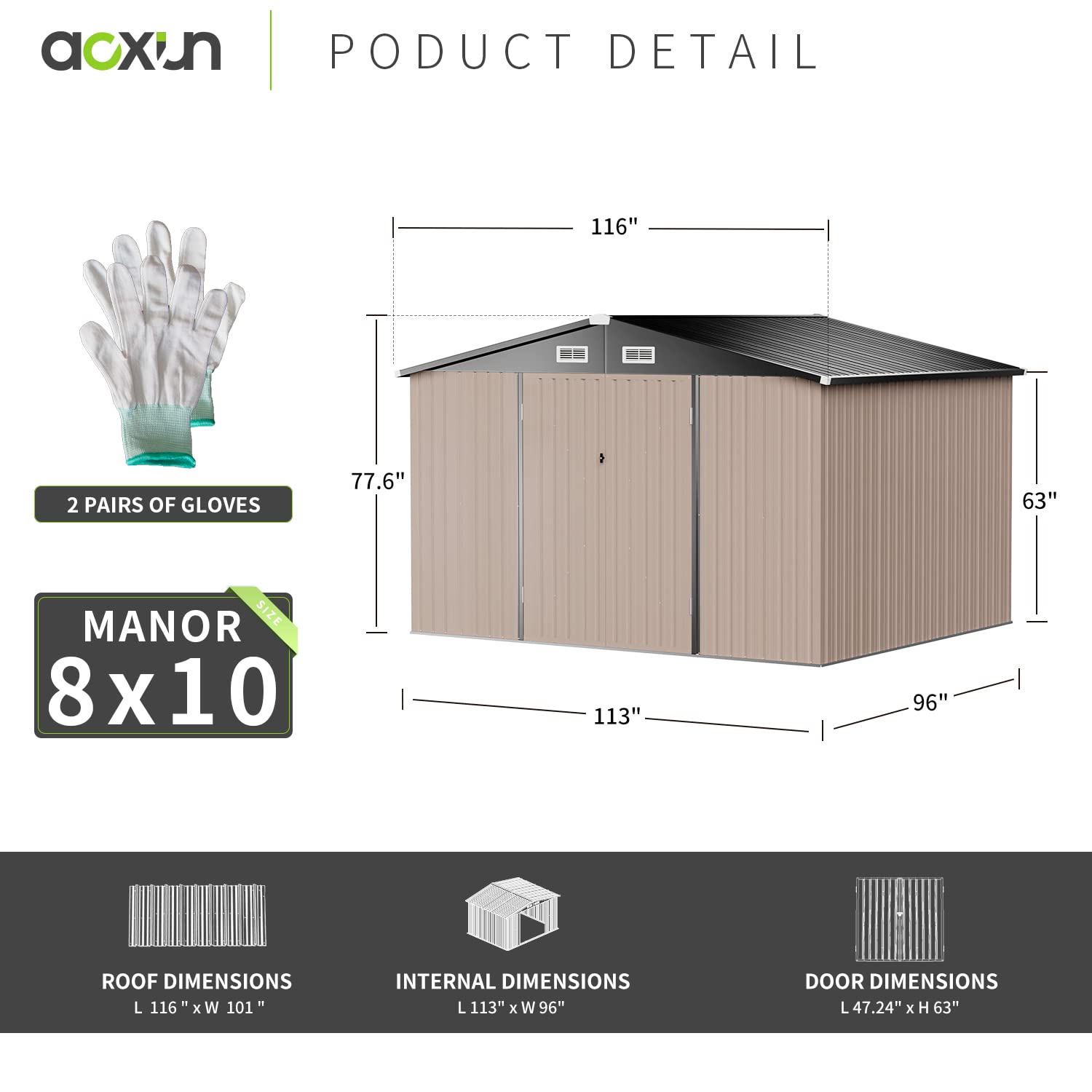 Roomy Interior for Diverse Items: Measuring 10x10 FT, this metal garden shed offers generous storage space for a wide range of items, including snow blowers, shovels, outdoor furniture, bicycles, toy cars, and much more. To enhance organization, you can use storage racks to neatly arrange items such as shovels, umbrellas, antennas, and other accessories.
