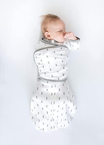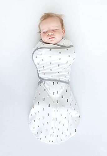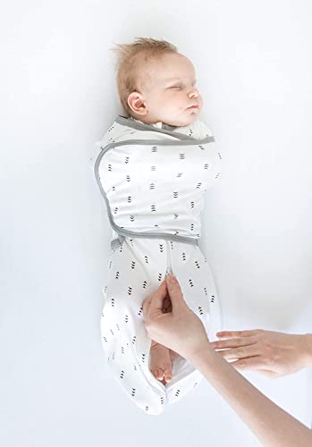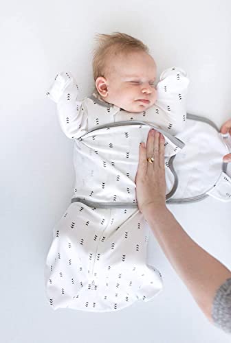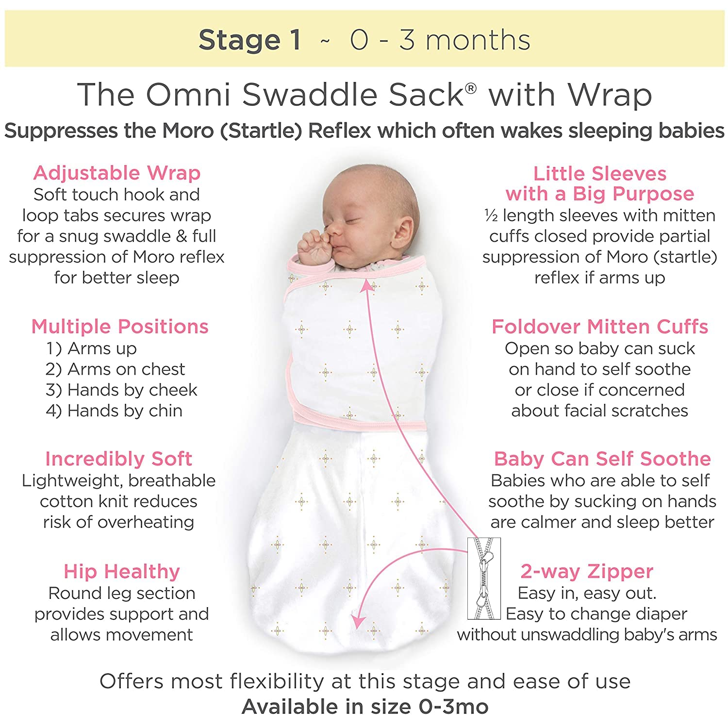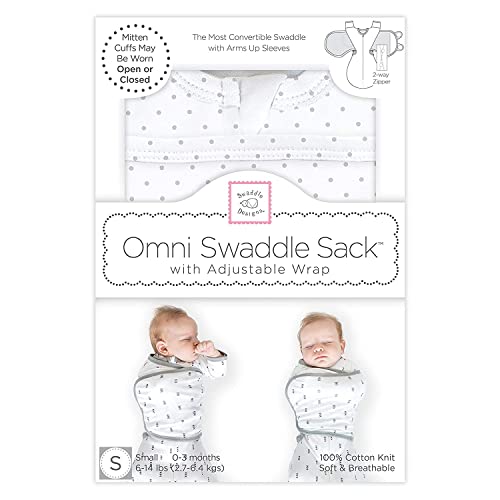 The 6-way Omni Swaddle Sack with Adjustable Wrap and uniquely-designed 1/2 length sleeves with mitten cuffs is the Ideal Swaddle. The ergonomic and convertible design supports more natural hand and arm positions and provides parents with more options when preparing baby for safe sleep. The design allows parents to swaddle with (1) arms up, (2) hands up, and (3) arms on chest under the wrap. The sleeves with mitten cuffs keep baby's arms warm and parents do not need to dress baby in a bodysuit. Foldover mitten cuffs may be worn open or closed, parents can open the cuffs, so baby can self-soothe by sucking on hands or close the cuffs to protect baby from facial scratches. Many experts recommend parents to swaddle baby with hands within reach of mouth, so baby can self-soothe. Babies who can self-soothe sleep longer and better. When baby is swaddled with hands up or arms up, baby can self-soothe by sucking on hands. The ergonomic, patented design with 2-way zipper is easy to use. The adjustable wrap is narrow and does not interfere with baby's hips and the soft hook-and-loop fasteners make it easy to swaddle baby. The 2-way zipper allows parents to unzip from the bottom to check baby's diaper without unwrapping the swaddle. The 2-way zipper makes it easy to place baby in the sack by unzipping from the top. Small 6-14 lbs, 0-3m. When baby is over 3 months or baby shows signs of attempting to rollover, the AAP recommends that parents stop restraining baby's arms with a swaddle or wrap. Parents can use the Omni as a transition swaddle with arms up. When baby outgrows the Omni Swaddle Sack, we recommend a SwaddleDesigns Transitional Swaddle Sack® or a Sleeping Sack wearable blanket. Super soft, premium cotton knit is breathable, stretchy, and natural. Baby will love the softness. 100% Cotton. Machine wash. Tumble dry. Designed by nurse. US Patents 11,659,870 & D924,539. Int’l patents EU, UK, Korea, Canada.