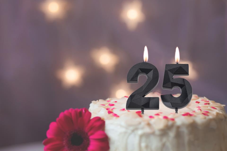INSTRUCTIONS: Package Include: 2 pcs candles,Number 25 birthday candles Color : Glitter Black Material : quality wax ,smokeless and non-toxic Size: Width:1.4 in. Number height: 1.97 in. Total height: 4.9 in Please Note : Warm Note:Please keep the candles in shade away from the fire