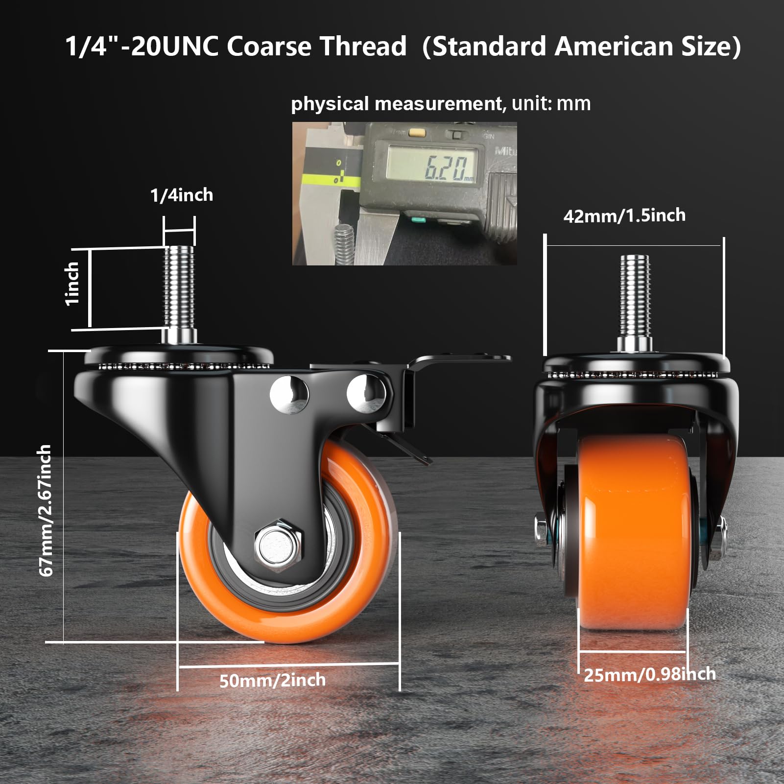 STANDARD AMERICAN SIZE 1/4" -20UNC x 1": Threaded caster wheels Diamater: 1/4", Stem Length 1", thread dual locking heavy duty caster wheels with brakes easy to install with included mounting hardware, 4 nuts, 4 washers, and 2 spanners, please confirm the required screw specifications before purchasing the stem caster wheels 2 inch.