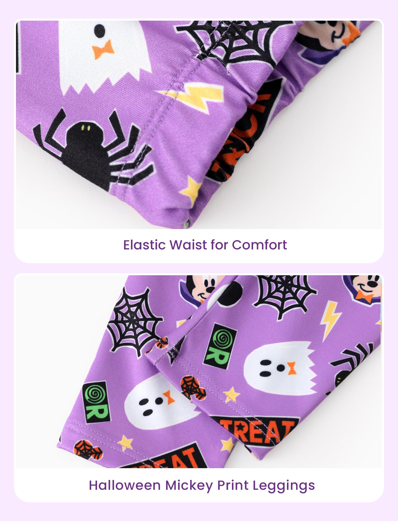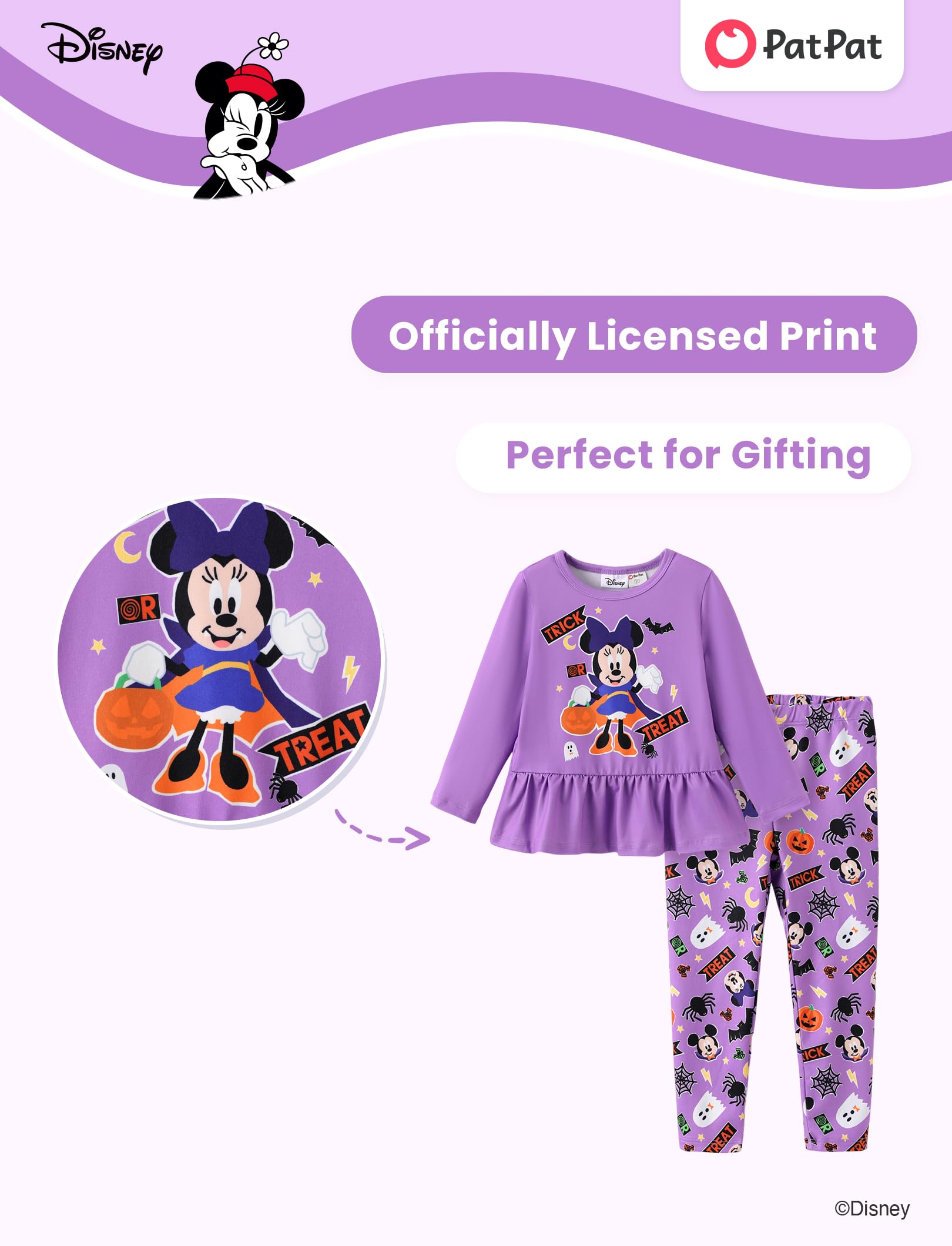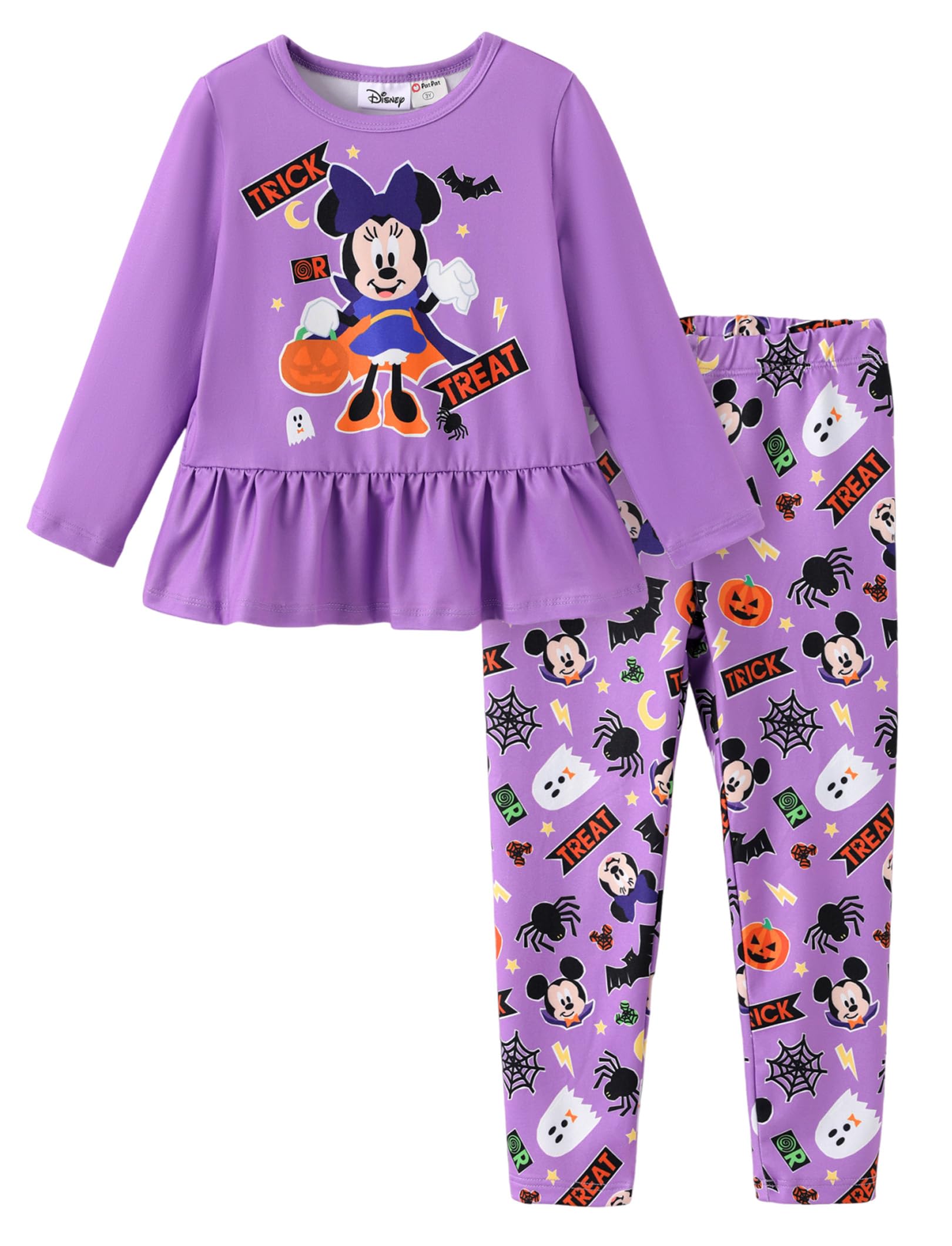 Playful & Spooky Design: This Halloween Minnie outfit features a lilac long-sleeve peplum top with a cheerful minnie mouse halloween shirt graphic holding a pumpkin bucket, surrounded by bats, stars, and festive “Trick or Treat” accents. The matching pants are decorated with an allover print of Minnie faces, pumpkins, ghosts, spiders, and candy motifs, complete with a comfy elastic waistband. A fun and coordinated set, perfect as a minnie mouse halloween costume for celebrations