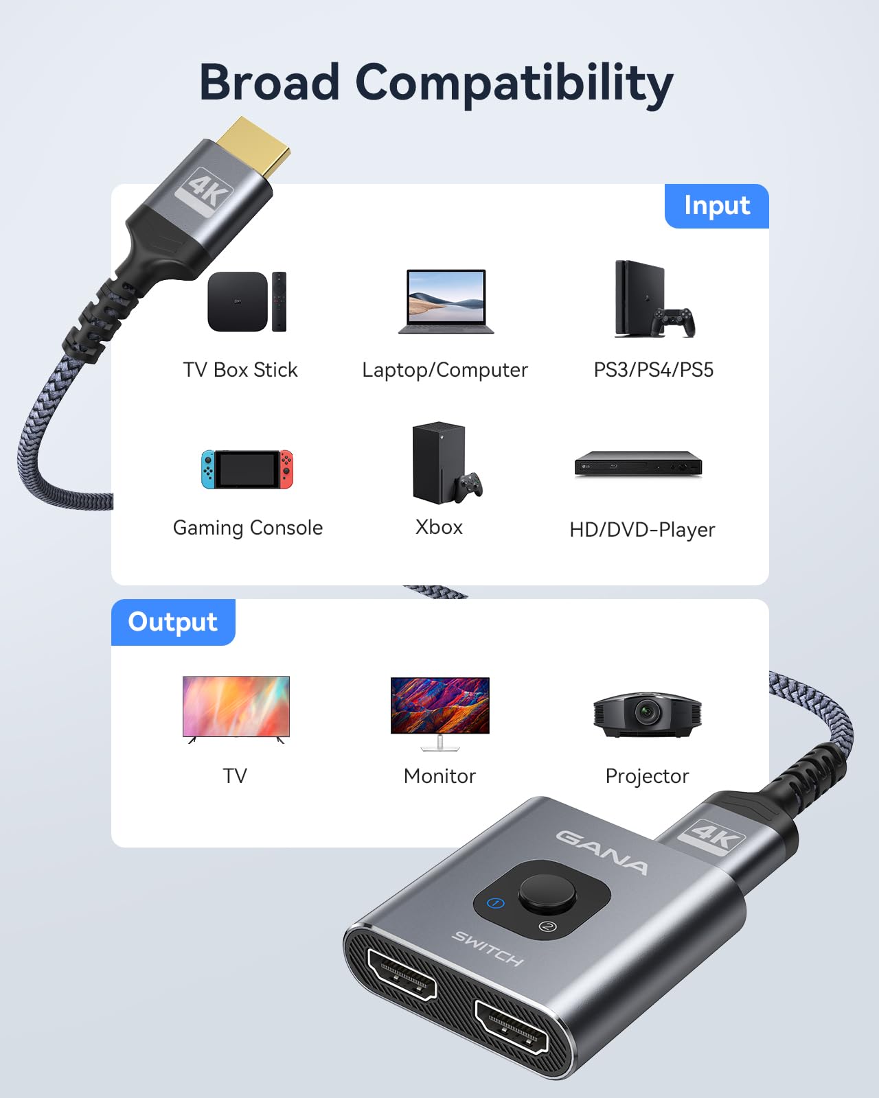 【Broad Compatibility】 HDMI Splitter Switcher compatible for most standard HDMI port devices. Support Input: computer, XBox 360, XBox One, Compatible with PS5/4/3 , Blu-Ray DVD player etc. Output: HD-Ready or Full HD TVs, monitors, projectors etc.