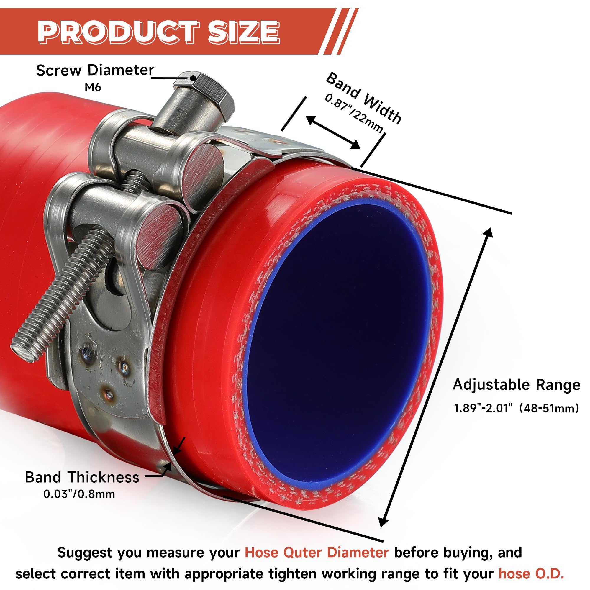 [Clamps Size] T bolt clamp adjustable work range 1.89-2"(48mm to 51mm); Width: 0.78"(20mm); Thickness 0.8mm(0.031"); the screw bolt M6*55mm. to save you time, please carefully check and measure your hose OD to fit working range before purchasing our products.