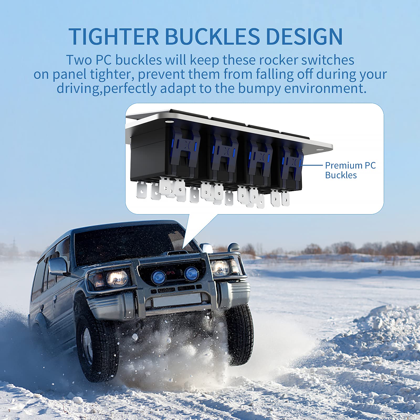 ✔【TIGHTER BUCKLES DESIGN】Each switch has a blue buckle on both sides, they are premium pc materials, will keep the switches on panel tighter, prevent the toggle switches from falling off during your driving, perfectly adapt to the bumpy environment.