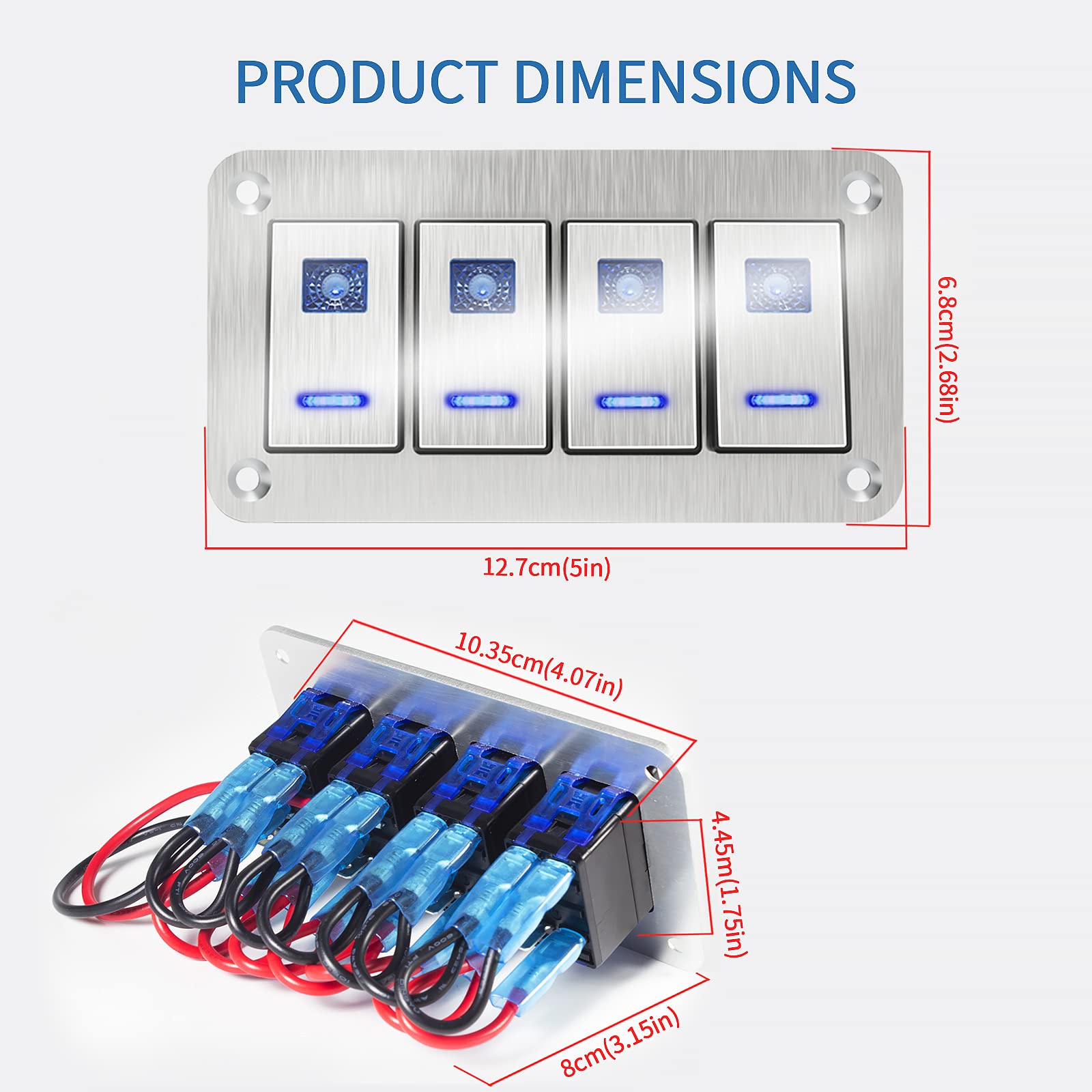 ✔【PRODUCT INFORMATION】The 4 gang switches panel can be applied to DC12V or DC24V operating voltage, the aluminum panel size: 5''x2.68'', cutout dimension: 4.07''x1.75'', it can fit various automotive vehicles.