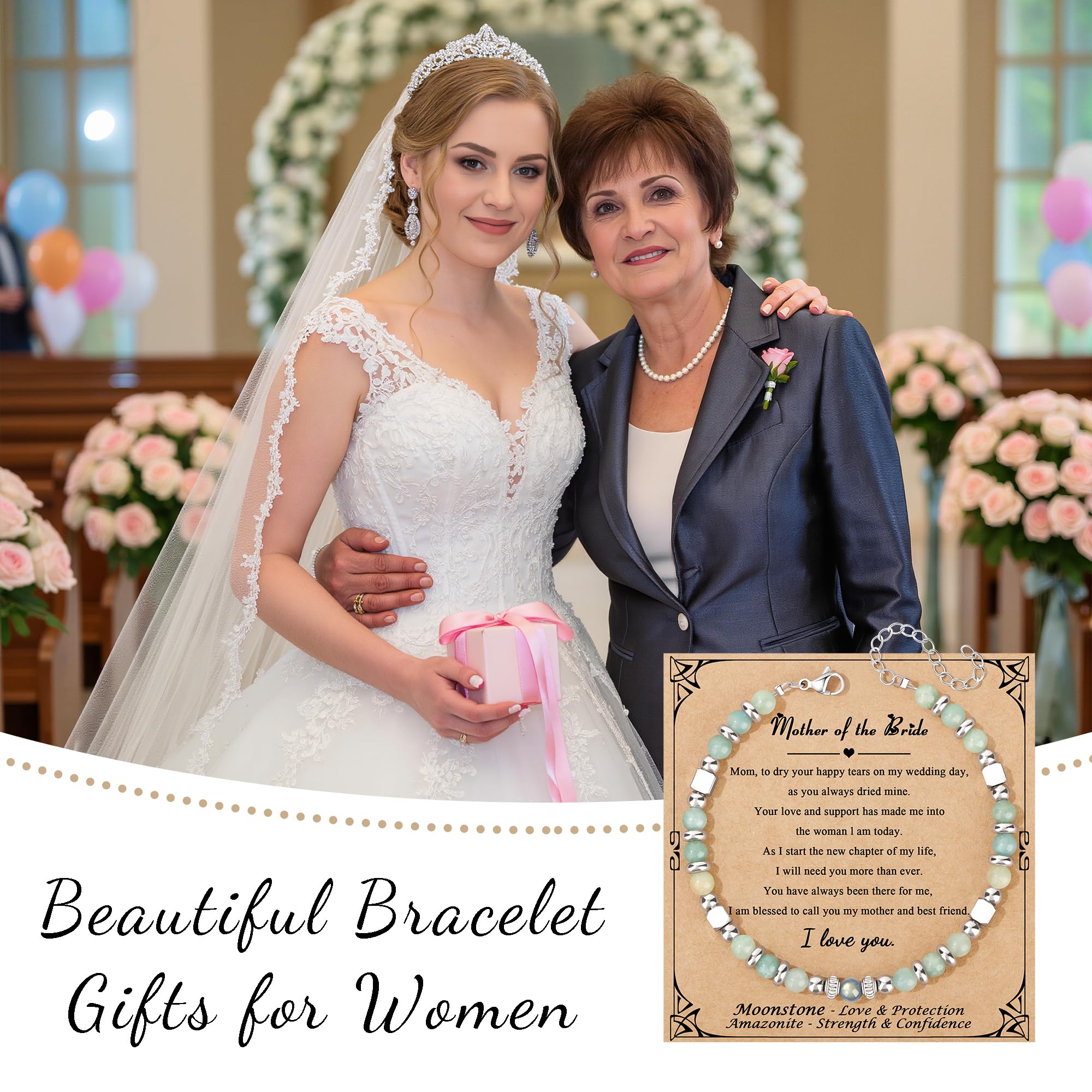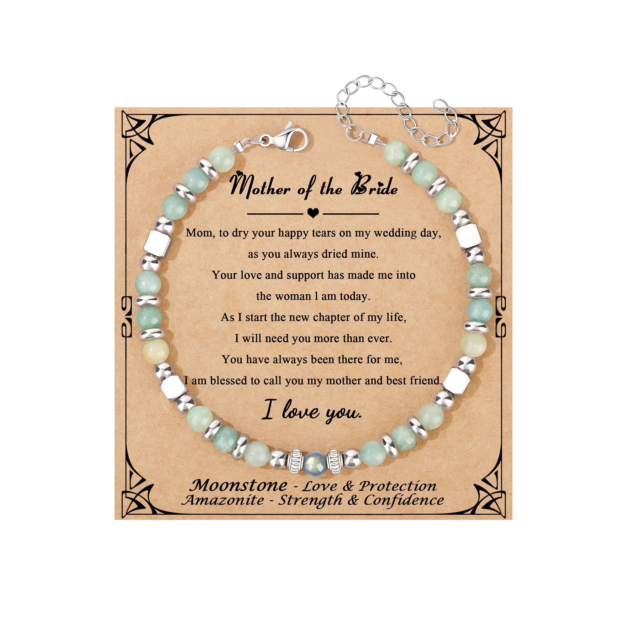 ๐Unique Gifts for Women: Each bracelet is one-of-a-kind, thanks to its unique natural stonesโjust like her irreplaceable role as the heart of your family. Crafted with Moonstone for loving protection and Amazonite for inner strength, it carries your meaningful wish for her on this special journey. Paired with an uplifting message card, it's the perfect Mother of the Bride gift for the Wedding day, Mothers Day, Christmas, Rehearsal Dinner, or as a heartfelt thank-you.