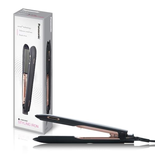 The Panasonic Nanoe Hair Styling Iron EH-HS99-K with nanoe Technology makes it quick and easy to curl or straighten hair like a pro. As you style, nanoe draws moisture from the air to infuse tiny, moisture-rich particles into each shaft of hair; these nanoe ions leaves hair with increased shine and reduced frizz. A high-recovery heater allows the flat irons to maintain a constant temperature and evenly distribute heat over 4-inch long, 1-inch wide ceramic plates to help reduce styling time. With even tension, the straightening iron plates glide smoothly over hair with minimal effort, while delivering evenly distributed heat for effortless curling and straightening. The Panasonic EH-HS99-K Hair Straightening Iron uses five separate heat settings - 270 Degree F - 395 Degree F - for different hair types, styles and lengths and heats up to 215-degrees F in just 30 seconds when you need to quickly touch-up your style. The compact hair iron head allows you to styling hair from the root, for a smooth, uniform look without frizz. And the ergonomic design fits naturally in the hand while a thumb groove provides a sure, comfortable grip for total styling control. An extra-long swivel cord makes it easy to use the Panasonic Flat Iron at any angle. allows for easy flat iron use at any angle. Universal voltage enables styling at home and while travelling and for safety, the straightener shuts off automatically when not in use for 60 minutes.