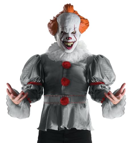 Description Step into the terrifying world of Derry with the IT Pennywise Costume Top and Half Mask by Rubies, inspired by the blockbuster theatrical film! This officially licensed adult costume set features a highly detailed printed top that recreates Pennywise’s eerie Victorian-style clown suit, complete with ruffled collar and sinister stitching for that screen-accurate look. The included half mask captures the menacing grin and chilling stare of the modern Pennywise, made famous by Bill Skarsgård’s unforgettable performance. Whether you're gearing up for Halloween, a horror-themed event, or cosplay that’s sure to send shivers down spines, this easy-to-wear set delivers maximum scare factor with minimal effort. Just add a red balloon—because when Pennywise comes out to play, you’ll float too! Since 1951, Rubies has been a trusted name in fun, offering safety-tested costumes, wigs, masks, and accessories for kids, adults, pets, and décor. Now part of a global family of brands, Rubies delivers both licensed and original styles designed with quality, comfort, and creativity in mind. From Halloween to everyday play, our wide assortment helps bring imagination to life with on-trend looks and iconic characters. With over 70 years of experience, Rubies continues to inspire unforgettable moments for the whole family—year-round.