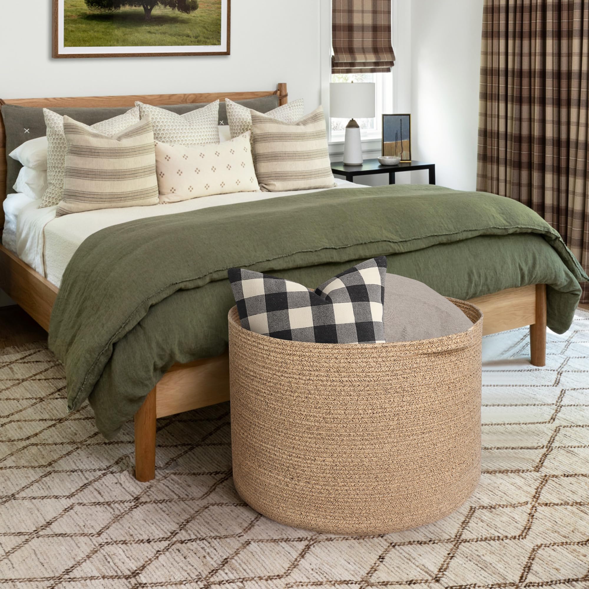 Oversized Storage Basket (23.6”x23.6”x15.7”): This XXXL woven basket offers an impressive 115L capacity, perfect for storing blankets, throw pillows, and quilts in the living room. Deep and spacious, it keeps your cozy living room essentials within easy reach while maintaining a tidy look. Also great as a toy bin for kids’ rooms—ideal for storing stuffed animals, dolls, trucks, Legos, and more.