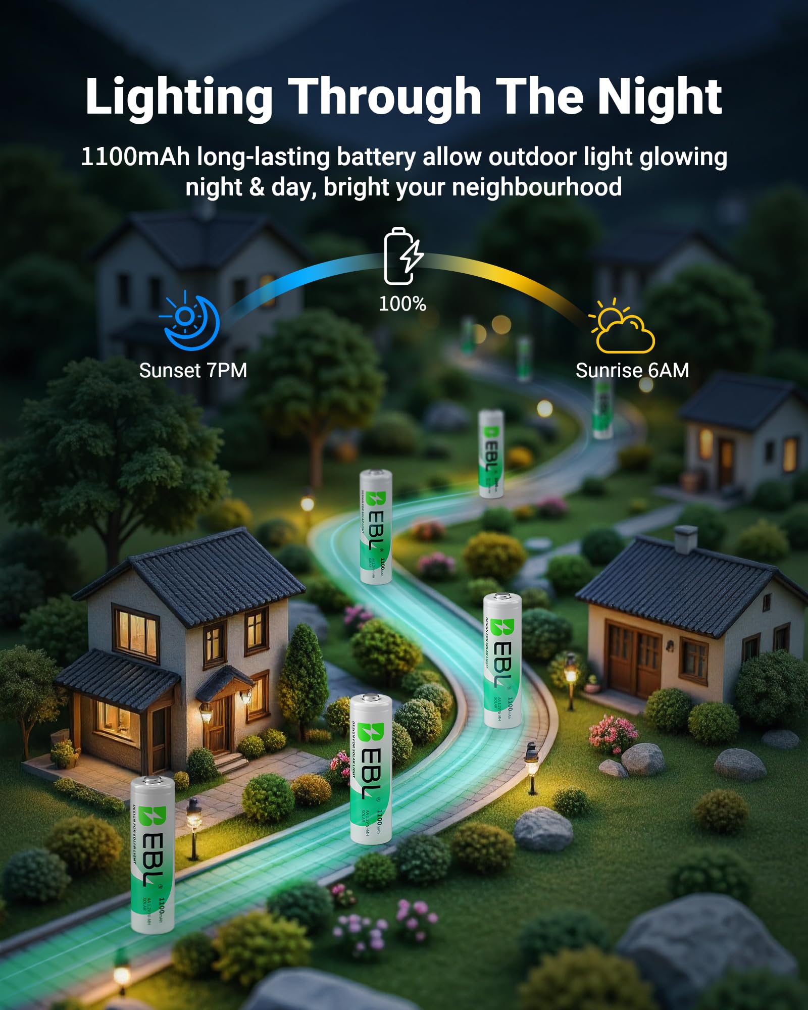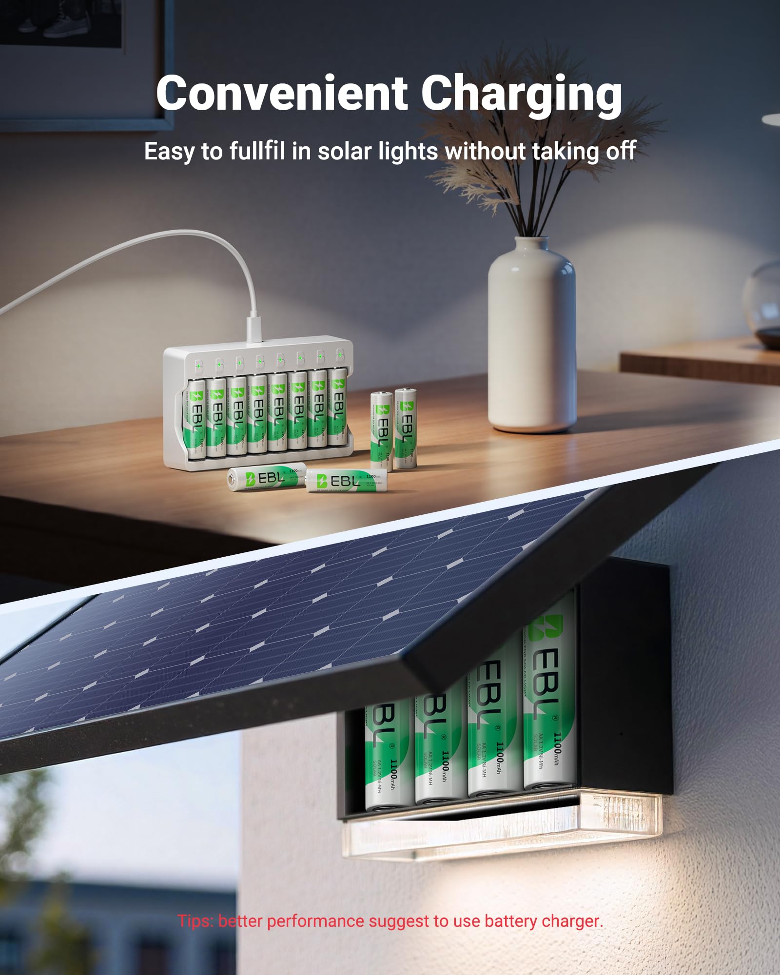 Convenient Using: Standard size solar aa batteries for solar lights replacement come with portable storage case can be charged fast by solar lights or battery charger. Suggest use EBL battery charger for better performance or when sunlight is not enough.
