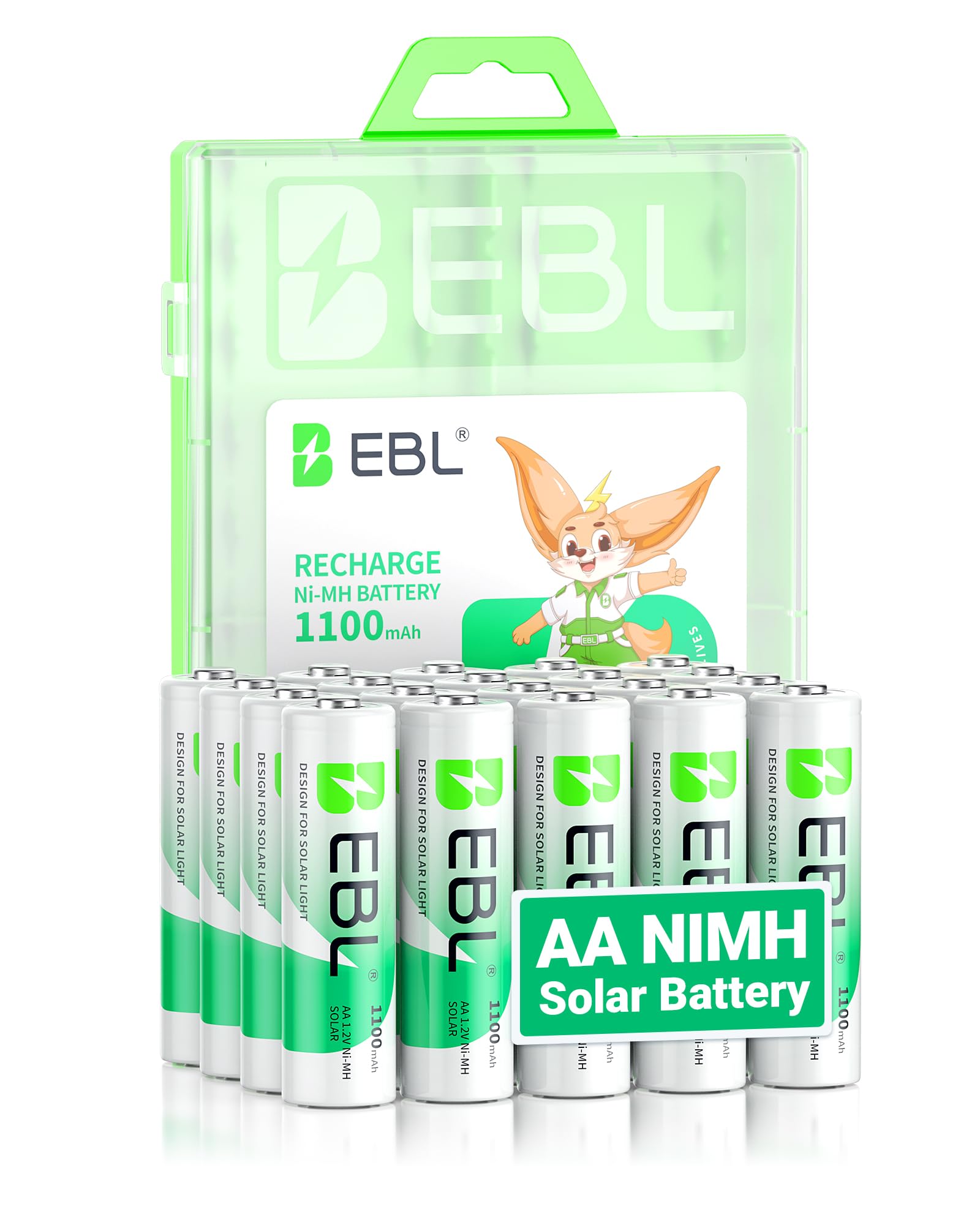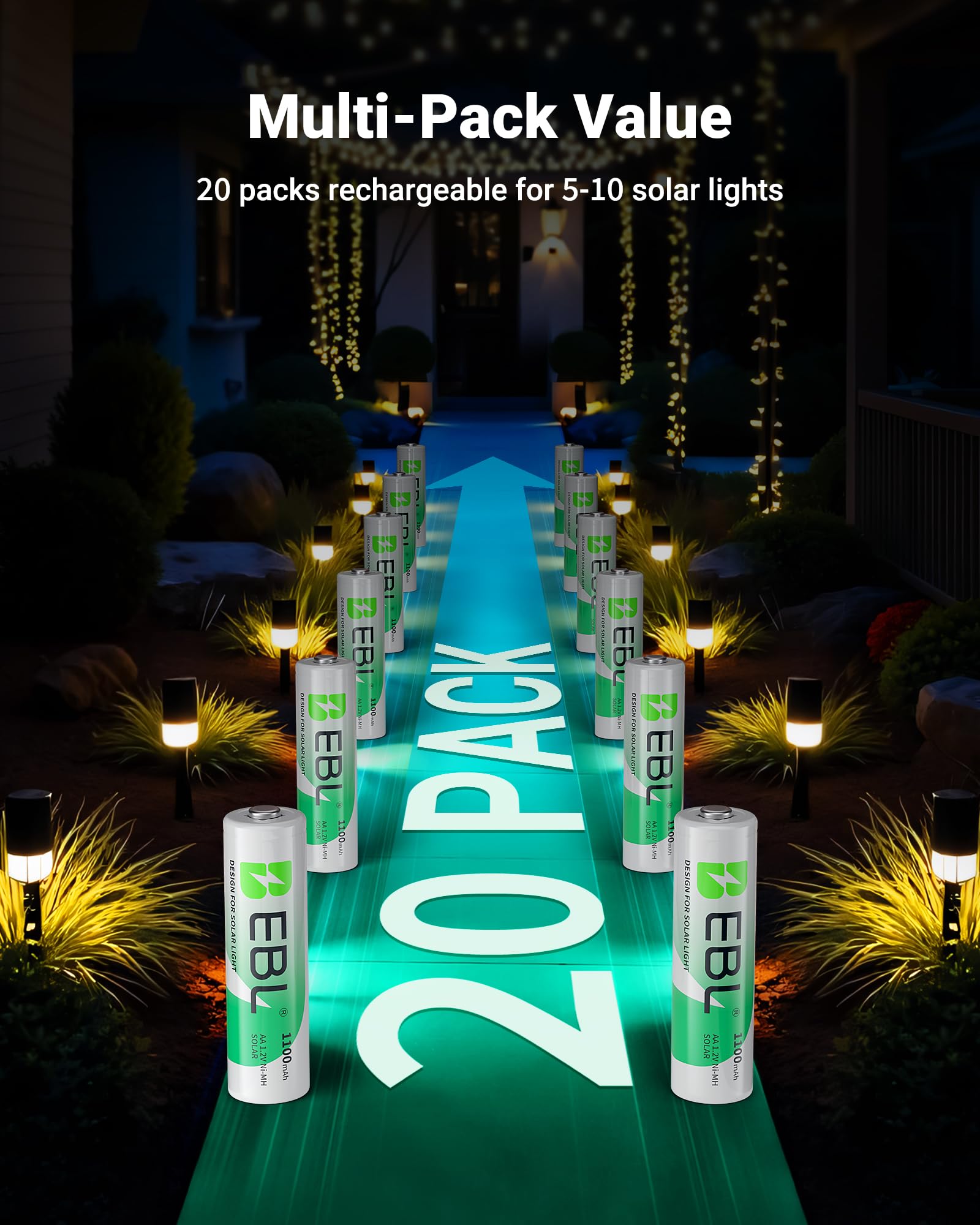 Great Quality AA Rechargeable Battery: EBL 20 packs aa rechargeable batteries—1100mAh 1.2V AA batteries with large capacity for outdoor solar lights garden lights string light lawn lights, TV remotes, wireless mouse and keyboards, gaming controllers, RC remotes, toys, flash lights, bringing great convenience in daily usage.
