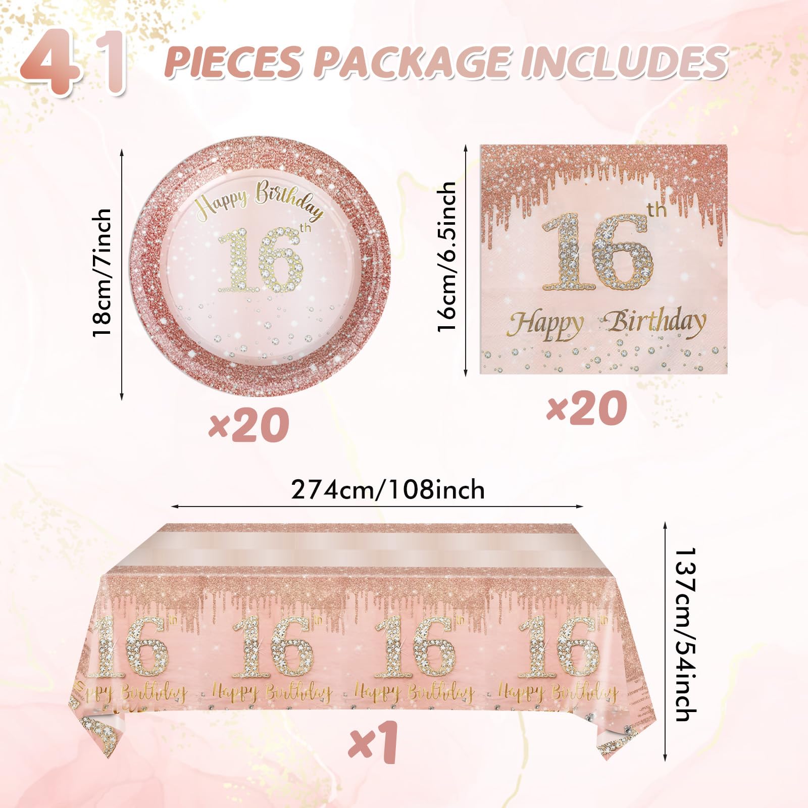 【SWEET 16th BIRTHDAY PLATES FOR GIRLS】The disposable dinnerware comes with 7" paper dessert plates *20, 6.5" napkins (3 layers) *20 and tablecover *1. The durable dinnerware set allows you to serve 20 guests at one time