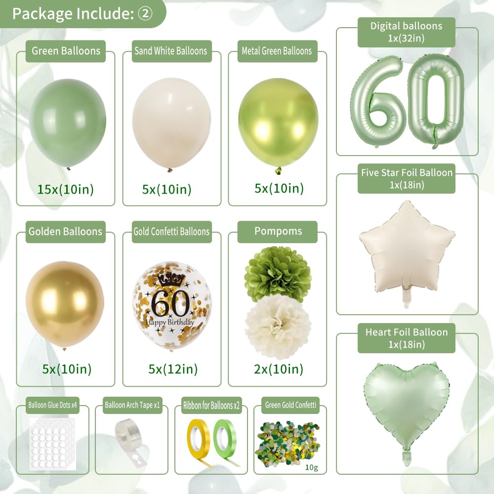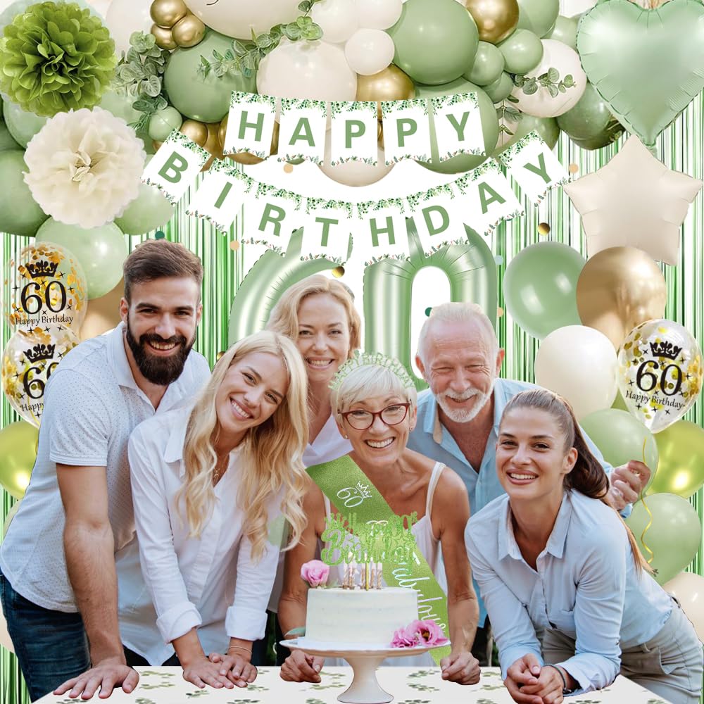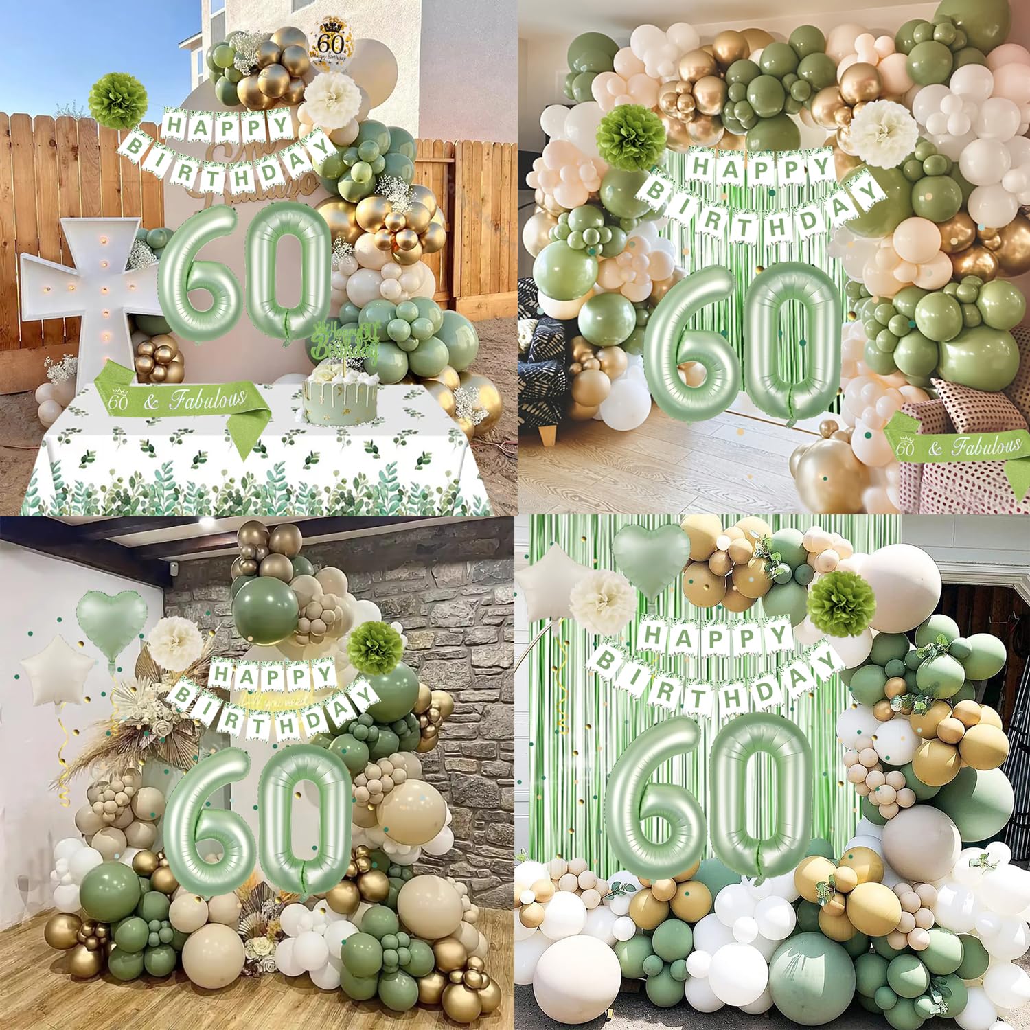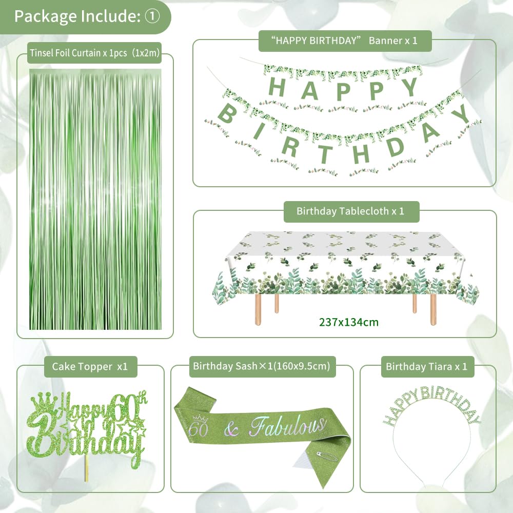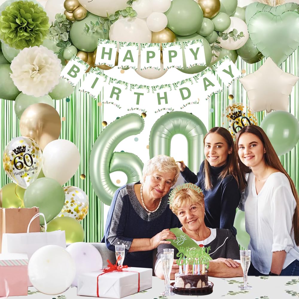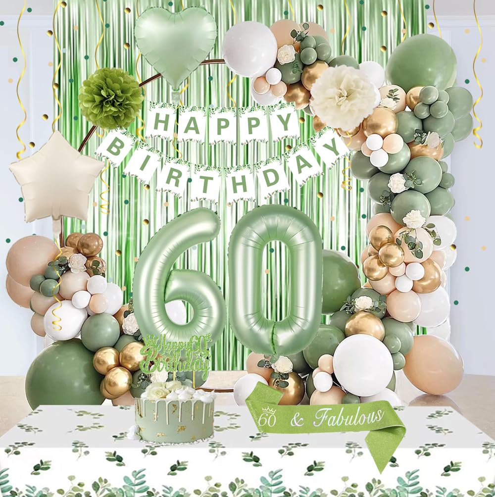 【60th Birthday Decorations Set】This Sage Green Happy Birthday Decorations includes 1* piece Happy Birthday Banner, 1* green birthday crown, 1* green birthday sash 160 x 9.5cm, 1* green white tablecloth 237 x 134cm, 1* green rain curtain 1 x 2m, 1* 6+0 numeral balloons 32", 15* sage green balloons, 5* sand white balloons, 5* gold metallic balloons, 5* green metallic balloons,5* gold confetti balloons, 2 x foil balloons, 2 x paper pompoms flowers, 1* Happy Birthday cake topper, 10g green gold confetti, 2* 10m band, 1* 16 foot balloon chain, 4 piece glue.