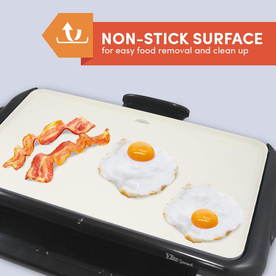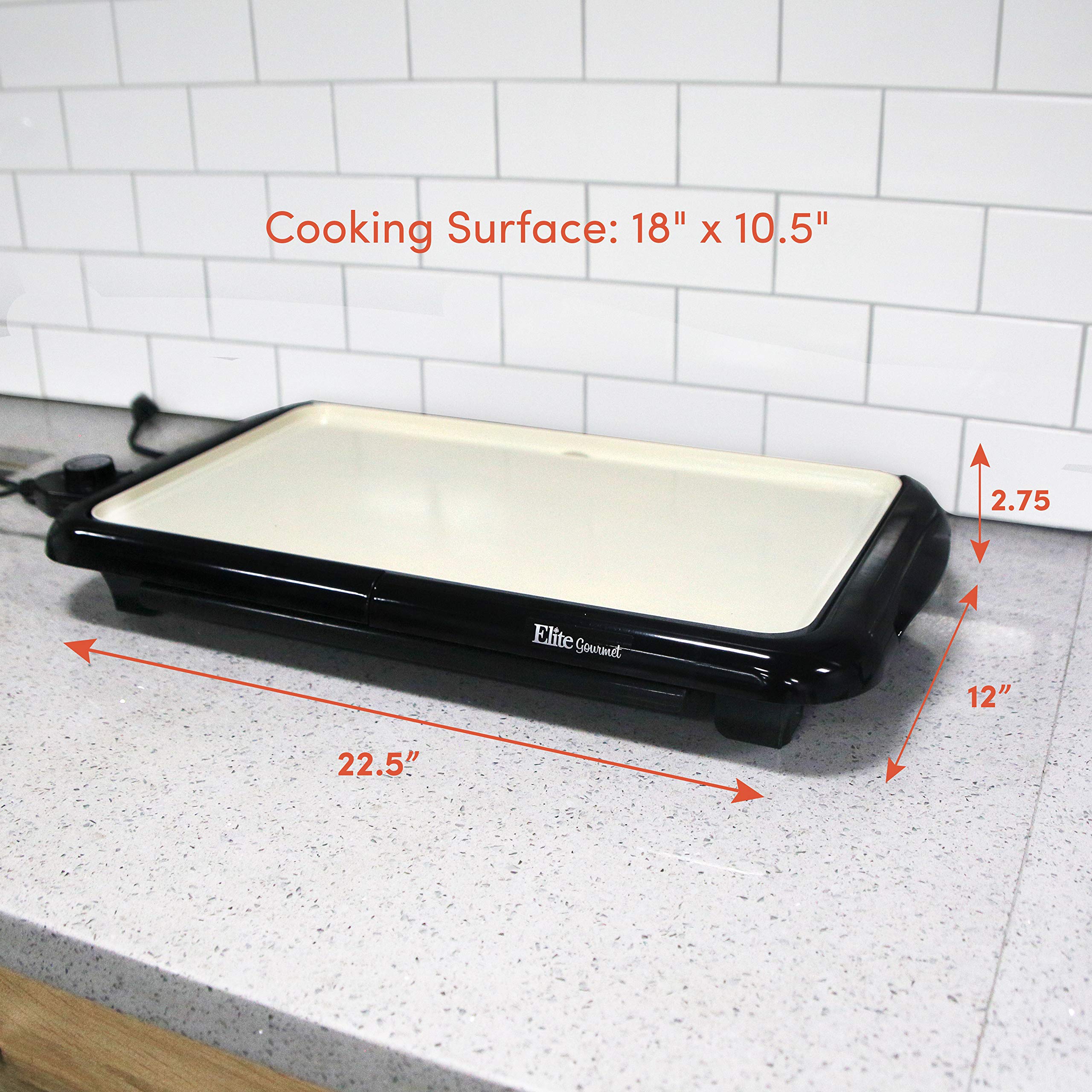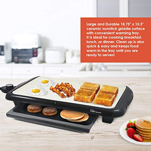 The super-sized Elite Gourmet Non-stick Electric Griddle has a whopping 189-Sq inch cooking surface perfection for family-sized portions. Its extra large size is great for large batches of pancakes, french toast, or your favorite fried eggs yet also compact enough to easily bring on an RV or camping trip. The flat cooking plate heats quickly and evenly and the removable, adjustable thermostat allows you to select the perfect temperature for cooking a variety of low-fat healthy meals. It is quick and easy to clean due to its ceramic finish which also allows for easy food release. Features also include a removable and dishwasher safe warming drawer to keep food warm while cooking other foods.