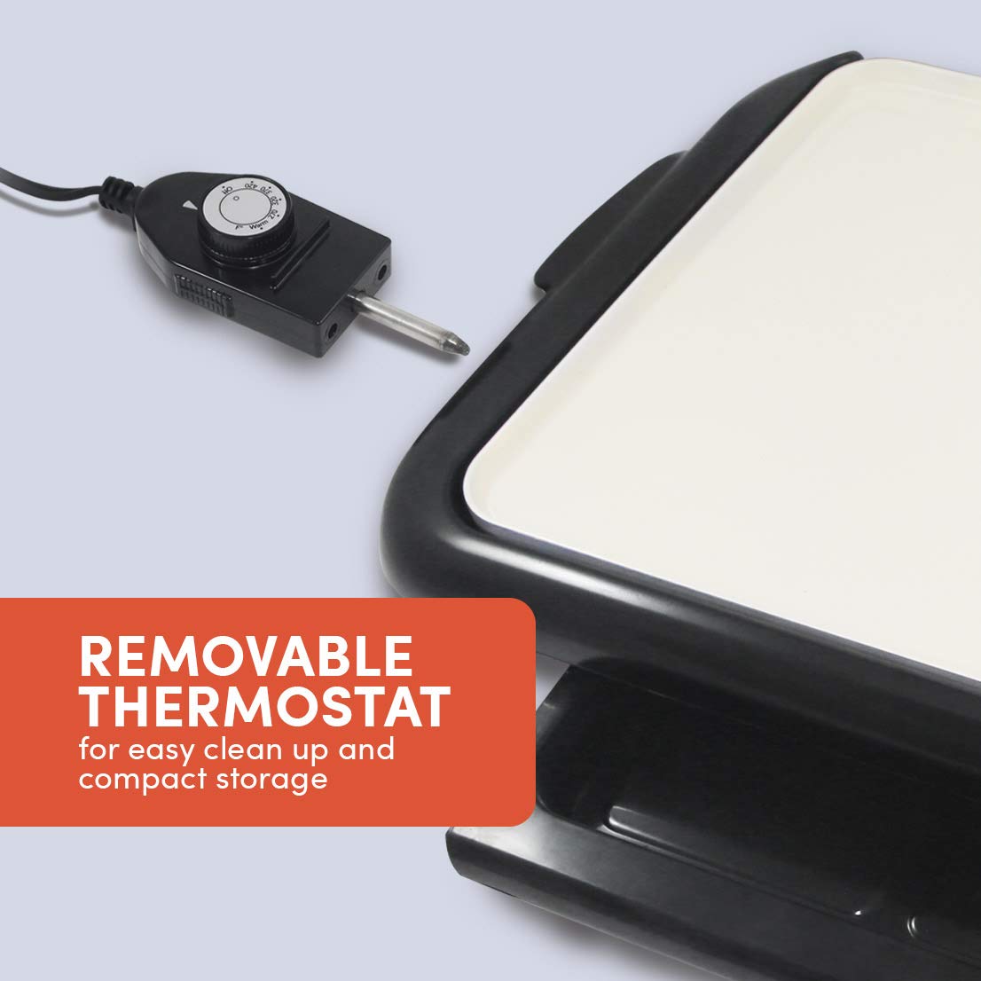 EASY, FAST & HOT, the 1450 Watt die-cast non stick griddle heats up in mere minutes with an adjustable thermostat up to 400°F, saving you time and energy.