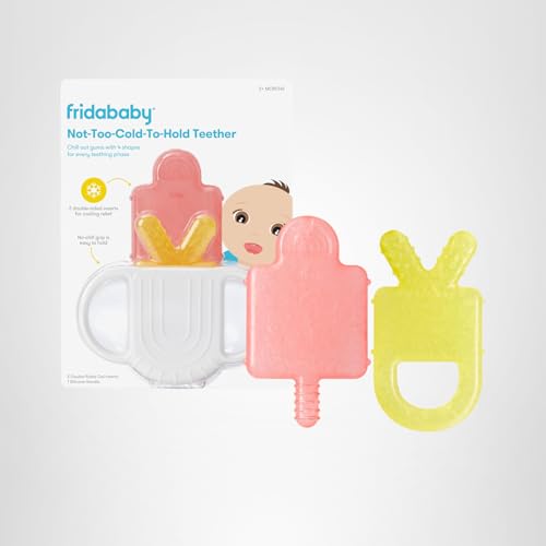 Skip the chilly teething rings and help baby's gums without getting frostbite on their hands. The Not-Too-Cold-To-Hold Teether has a stay-warm handle for baby to hold, with two double-sided, chillable gum massagers made of BPA-free silicone. Each of the four sides is designed with shapes and textures for baby's chomping pleasure while stimulating gums in the front + back.