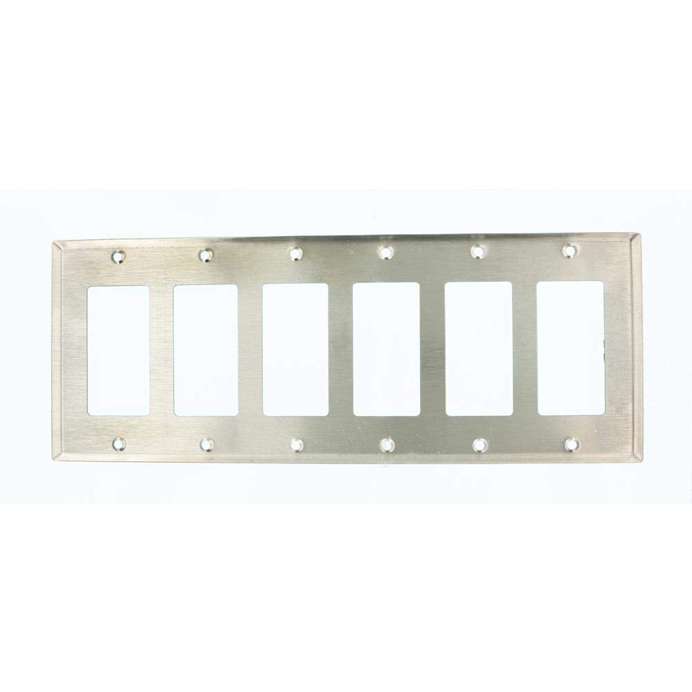 Product Description Leviton 84436-40 6-Gang Decora/GFCI Device Decora Wallplate, Device Mount, Stainless Steel From the Manufacturer Leviton Combination Wallplates come in a variety of configurations and gangs, and are available in a broad selection of materials including, aluminum, brass, stainless steel and plastic, and in an assortment of colors. If you have a unique application, Leviton can also customize a wallplate for a specific job.6-Gang Decora/GFCI Device Decora (R) Wallplate, Device Mount, Stainless Steel. Decora is a registered trademark of Leviton Mfg. Co., Inc.