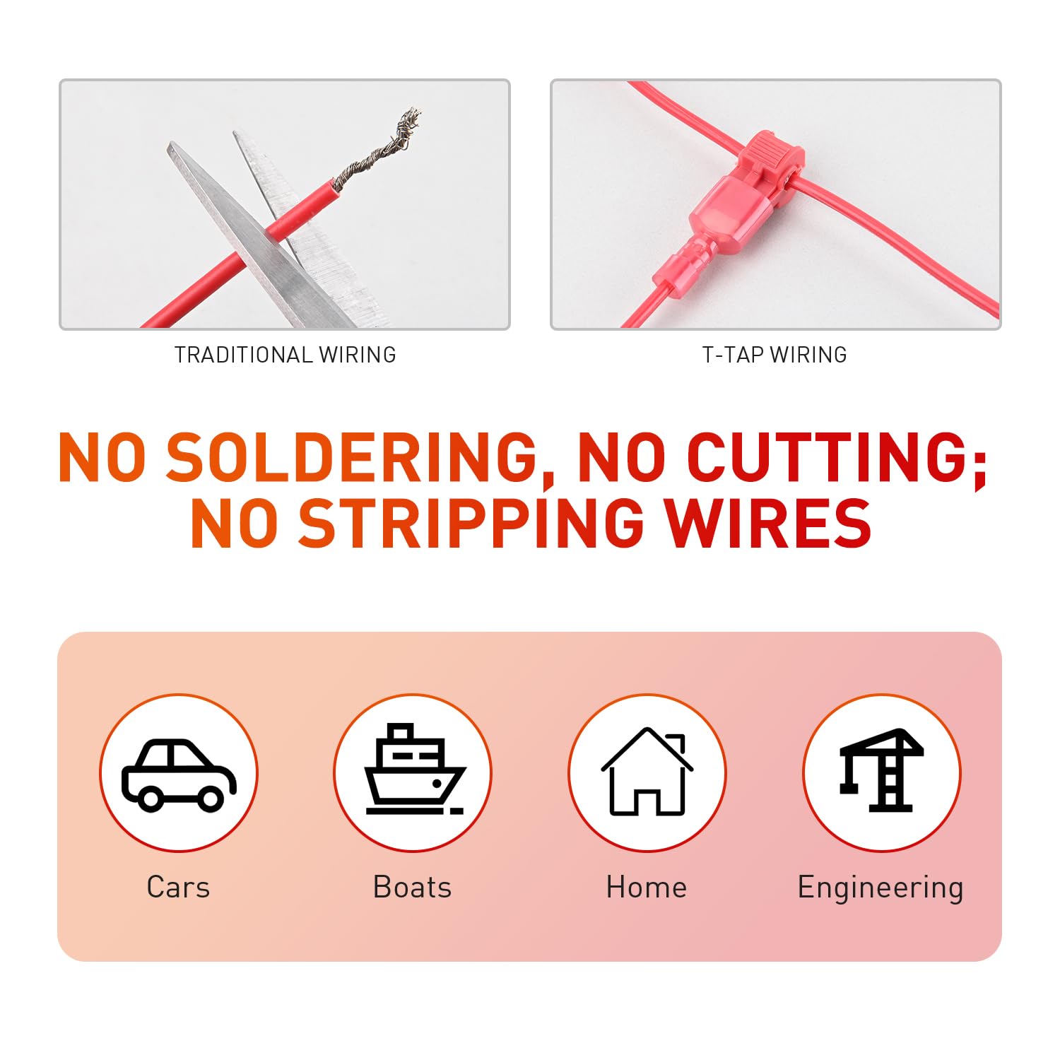 Firm connection:Thicker tinned copper contacts will not bend even when tapping into thicker wires. T-TAP connector will be firmly mounted on the wire. The housing will not open easily after being snapped on the wire.