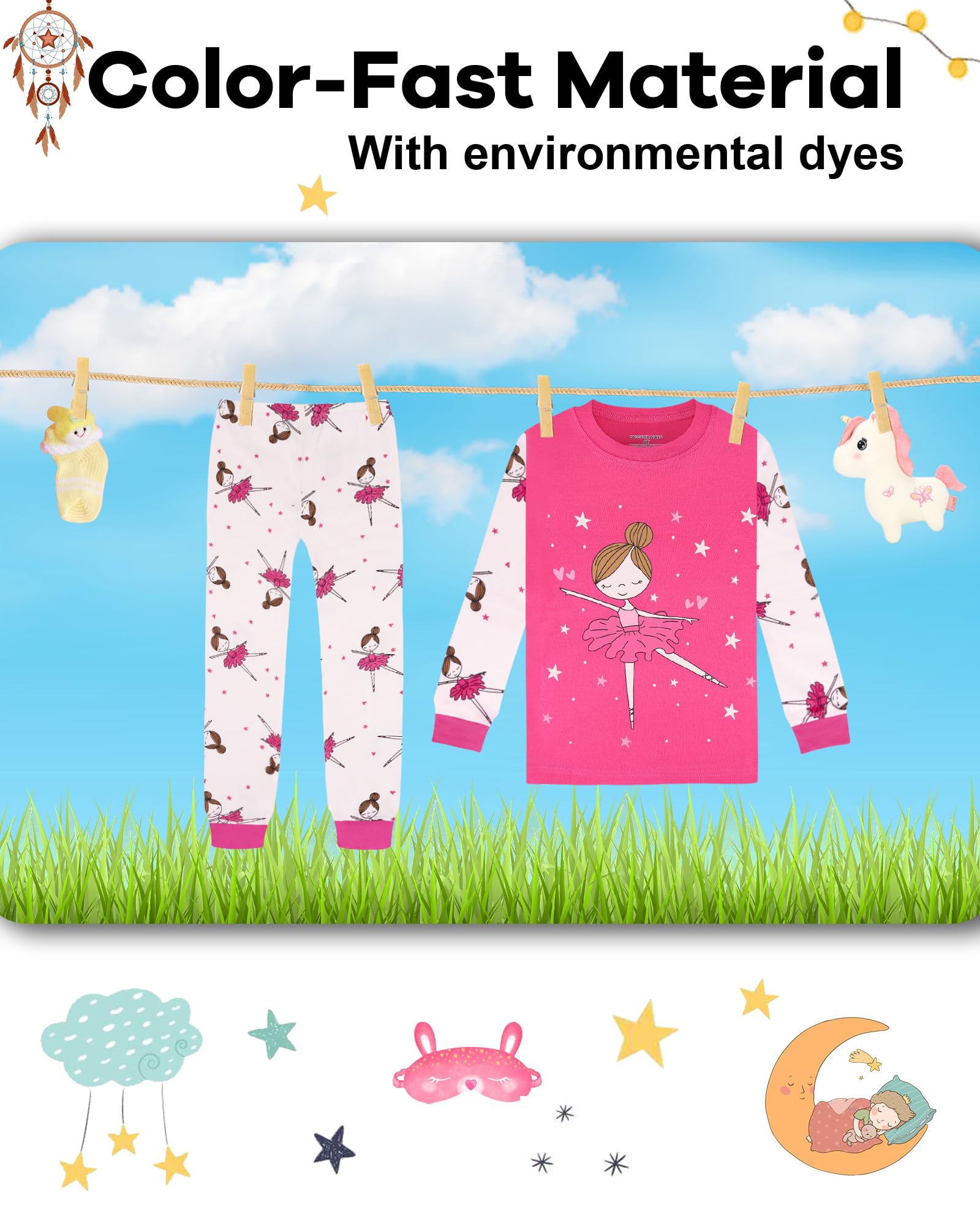 Cute Prints & Perfect Choice: Colorful and diverse design Girl's Pajamas Sets. The professional team designs feature fashionable and unique theme patterns, such as unicorn themes, mermaid themes, dinosaur themes, and ballerina themes, which are sure to delight any toddler girl. And there are great girls jammies for sleeping or playing at home, as well as cute presents for kids' birthdays, parties, festivals, and so on