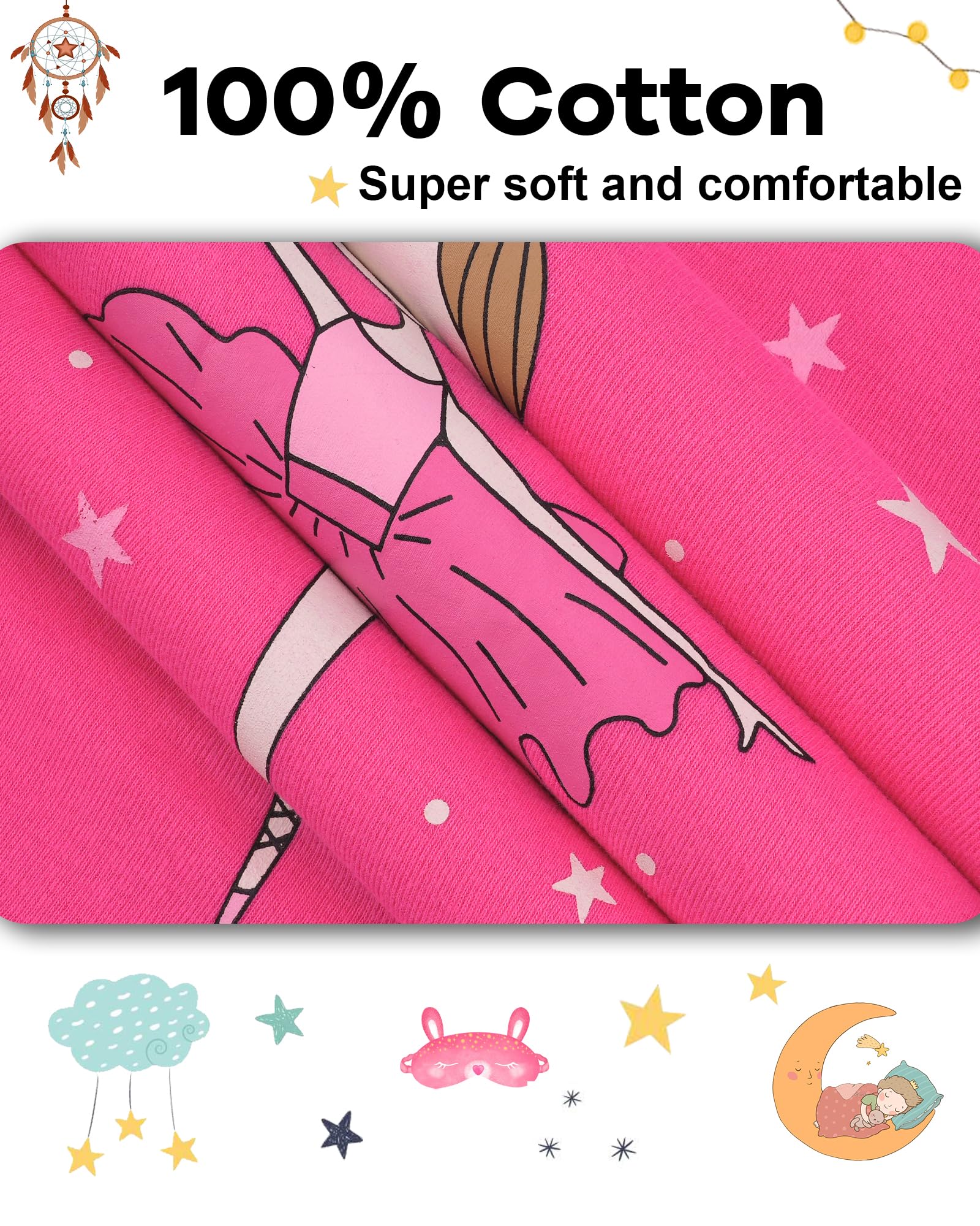 100% Cotton: The Girls PJ Sets with 4pc are 100% cotton, which are very soft, breathable, and lightweight. The natural cotton long sleeve pajamas for girls ensure your little ones are sleeping soundly and in style, are also good for children's skin. We have been dedicating to providing kids with super comfy pajamas