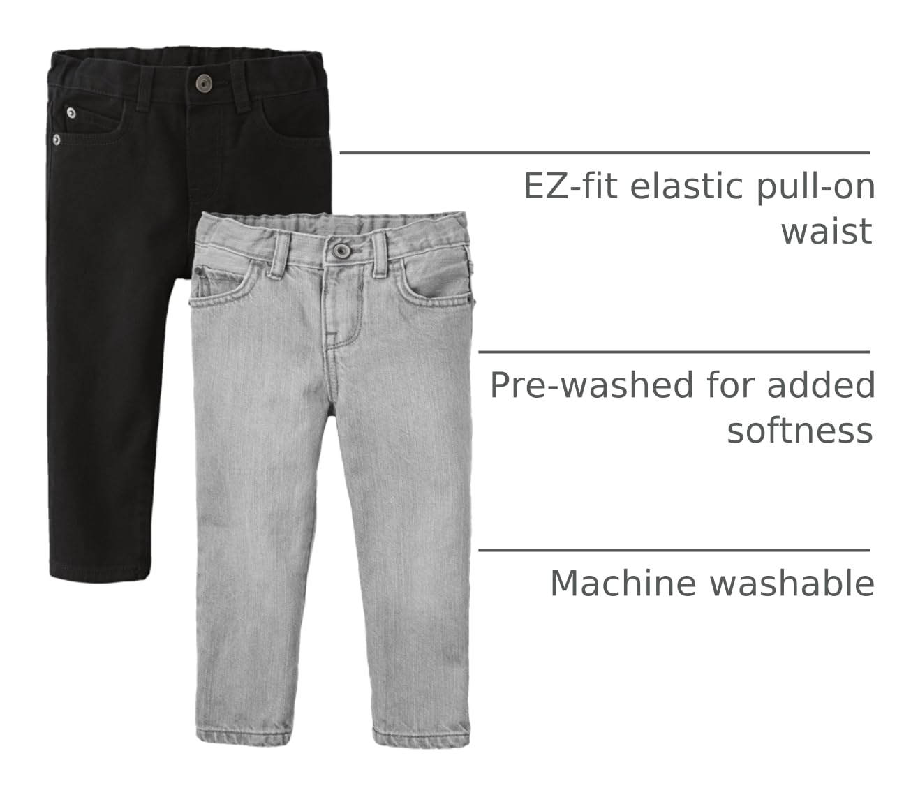 A sleek silhouette 2-pack with 5-pocket styling, EZ-fit elastic pull-on waist with inner adjustable tabs, snap closure and no-zip fly
