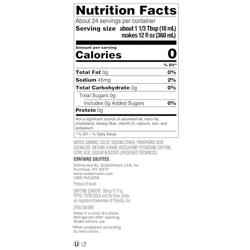 Discover the fizz-tastic world of SodaStream with the Diet Pepsi Beverage Mix! Perfect for those who love crafting their own soda, this mix lets you transform your SodaStream sparkling water into the iconic taste of Diet Pepsi in mere seconds. Each 14.9 Fl Oz bottle in this pack of four creates approximately 2-2.5 gallons of delicious, sugar-free cola, giving you a grand total of about 9.5 Gallons of refreshing fun. SodaStream is your go-to brand for endless sparkling possibilities, and this Diet Pepsi is a game-changer for soda enthusiasts who crave a healthier option without sacrificing flavor. Ideal for lively gatherings, cozy movie nights, or just a refreshing treat after a long day, this mix caters to anyone who loves light, crisp and refreshing cola with Zero Calories. Whether you're a SodaStream machine newbie or a seasoned pro, this mix is easy to use. Just fizz your water, add the mix, and enjoy! Remember, always fizz your pre-chilled water before adding any flavor to get the perfect blend every time. Dive into the world of SodaStream and elevate your sparkling water experience with Diet Pepsi Beverage Mix!