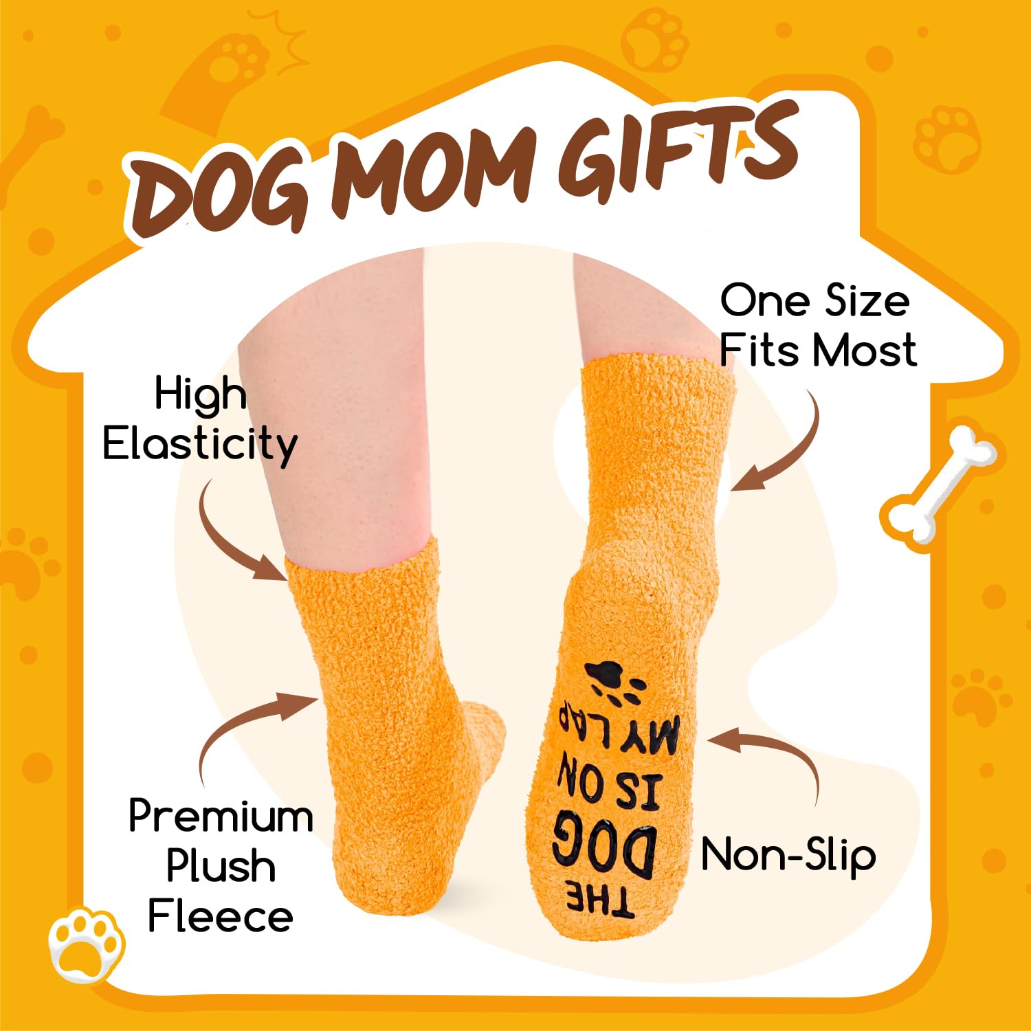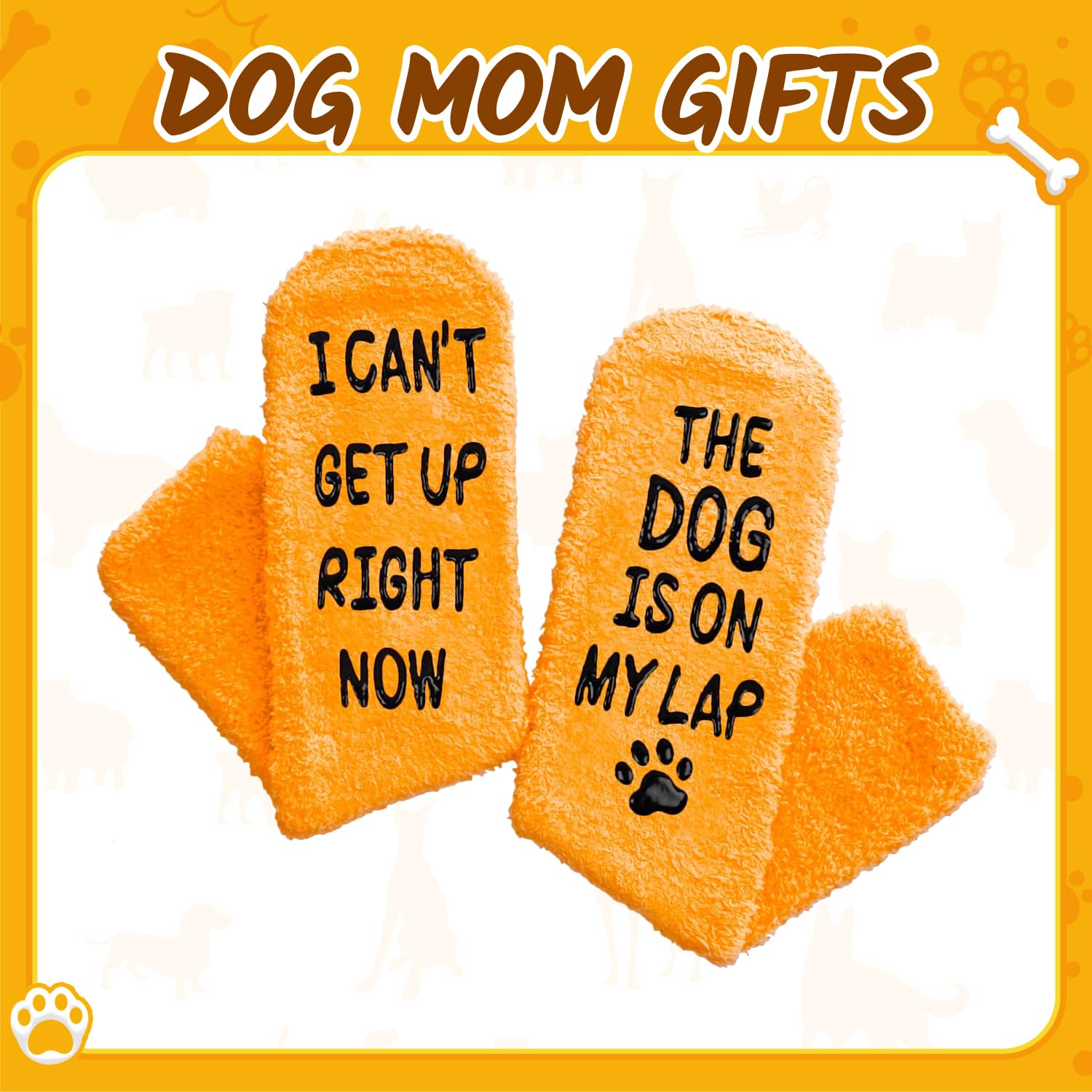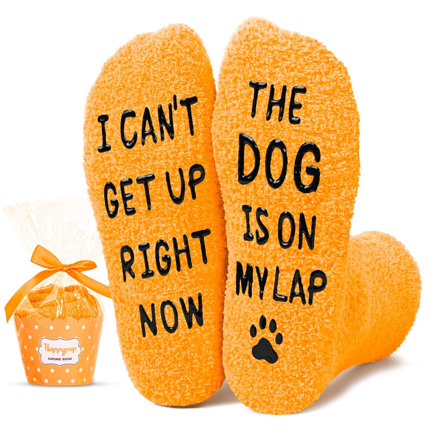 FUZZY DOG LOVER SOCKS: These orange fuzzy socks feature cute dog paws, grippers on the bottom and funny sayings "I CAN'T GET UP RIGHT NOW. THE DOG IS ON MY LAP".