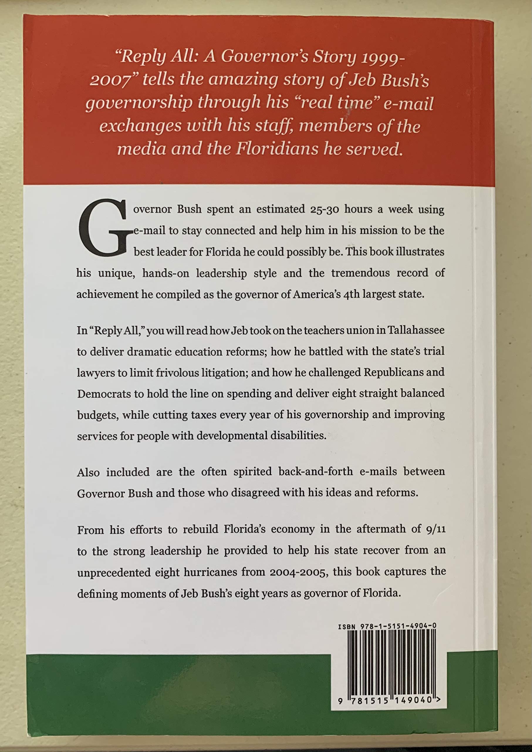 This book tells the story of Jeb Bush's governorship through his email exchanges with his staff, members of the media and the Floridians he served from 1999-2007. Governor Bush spent 25-30 hours a week using email to stay connected to his mission of being the best leader for Florida he could possibly be. This book illustrates his unique, hands-on leadership style and the tremendous record of achievement he compiled as the governor of America's 4th largest state.