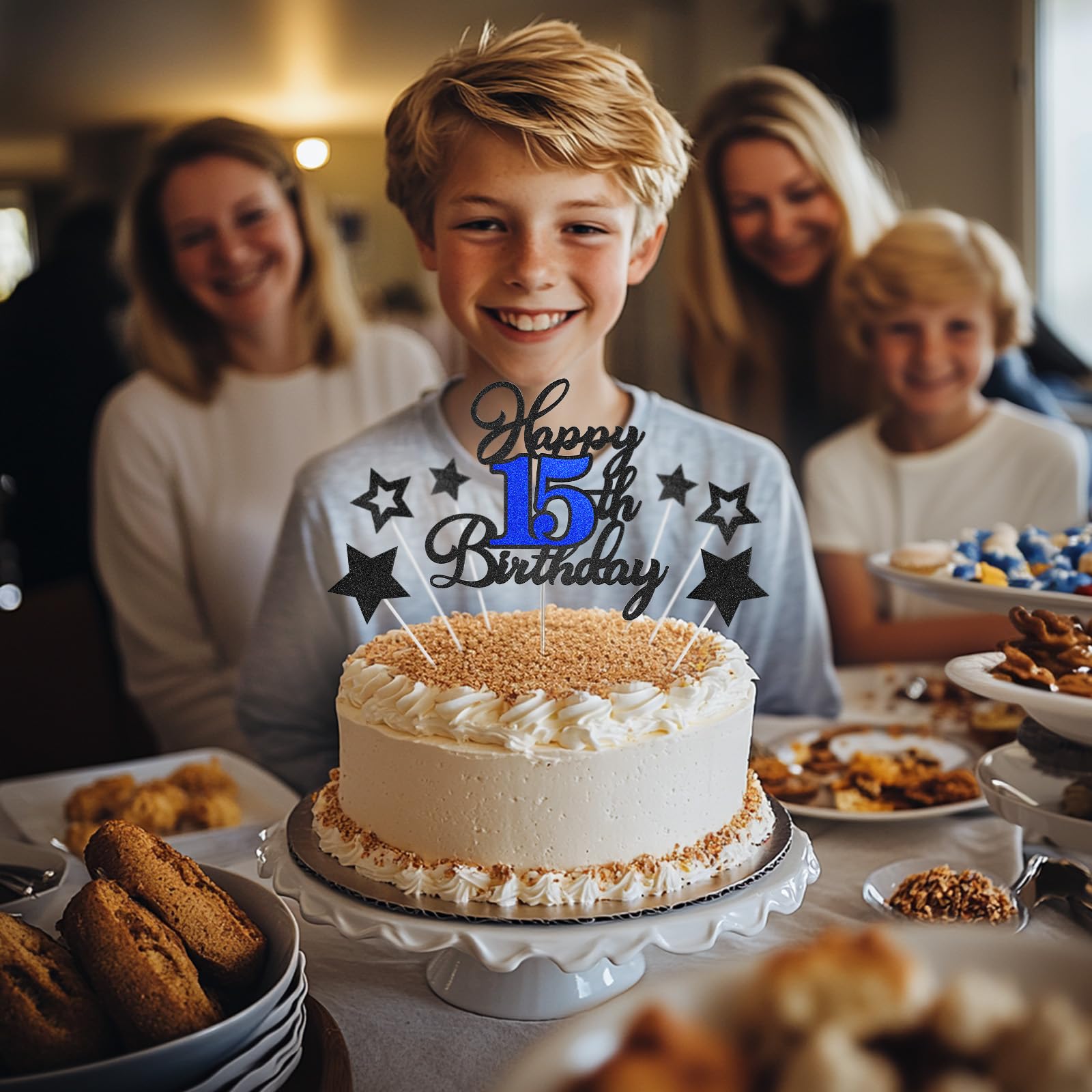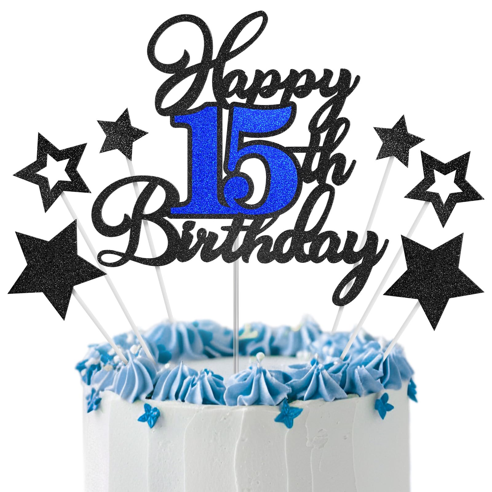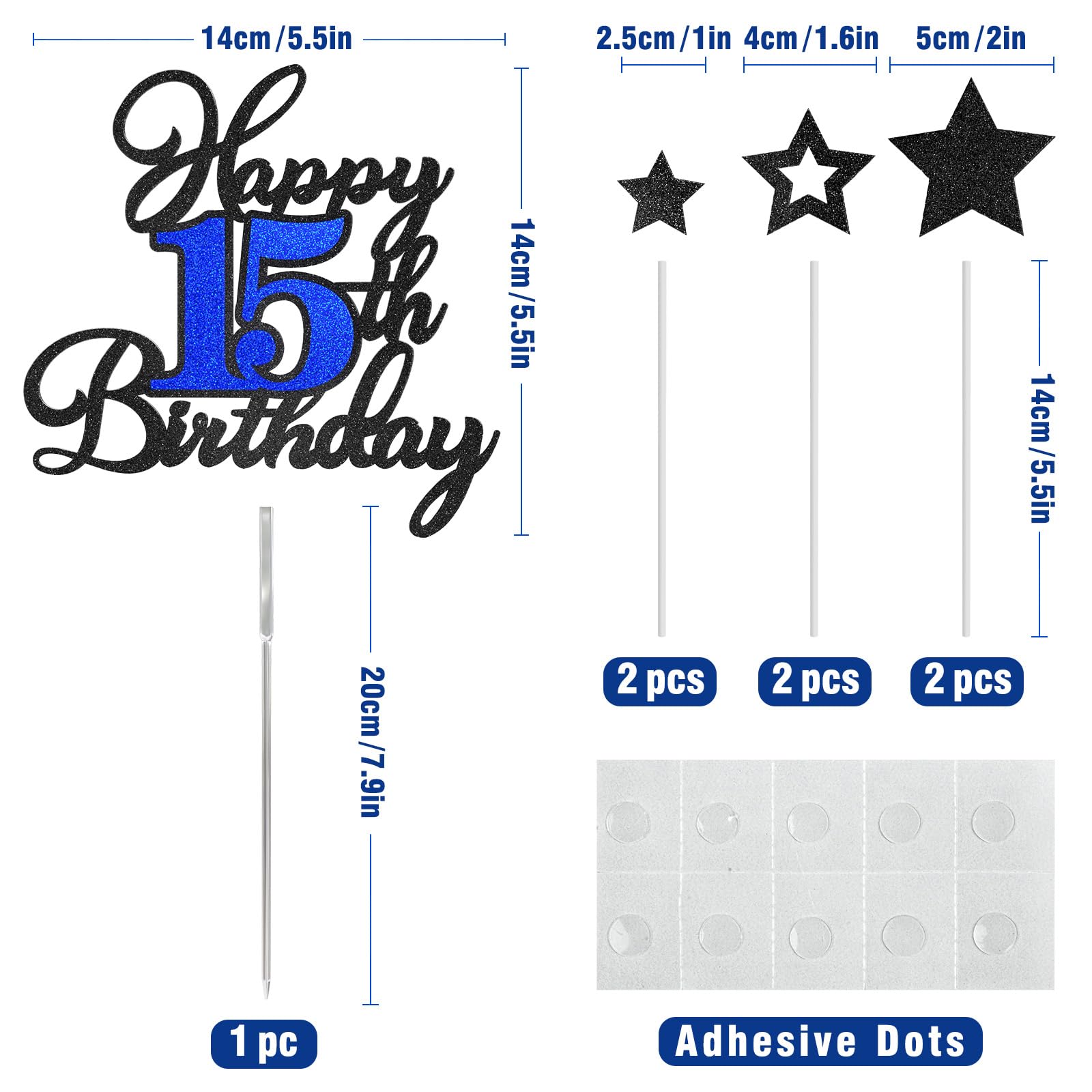 Happy 15th Birthday Cake Topper for Happy Teenager Birthday Theme Party Cake Decorations Supplies. Ideal for happy 15 birthday theme party, 15th anniversary theme party cake decorations supplies. Attention: This cake topper features glitter on one side and is white on the other. It's meant for decoration only, so please do not place it in the oven or microwave. Specifications: Material: - Glitter card stock + Plastic stick - Adhesive dots Package Includes: - 1 pc Happy 15th Birthday cake topper - 1 pc Food-Grade clear plastic stick - 6 pcs Black glitter stars - 6 pcs White plastic sticks - 10 pcs Adhesive dots
