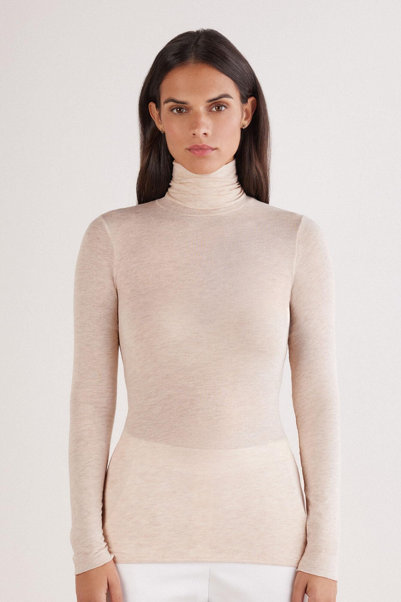 Description This ultralight turtleneck is crafted from a modal and cotton blend with a touch of cashmere for added softness. A sleek high neck top with soft, comfortable coverage, it features smooth lines that elevate everyday looks. The breathable fabric makes it a perfect base layer, offering lightweight comfort under sweaters, blazers, or jackets without feeling bulky. A sleek high neck top with soft, comfortable coverage, it features smooth lines that elevate everyday looks. The minimalist cut flatters the neckline and shoulders, while the second-skin texture creates a clean, seamless silhouette. Its ultralight design makes it perfect for layering under jackets in spring and autumn, while offering lightweight comfort indoors on cooler summer evenings. Available in a variety of gorgeous colors, this lightweight turtleneck pairs effortlessly with everything from tailored trousers to casual denim. Whether you're dressing up or keeping it simple, this long sleeve turtleneck offers an easy foundation with lasting appeal.