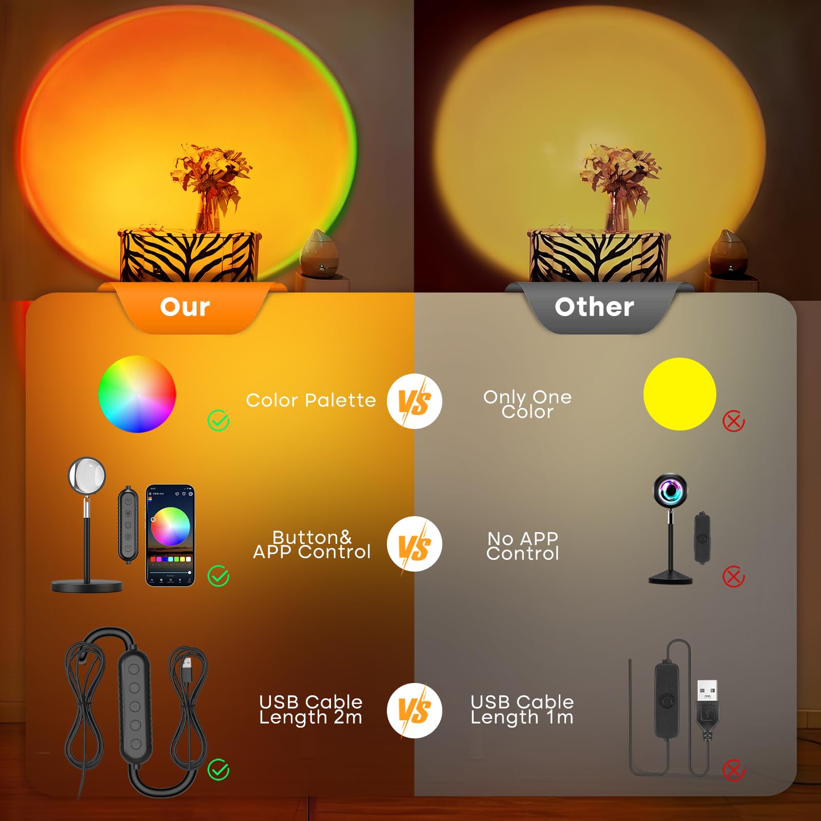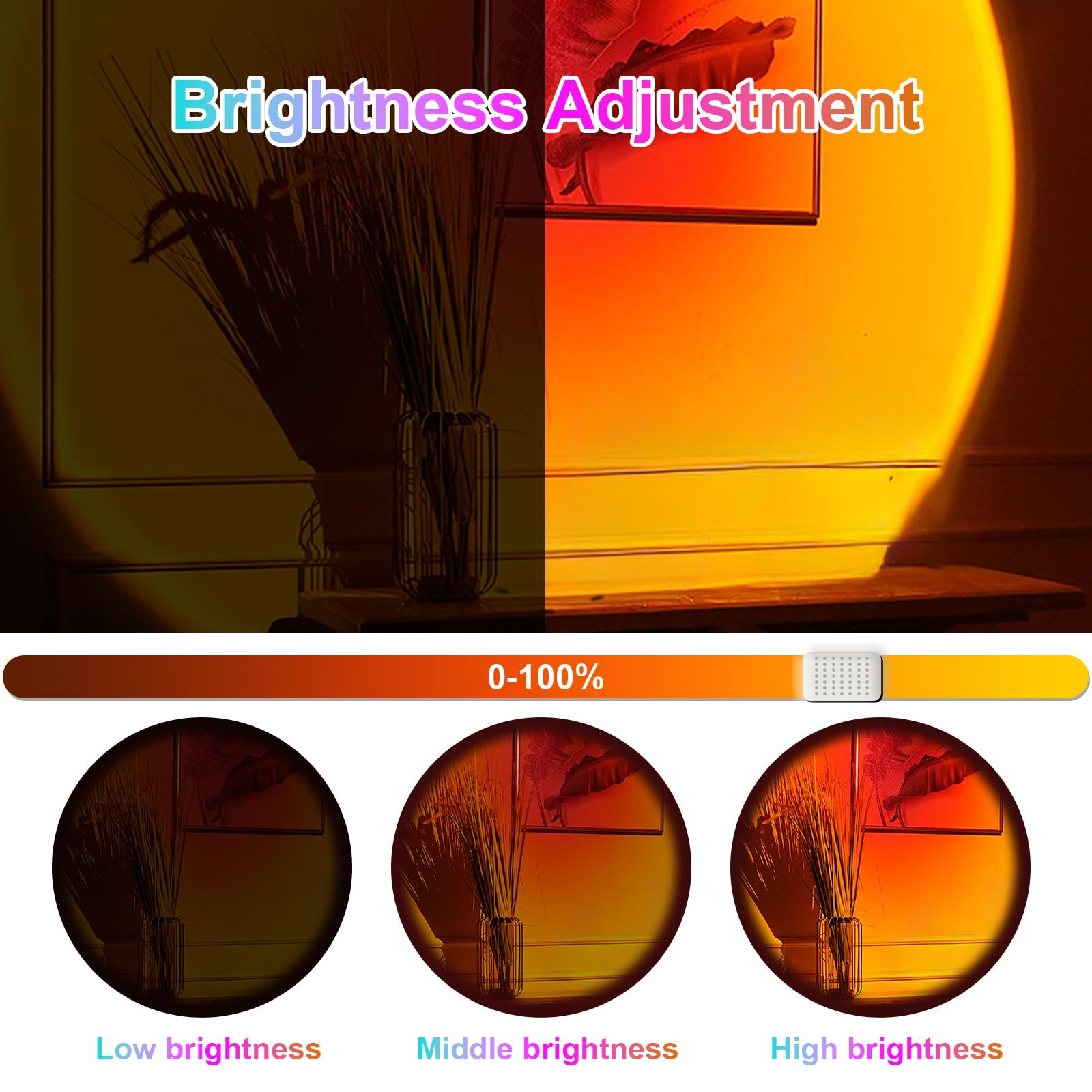 【Smart APP and Button Control】This sunset lamp offers dual control options. You can freely adjust the light's color, brightness, and modes through APP or buttons. The app offers a rich array of color schemes and lighting effects. Different lighting effects provide you with different moods