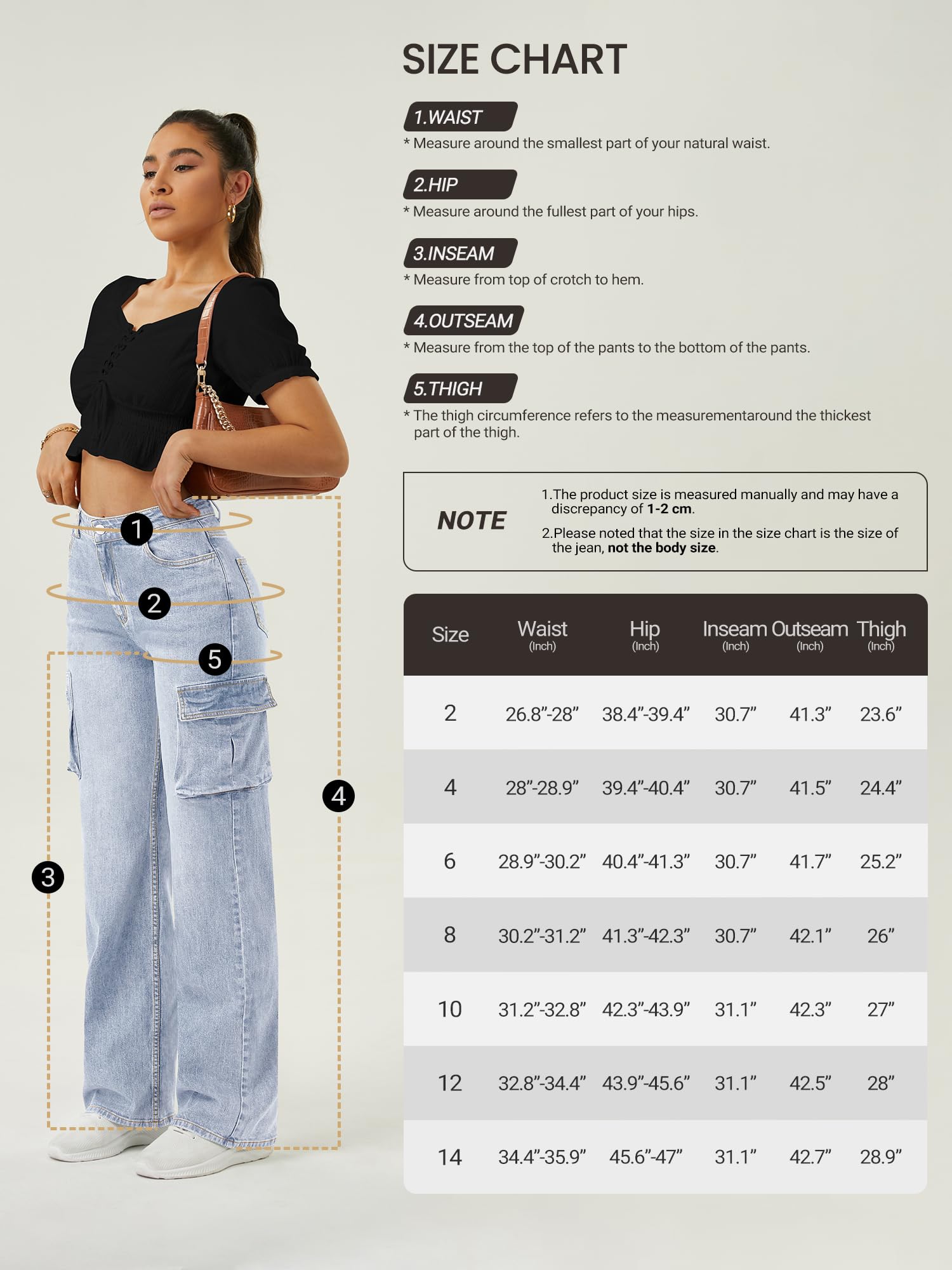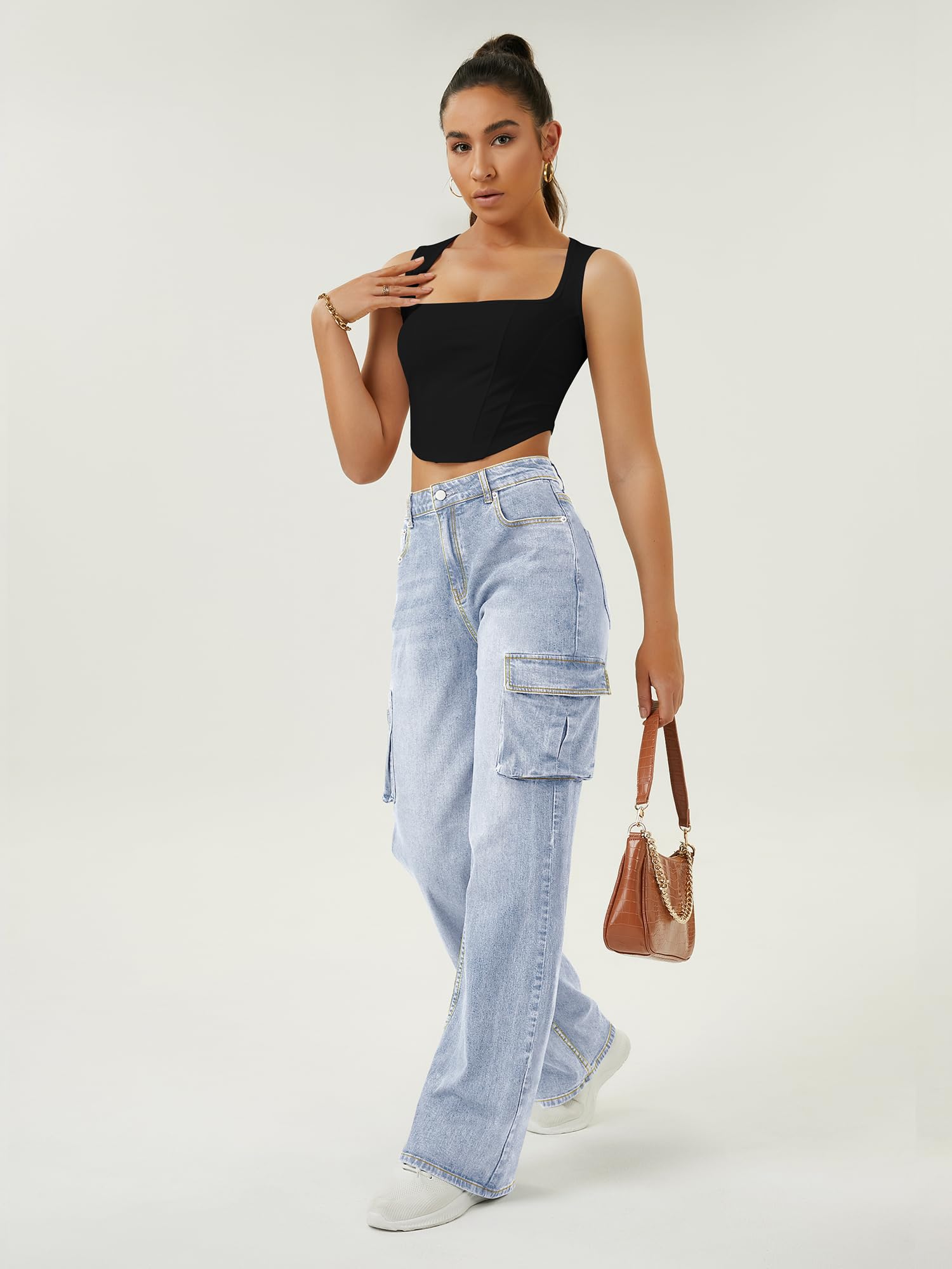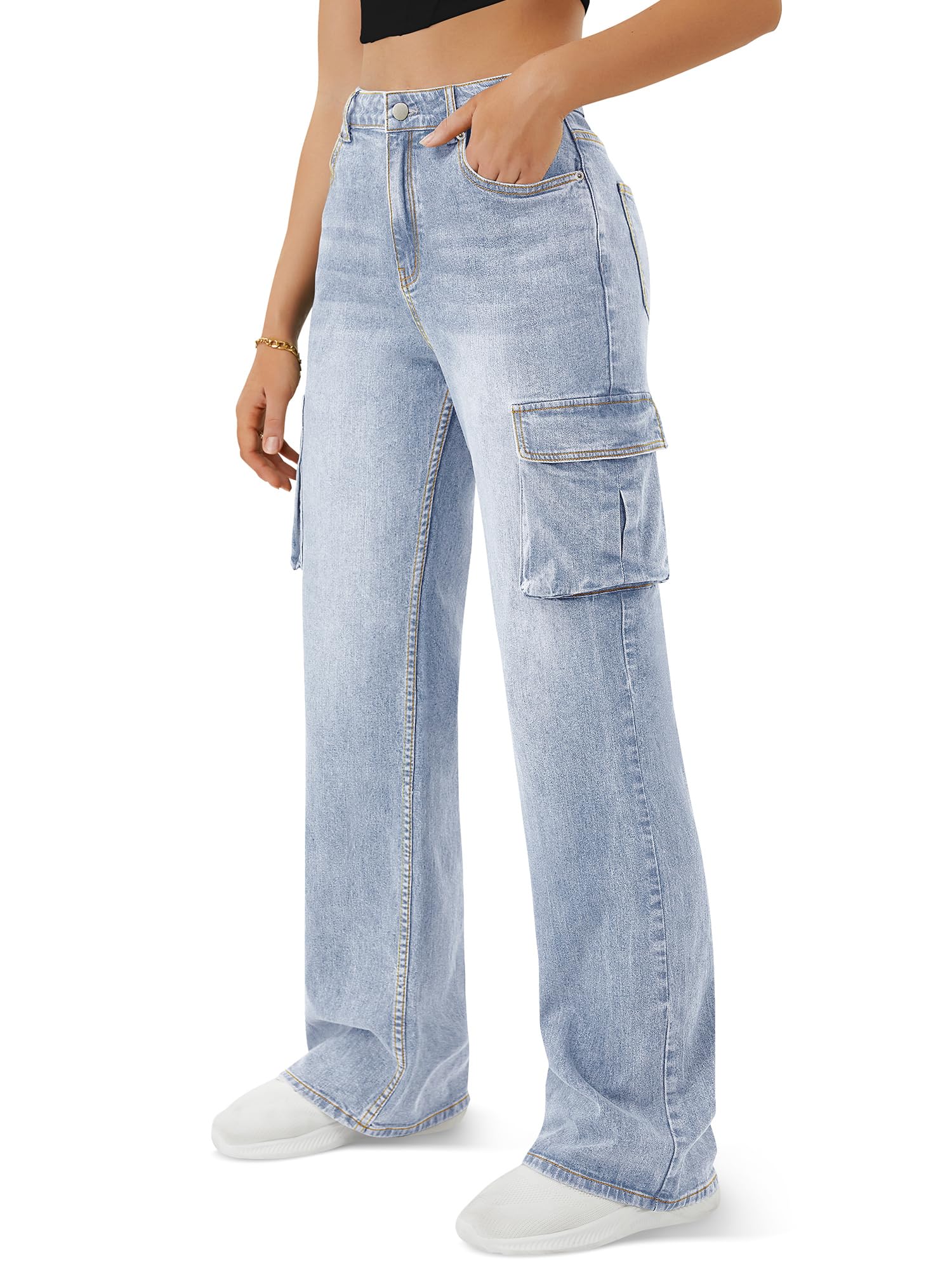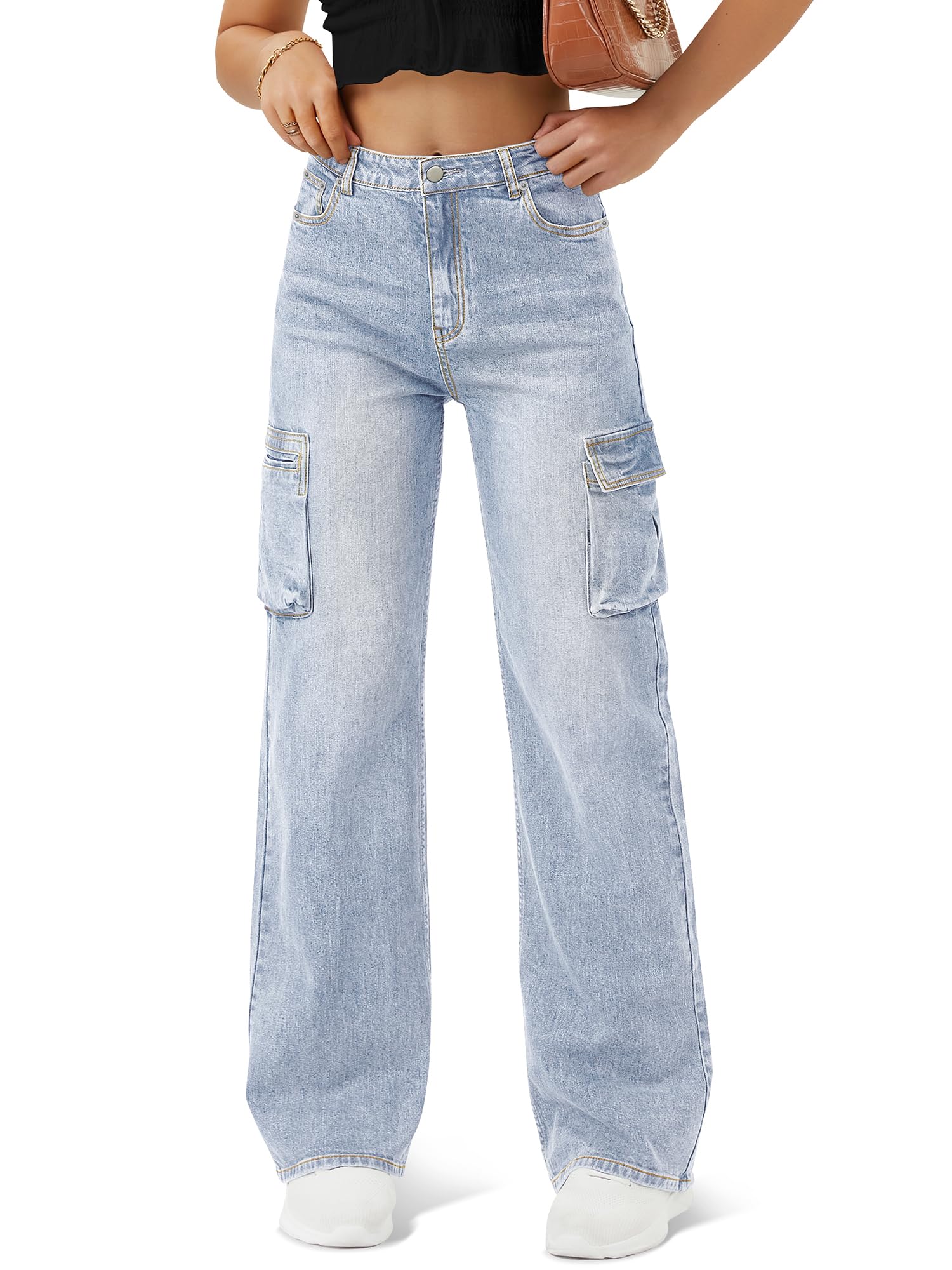 Comfortable High-Waist Fit: These cargo jean women feature a high-waisted design that flatters your figure and provides a comfortable, secure fit, perfect for all-day wear.