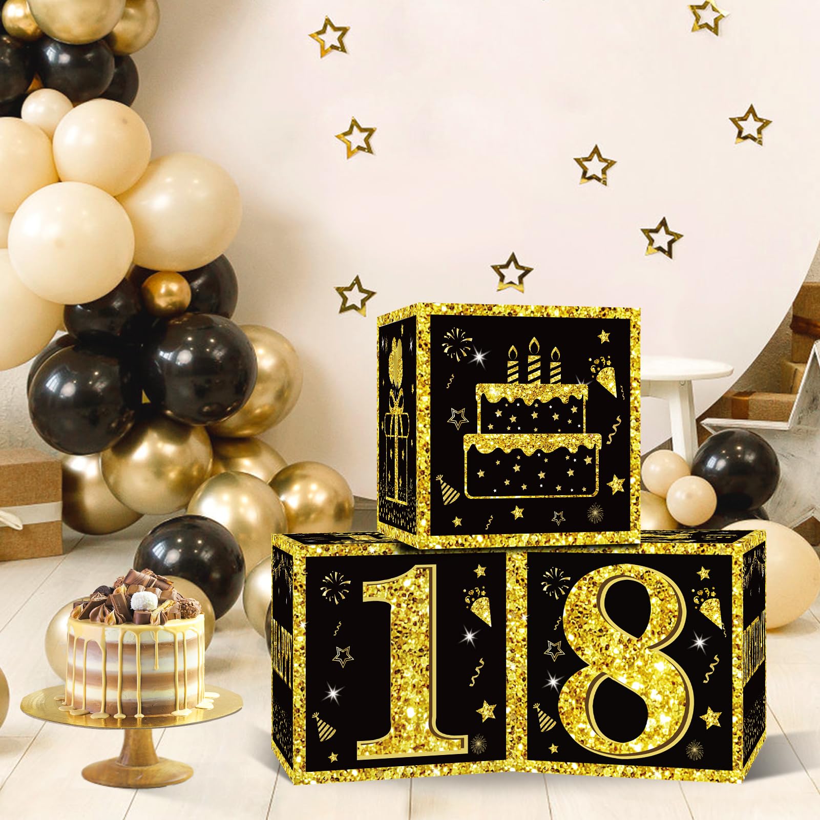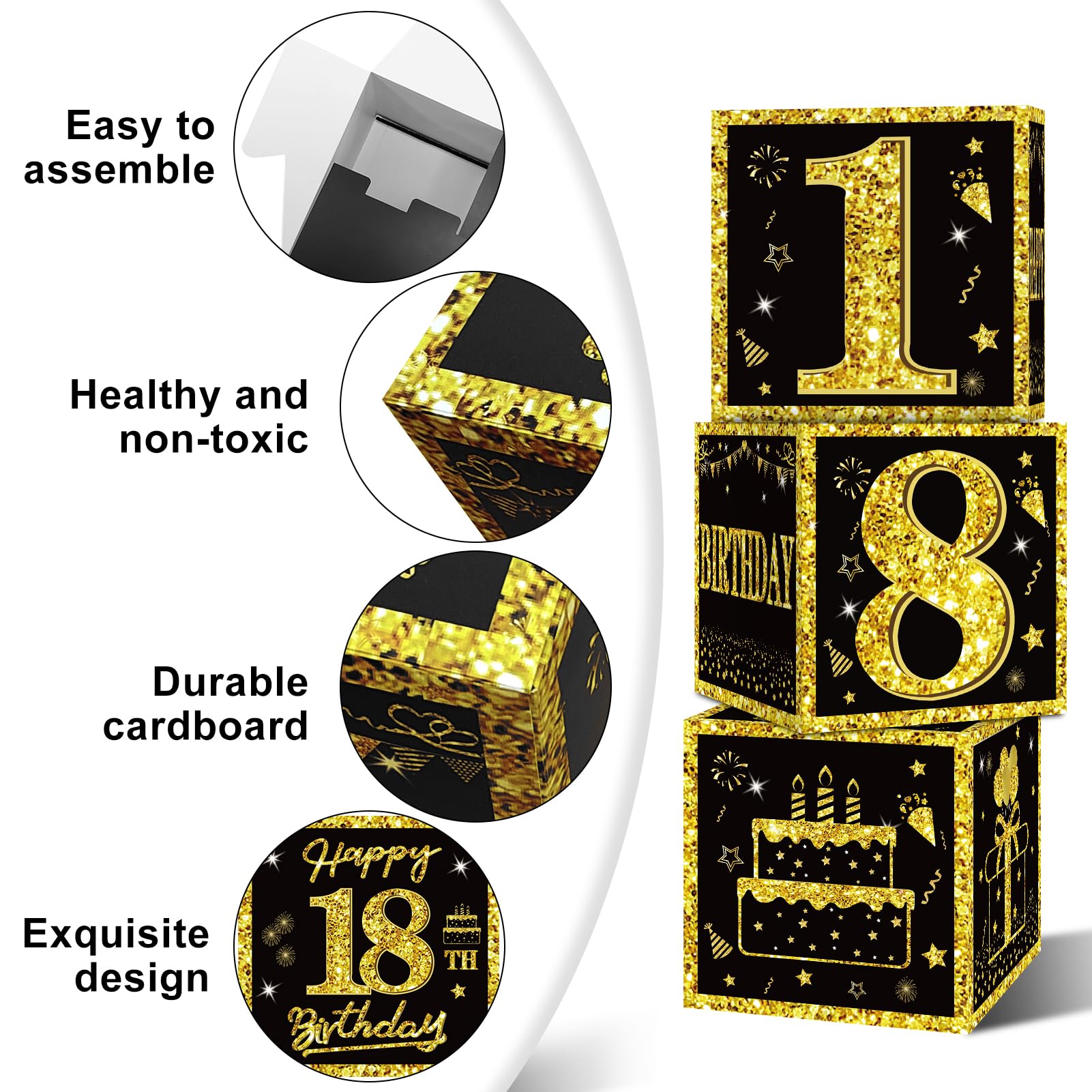 [You Will Receive] -3pcs black gold 18th birthday balloon boxes decorations, the size of each box is 10.62×10.62×10.62inch. This set of great 18th birthday party display decorations. (Note: This set of decorations does not include balloons).