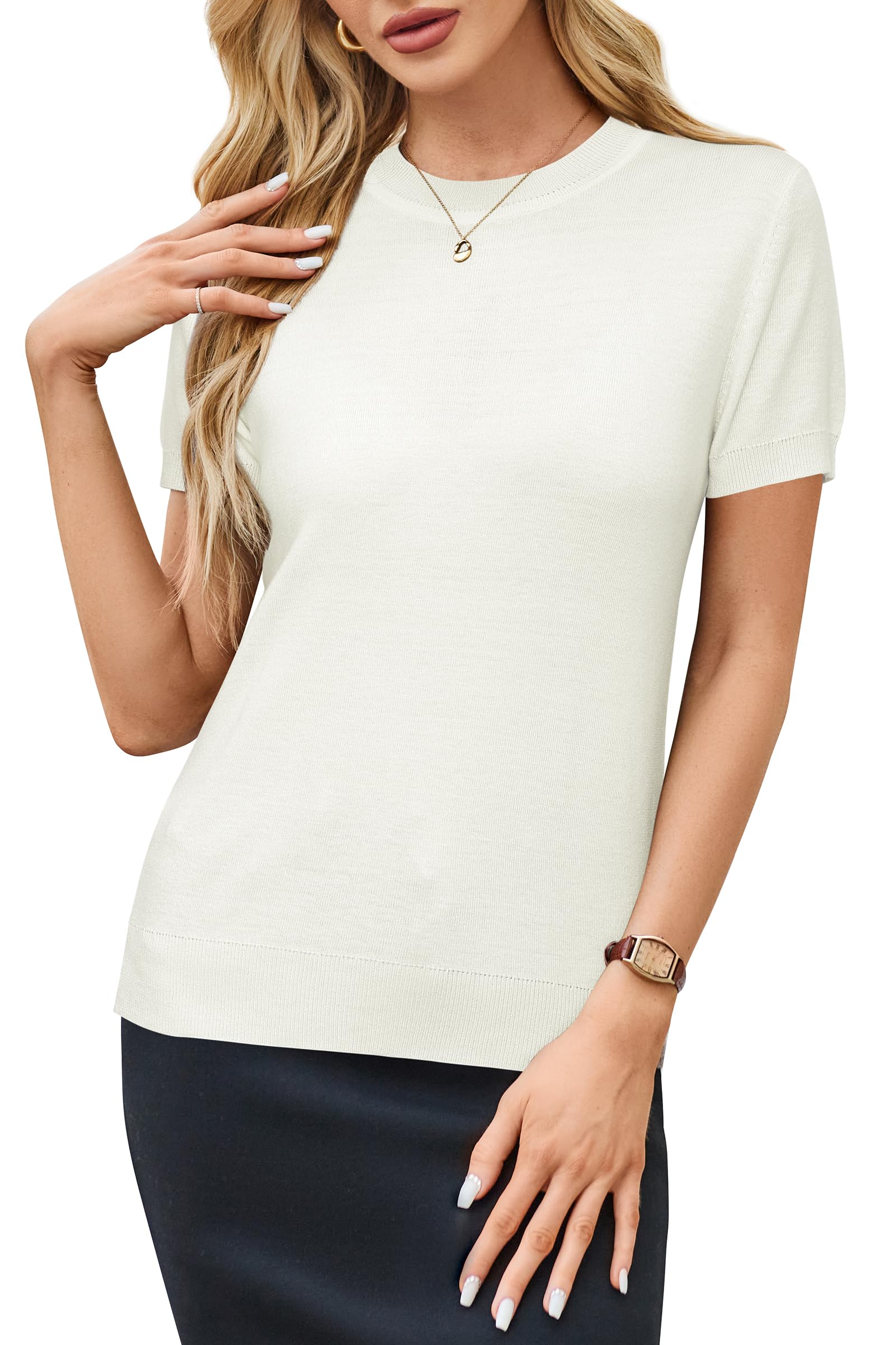 Features: Women's Summer Tops/ Essential Pullover Sweater/ Classic/ Loose Fit/ Short Sleeve/ Crew Neck/ Elastic Hem/ Solid Color
