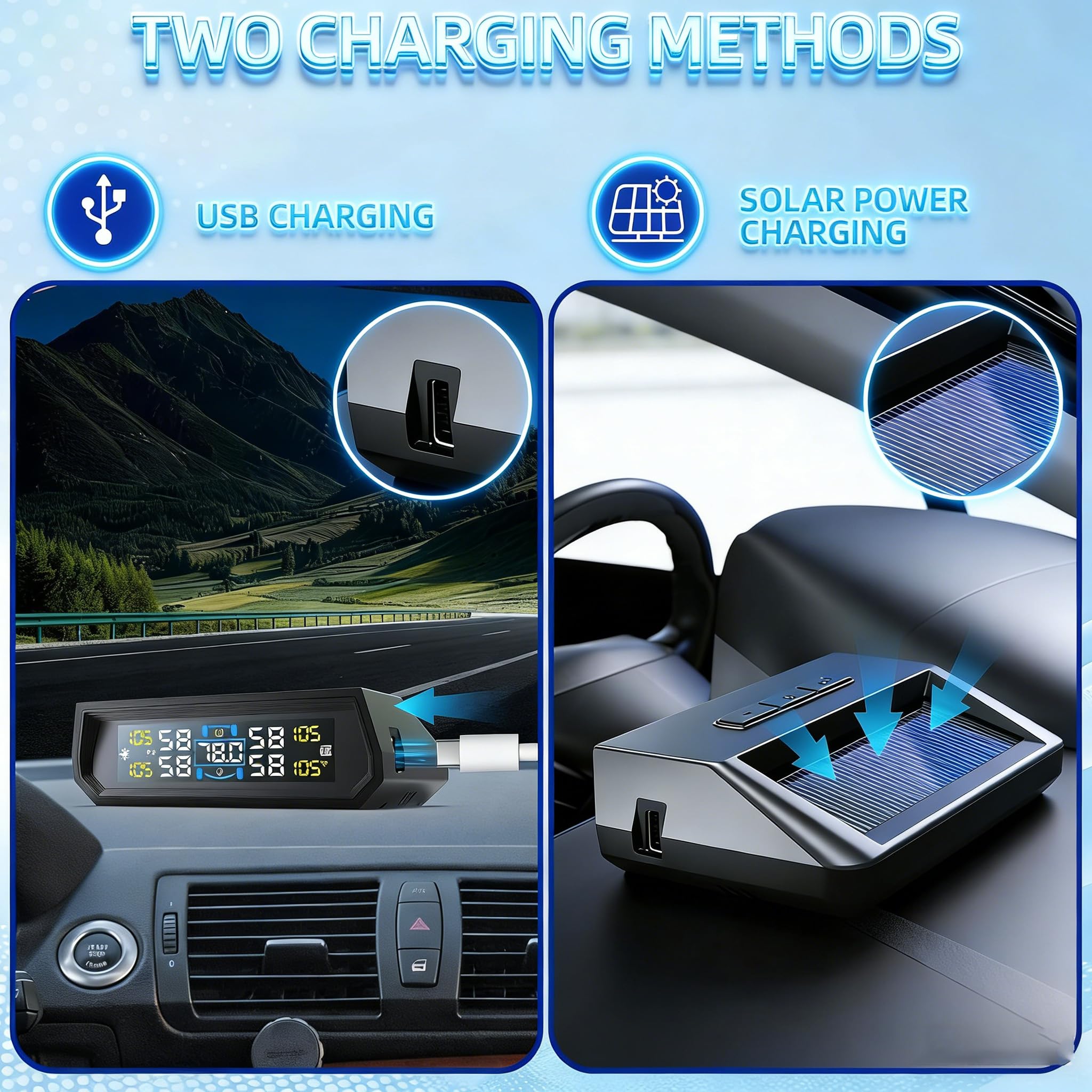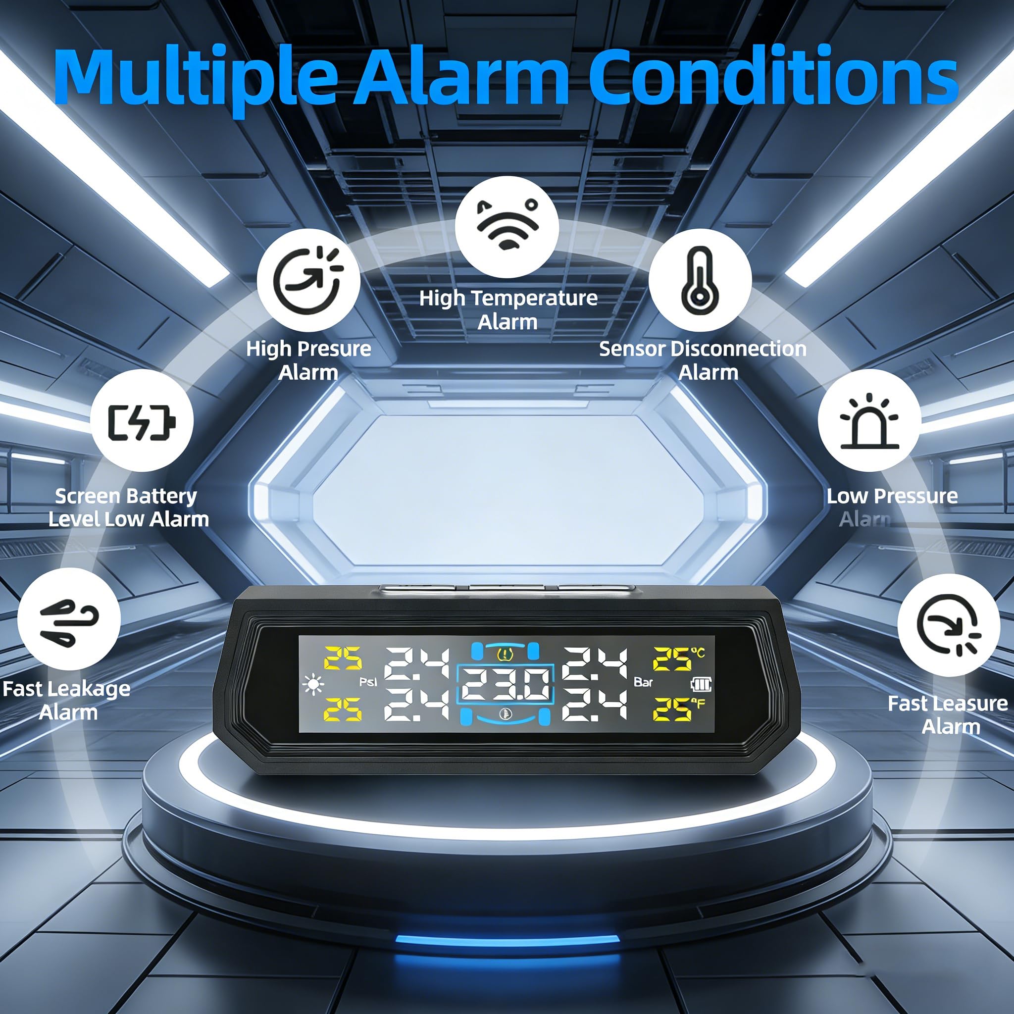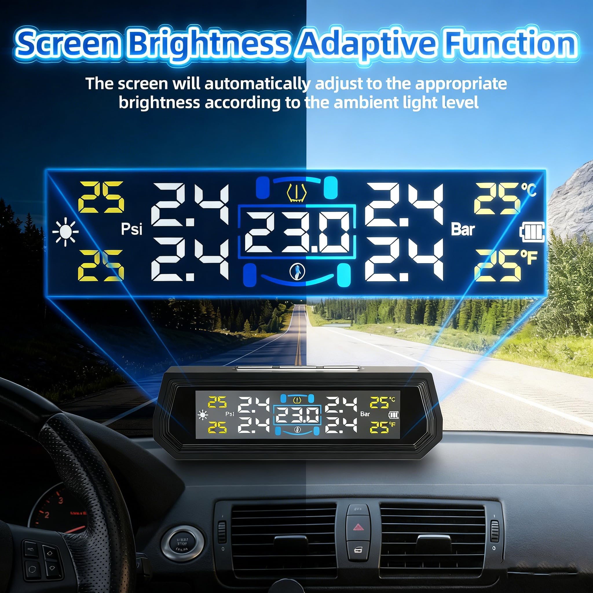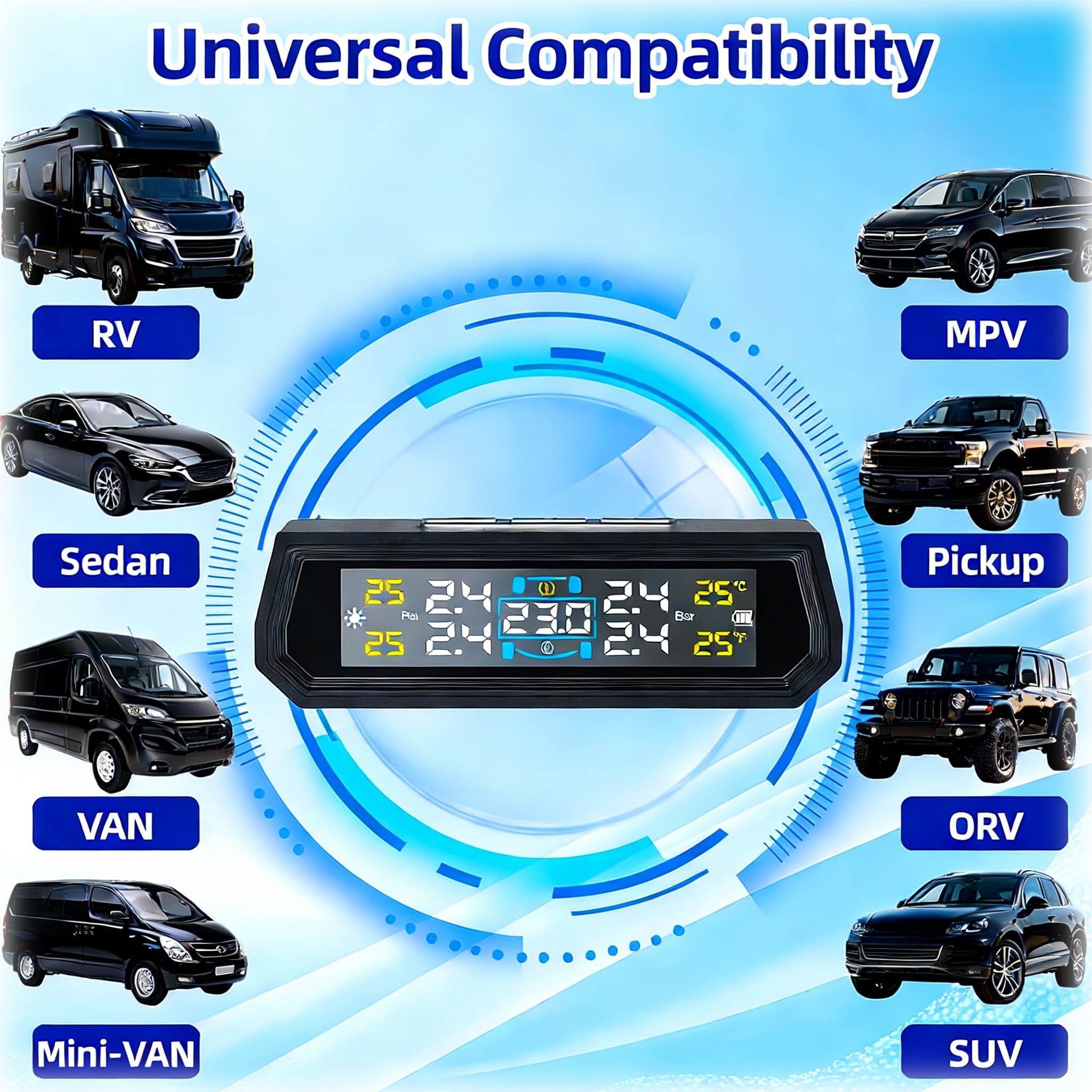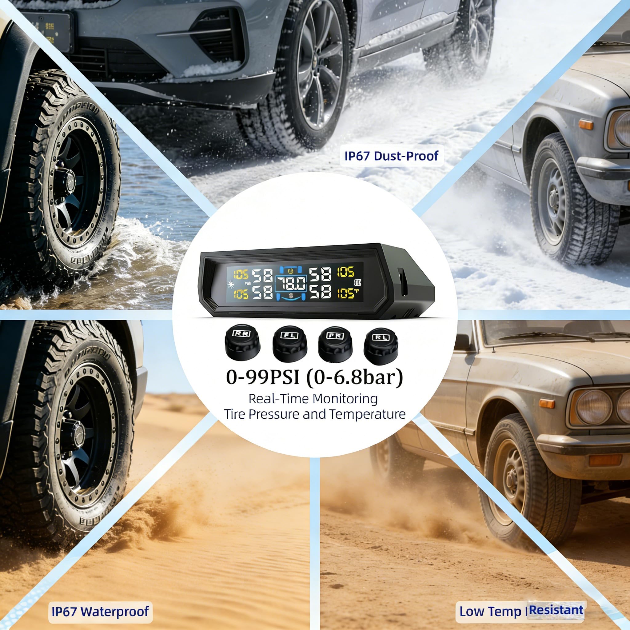 Keep your drives safe and stress-free with our Tire Pressure Monitoring System (TPMS)—the essential tire safety tool for every vehicle owner! This tpms tire pressure monitor system eliminates the hassle of manual tire checks: the external tire pressure sensor installs in seconds (just screw it onto your original valve stem—no professional help needed), and the monitor displays real-time pressure (0-6.8bar/0-99PSI) and temperature (-20°C to 85°C) for each tire, with ±0.1bar/±3PSI precision. You’ll never miss a potential issue, thanks to 6 alarm modes that warn you of high/low pressure, fast leakage, high temperature, and more. Built for durability, the tire pressure sensor has an IP67 waterproof rating, so it performs reliably in rain, snow, or mud. The replaceable CR1632 battery lasts 1-1.5 years, so you won’t need frequent replacements. The monitor itself offers dual charging: solar power keeps it topped up while you drive, and USB charging provides backup for indoor use. Its adaptive screen brightness ensures you can read the display clearly in any light—no squinting in sunlight or straining in the dark. Whether you’re commuting in a sedan, traveling in an SUV, or hitting the road with your rv tire pressure monitoring system or trailer tire pressure monitoring system, this TPMS works seamlessly (15-meter signal range fits most 4-wheel vehicles). It’s lightweight (200g) and compact (packaged in a 16134cm box), making it easy to store and set up. Don’t gamble with tire safety—upgrade to our Tire Pressure Monitoring System today and drive with total confidence!