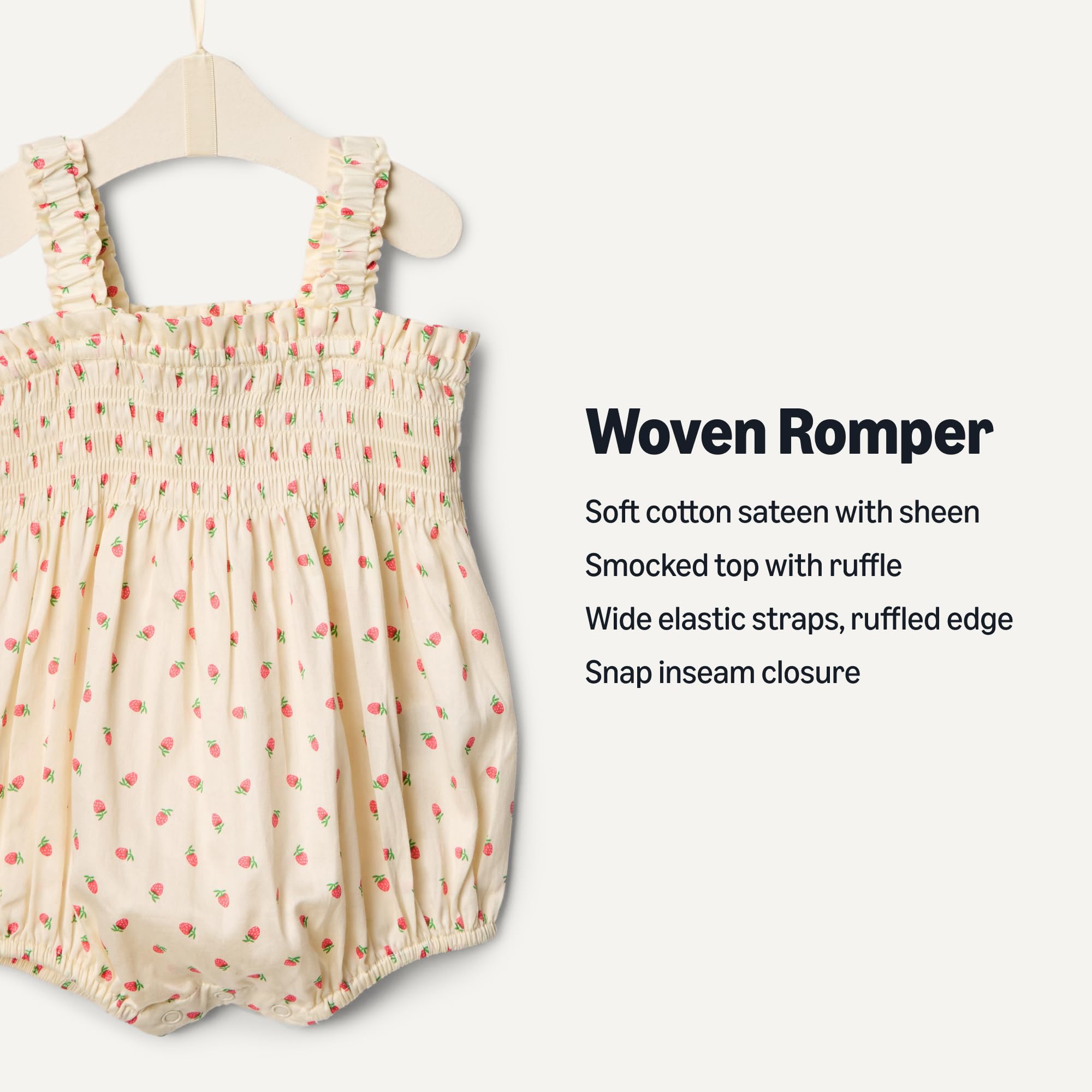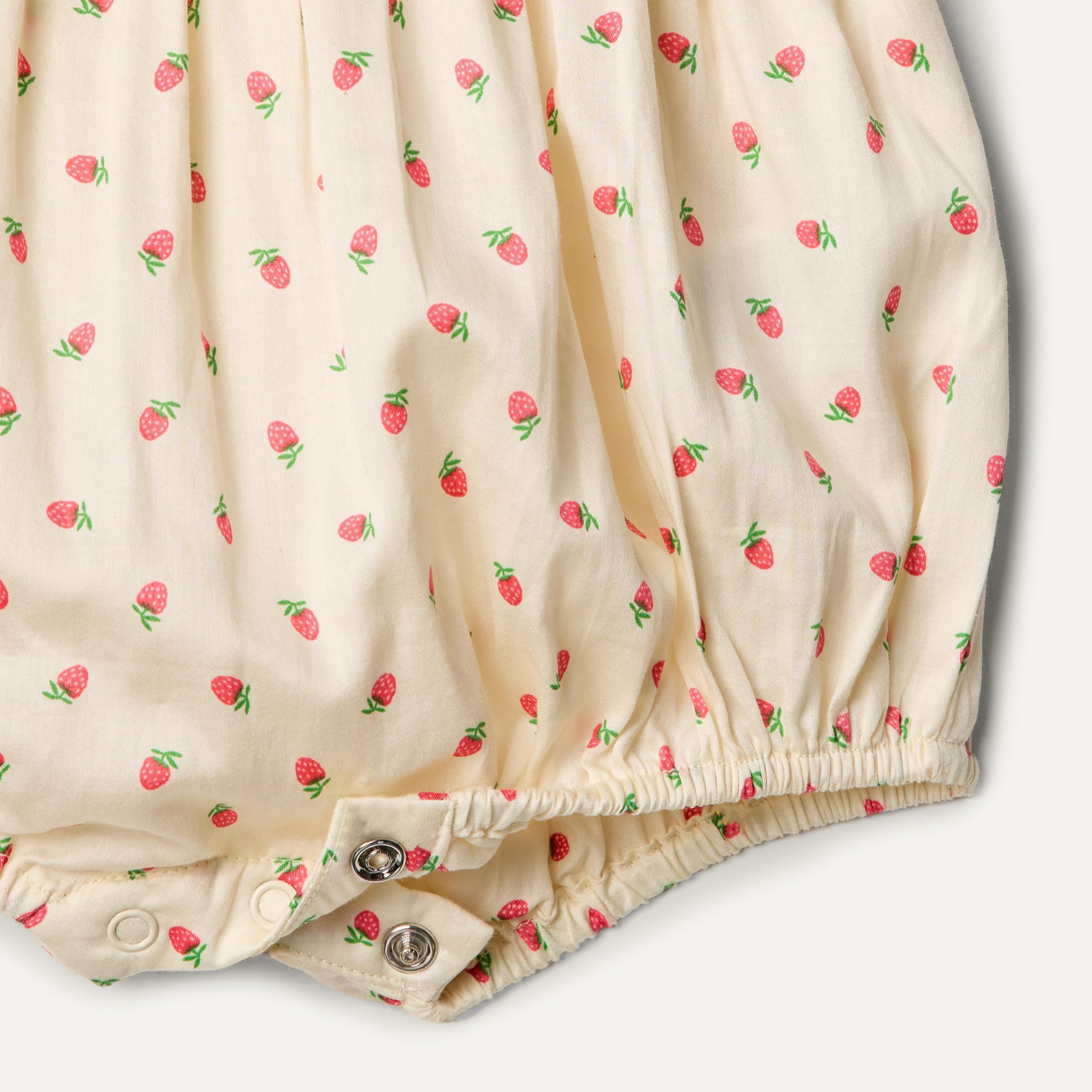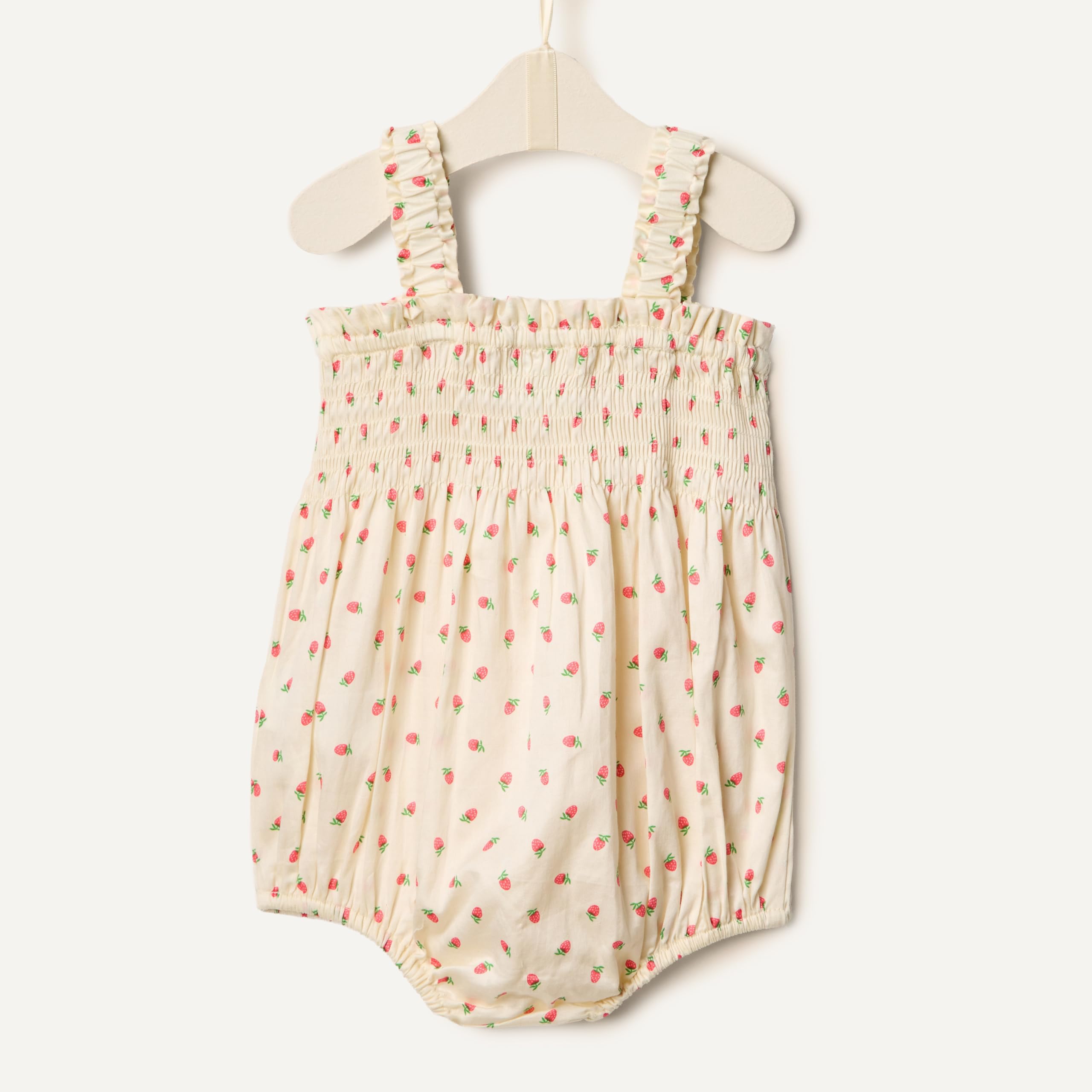 DETAILS: Smocked top with delicate ruffle, wide elastic straps with ruffle-edge detailing, snap inseam for easy on and off, and elasticated leg opening