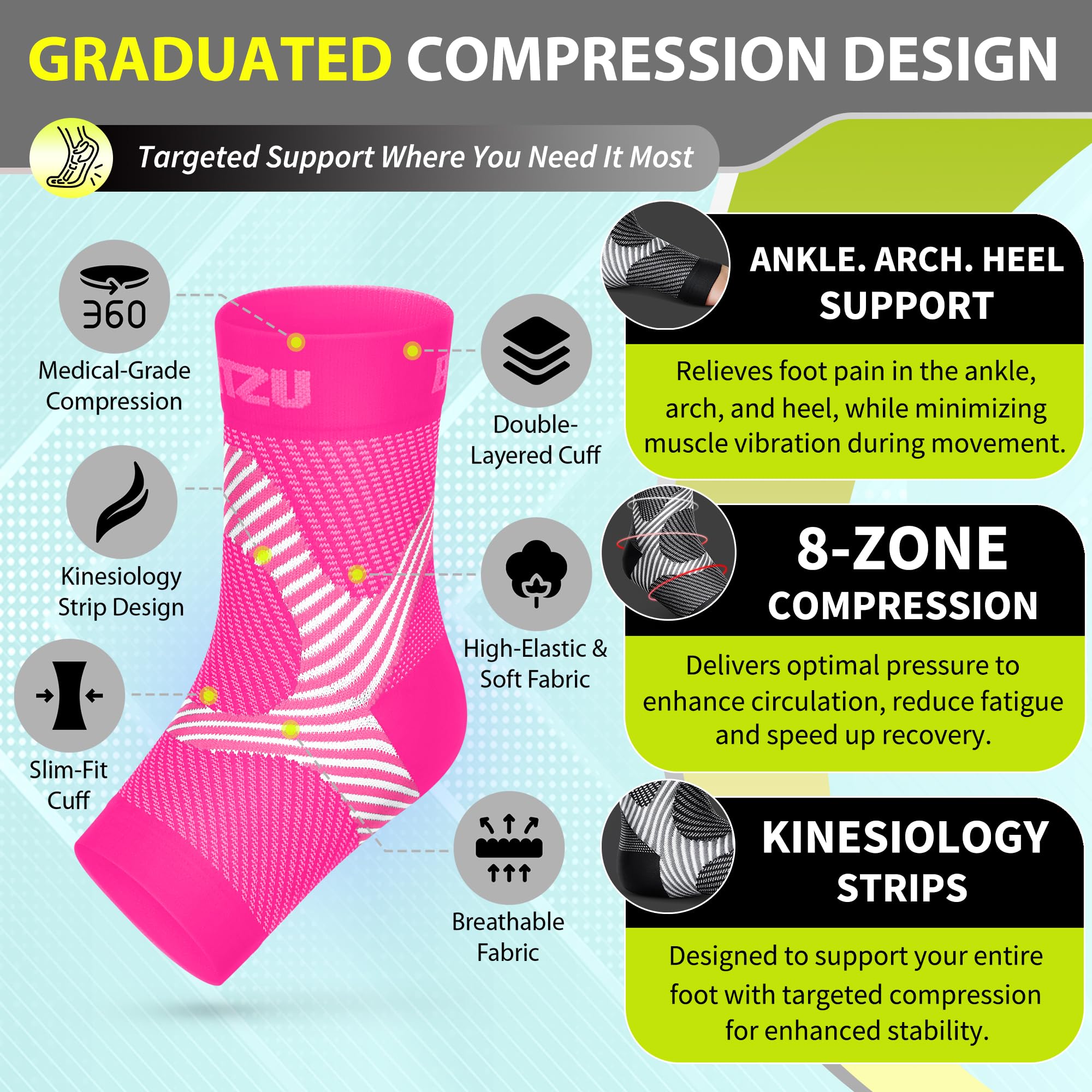 Breathable & Adjustable Ankle Compression: The breathable fabric of our ankle compression socks ensures all-day comfort while promoting healing. Perfect for managing ankle sprain relief, Achilles tendon support, and improving blood circulation.