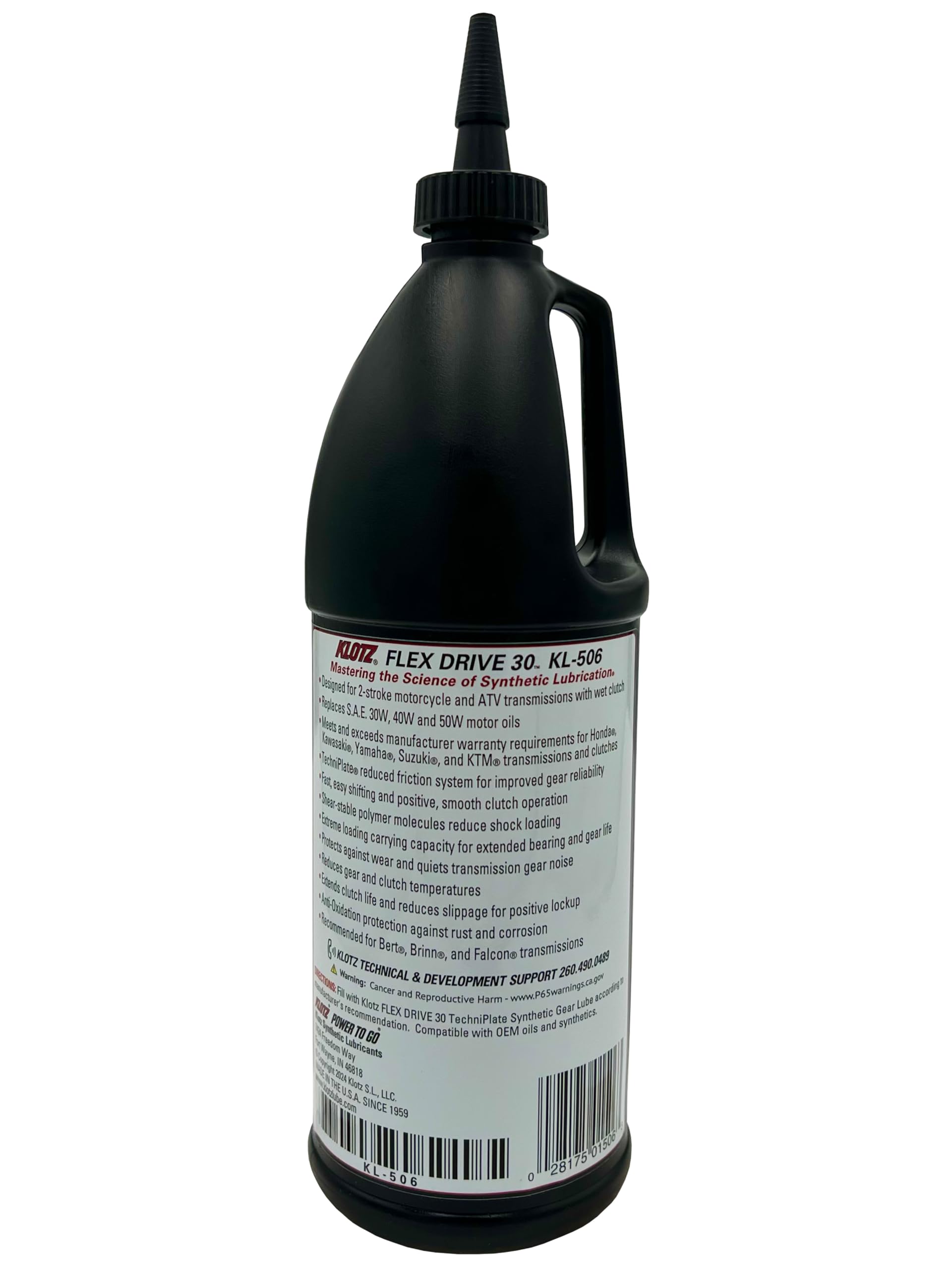 Includes 1 quart (32 ounce) bottle of Klotz KL-506 Flex Drive 30 viscosity 75W-80, recommended for use in 2-cycle motorcycle and ATV transmissions with wet clutch, as well as Bert, Brinn, and Falcon racing transmissions. This lubricant can be used in hardware that requires SAE 30, SAE 40, and SAE 50 viscosity grades.