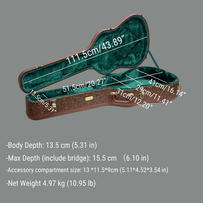 Designed for Gibson Acoustic J45, Martin Dreadnought styles of guitars. Interior Dimensions: Overall length: 43.9 in (111.5 cm); Body length: 20.28 in (51.5 cm); Upper Bout: 12.2 in (31 cm); Waist: 11.42 in (29 cm); Lower bout: 15.94 in (40.5 cm); Body depth: 5.3 in (13.5 cm); Body depth (include bridge):6.1 in (15.5 cm); Itme Size : 46'' x 18.19'' x6.97'' Itme Weight : 10.9 lb Package Includes: (1) 2 Keys (2) 2 Pieces of Removable Padding for Custom Fit (3) A Crossrock Wood Case